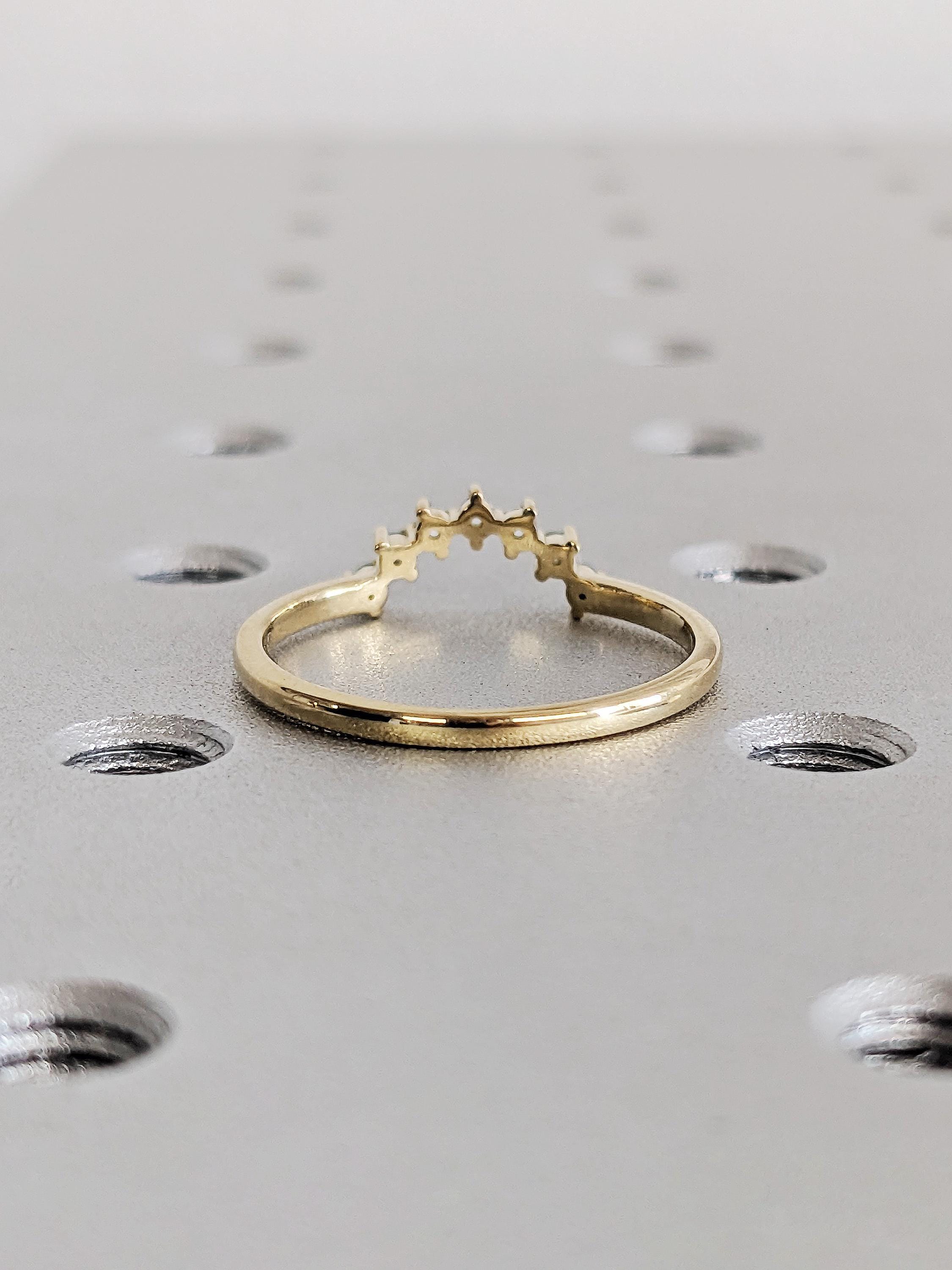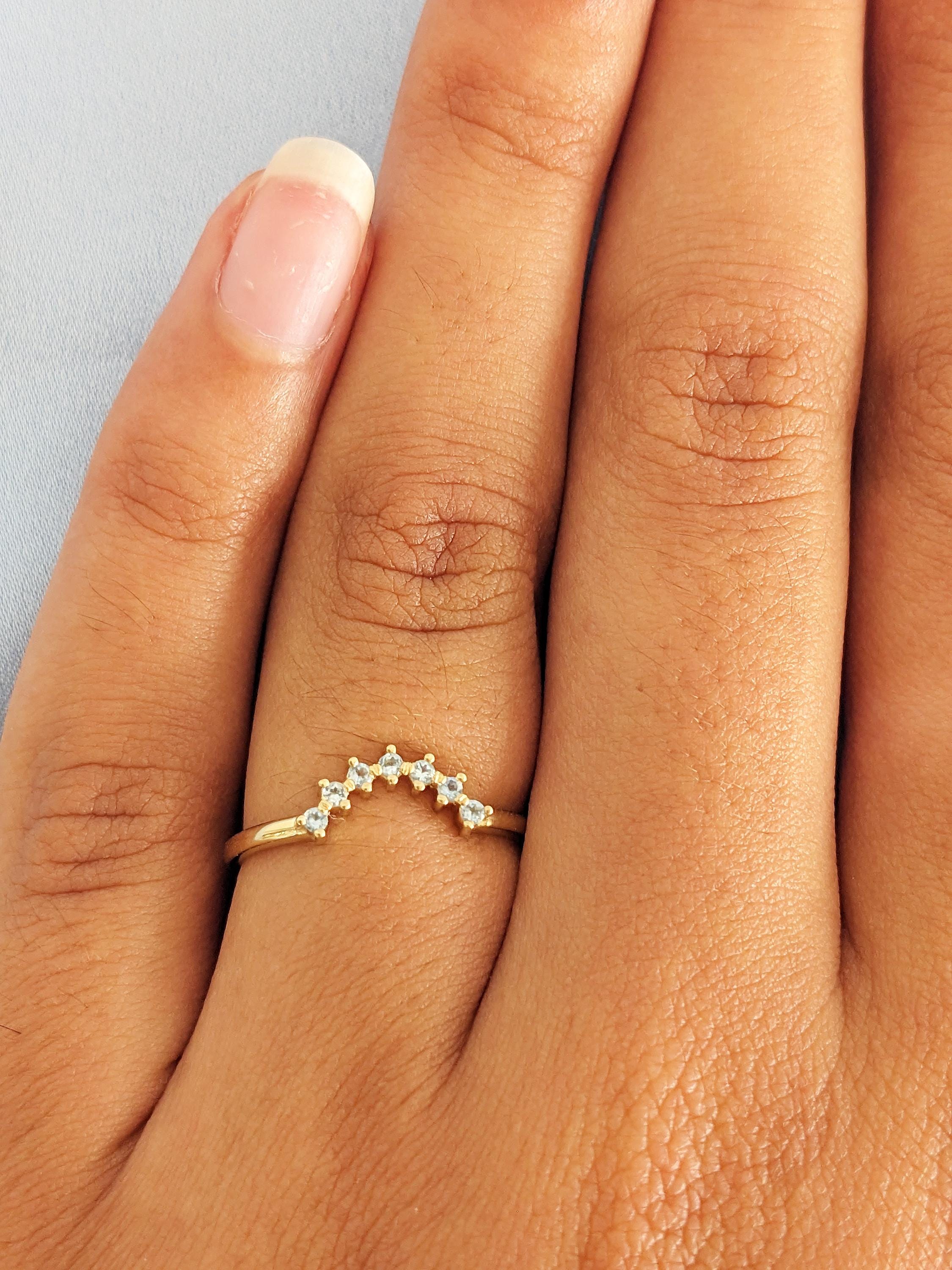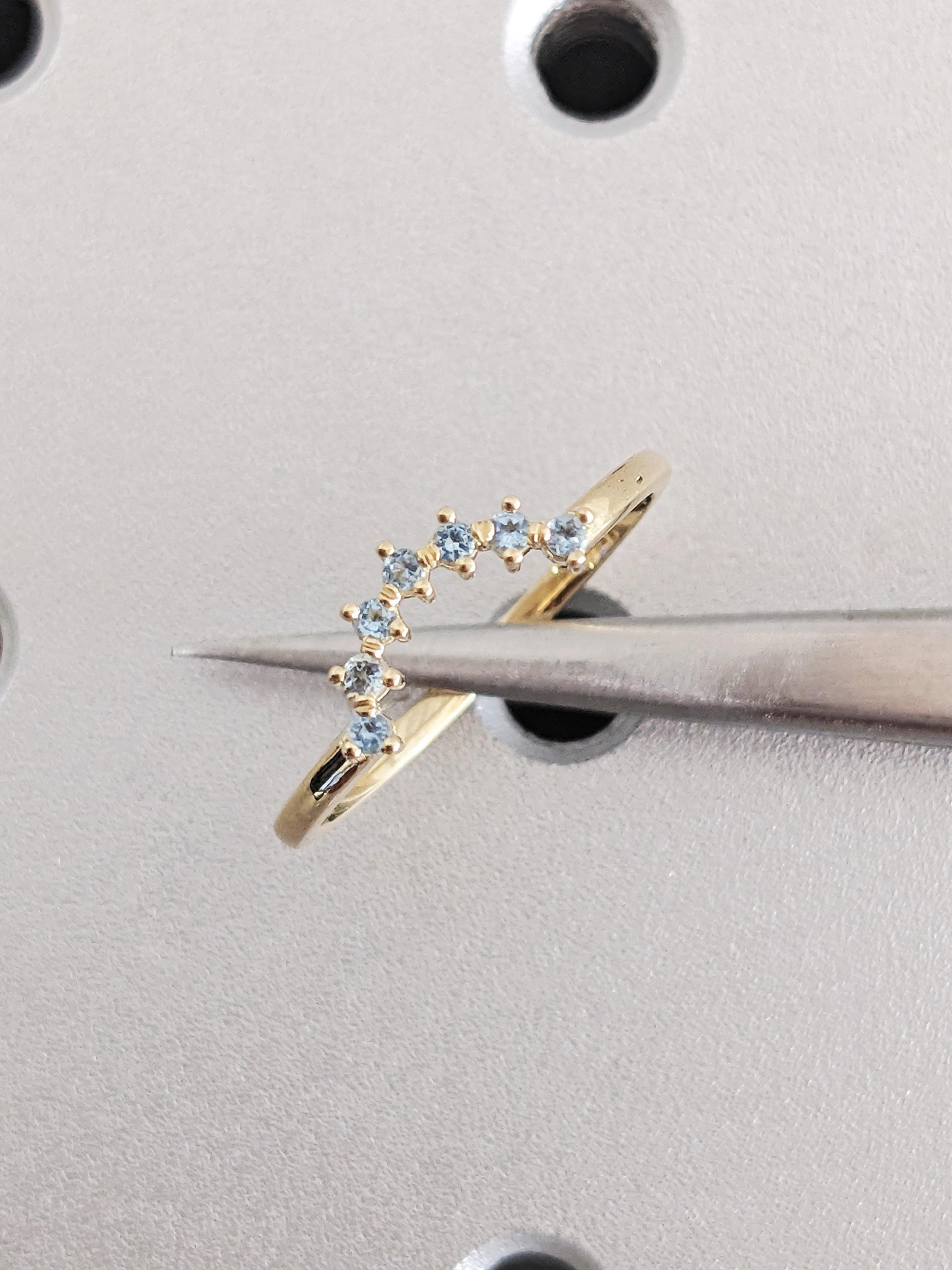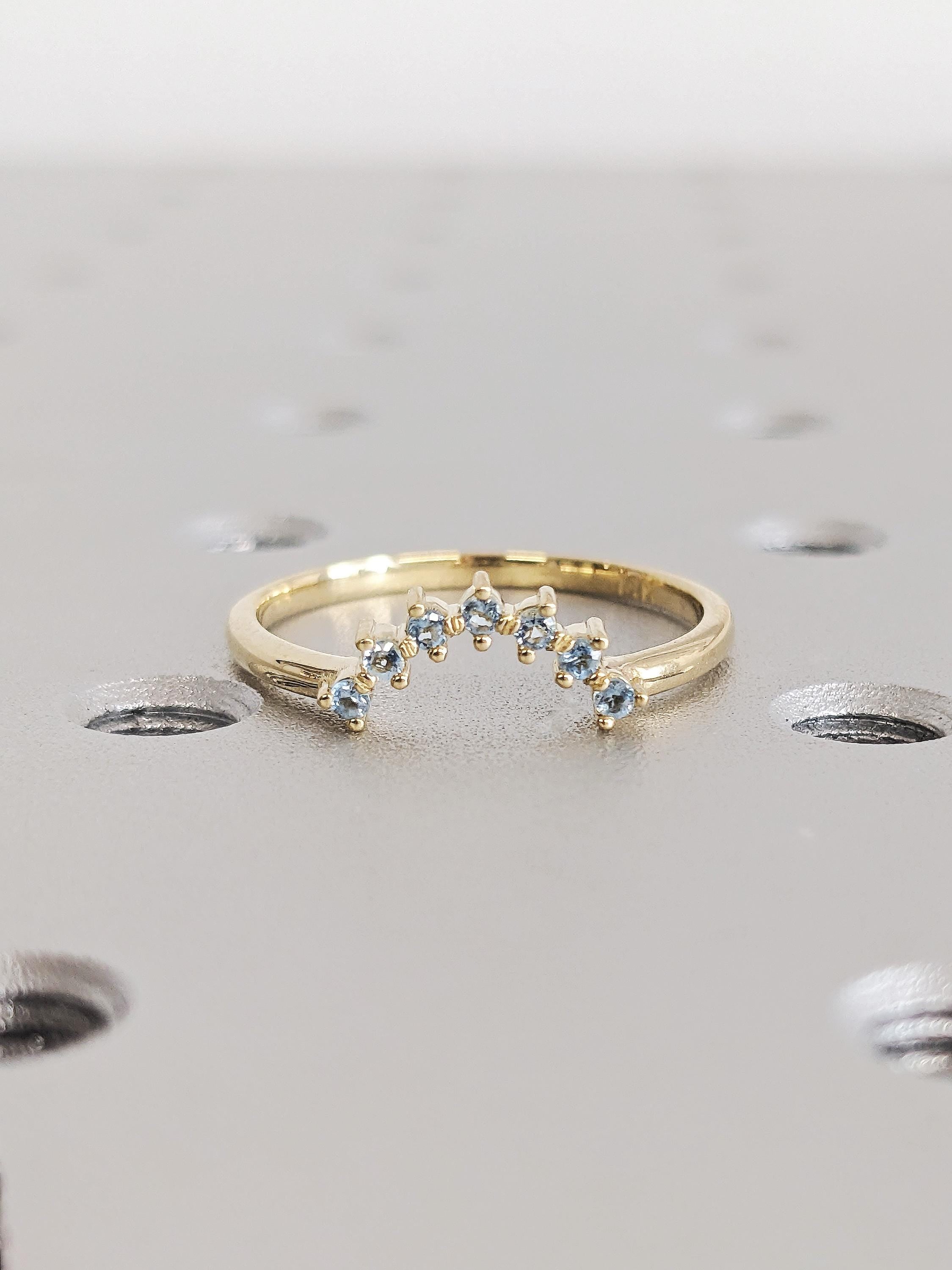 This curved aquamarine wedding band features a graceful arched design adorned with round cut Aquamarine stones that shimmer beautifully from every angle. Perfect for stacking with an engagement ring or wearing alone, it adds a soft touch of color and elegance to any bridal set.