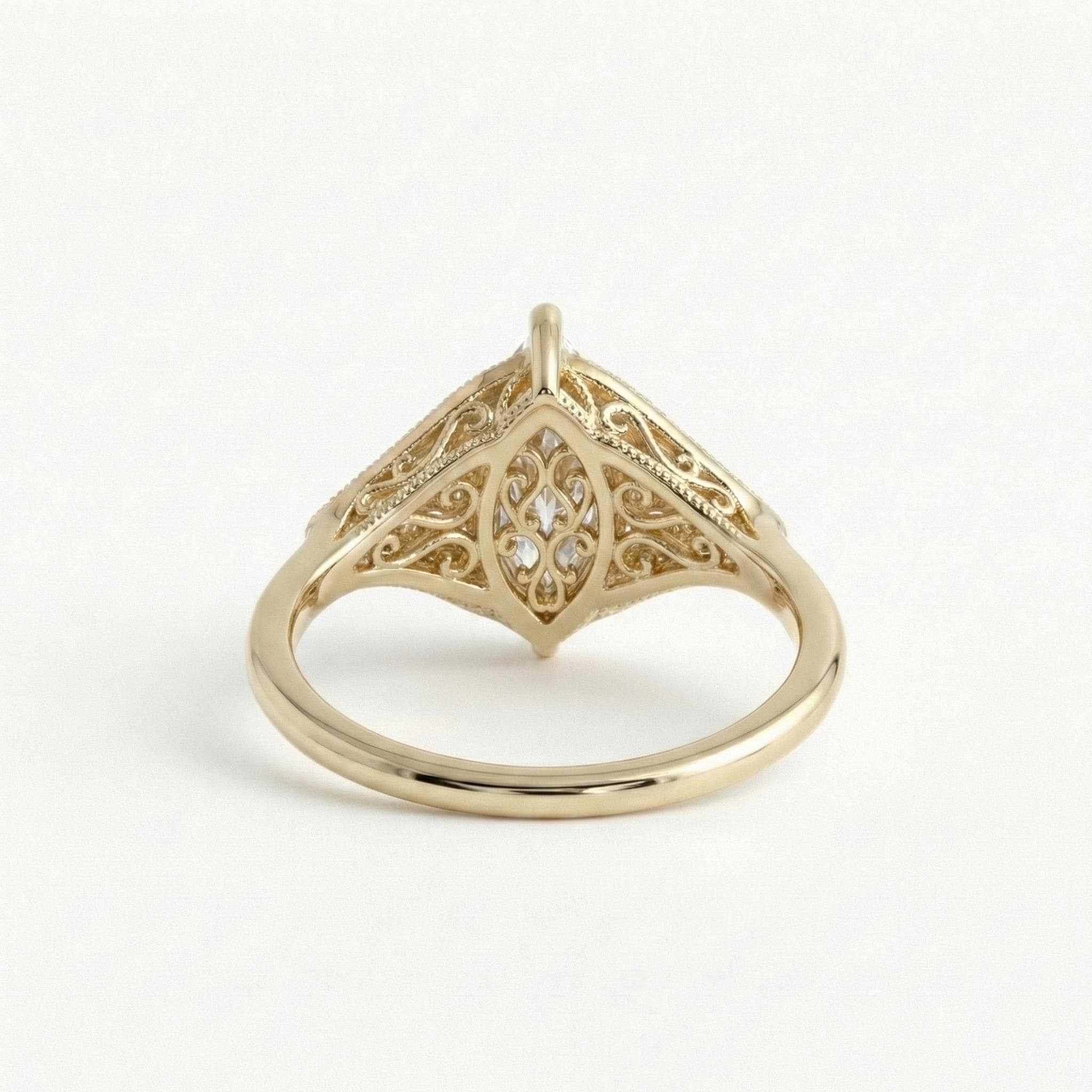 Gold Heirloom Lab Diamond Engagement Ring, Marquise Cut Victorian Filigree Band, Antique Proposal Ring, Women's Wedding Anniversary Ring