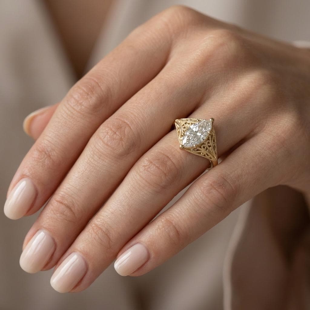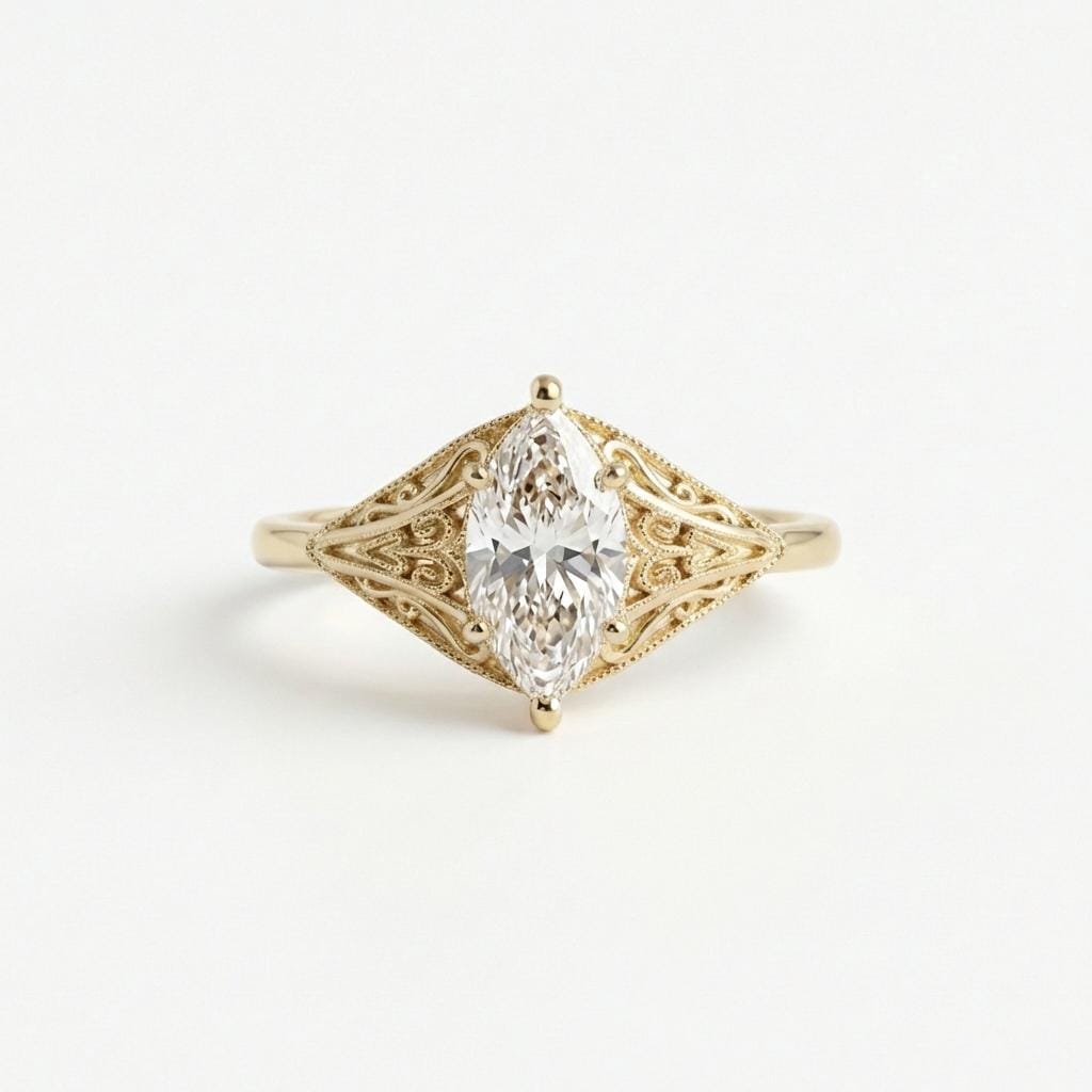 This ring features a marquise cut Lab Diamond set in a classic prong setting, drawing attention to its elegant, elongated shape. Delicate filigree detailing along the band adds vintage-inspired charm and fine craftsmanship, creating a balanced and refined look. A timeless design ideal for engagements or meaningful milestones, blending classic beauty with subtle antique character.