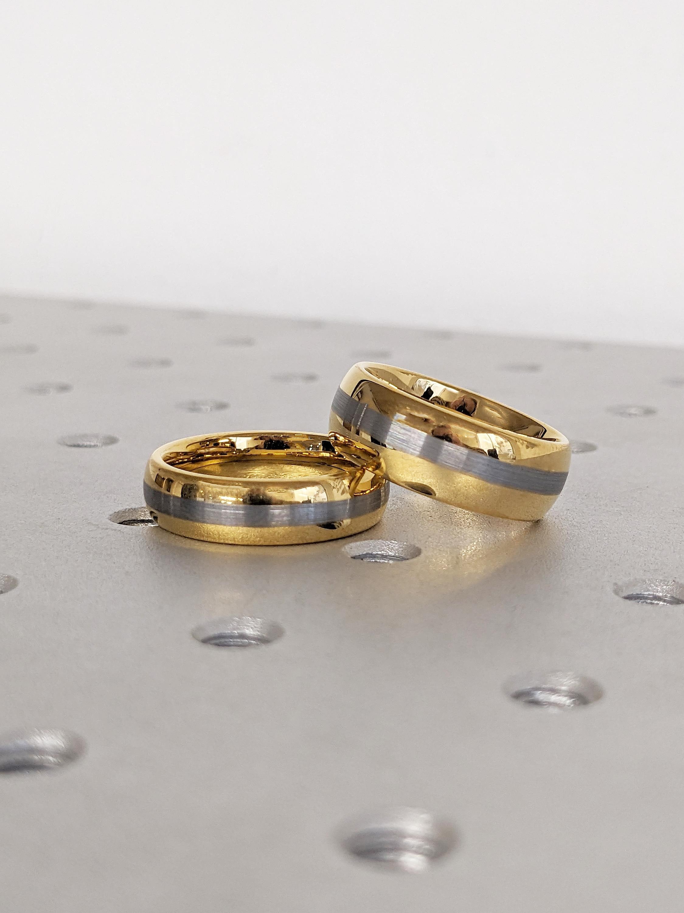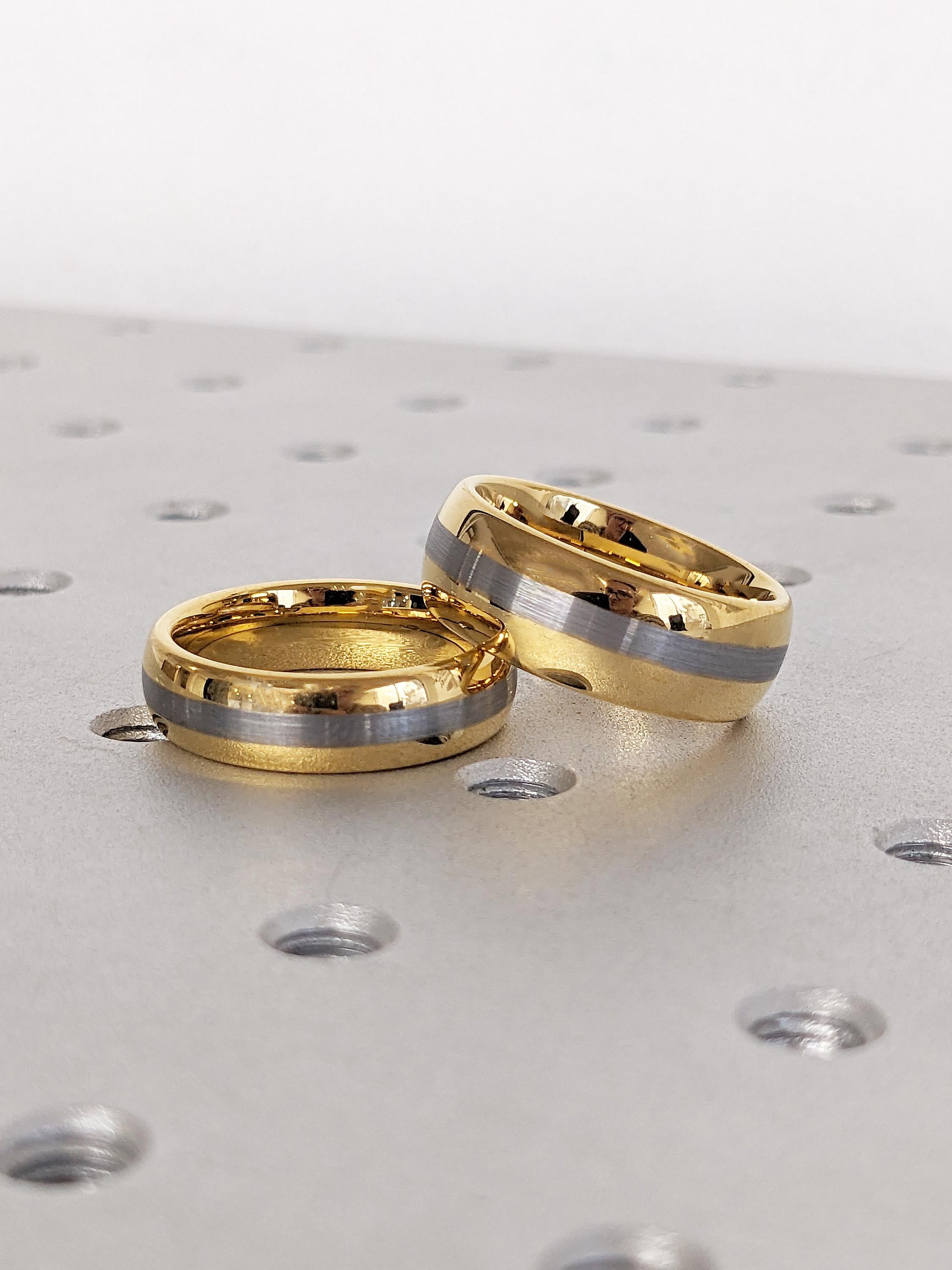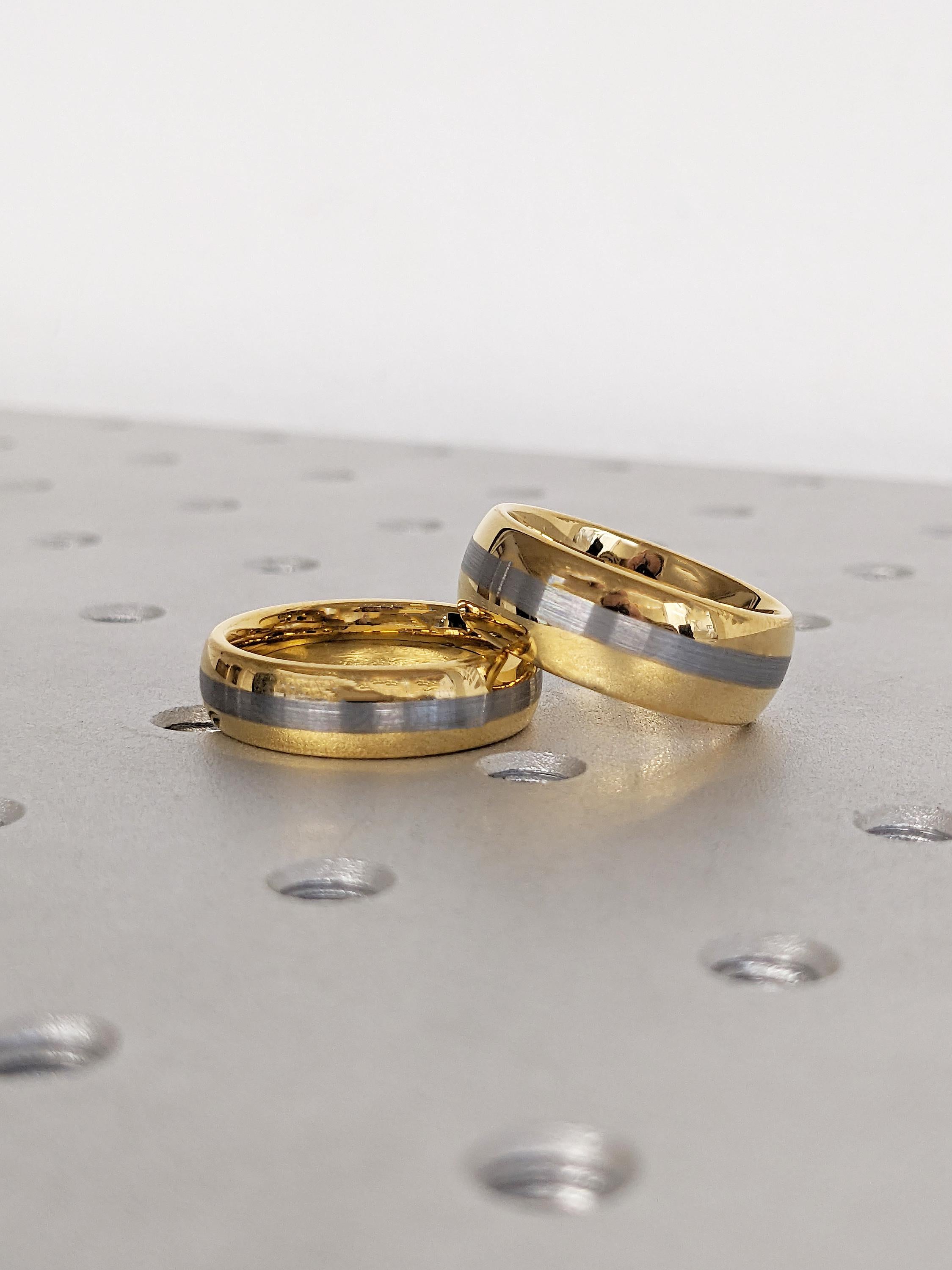 This 6mm and 8mm matching wedding band set is crafted from durable tungsten, featuring a polished yellow gold finish with a brushed natural center. Designed with classic domed profiles, the set offers a refined, modern look that’s perfect for everyday wear and special occasions.