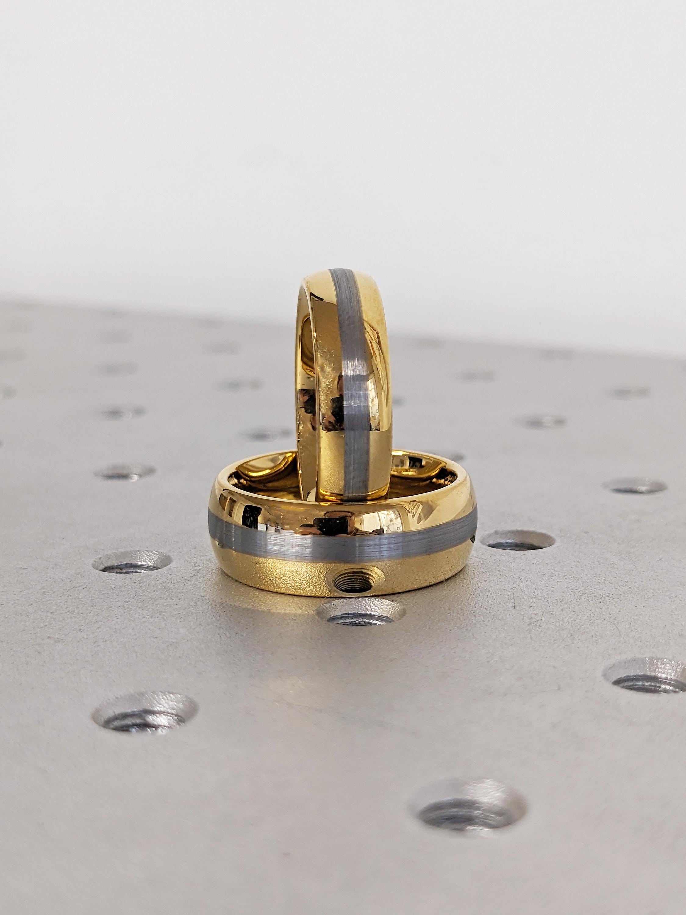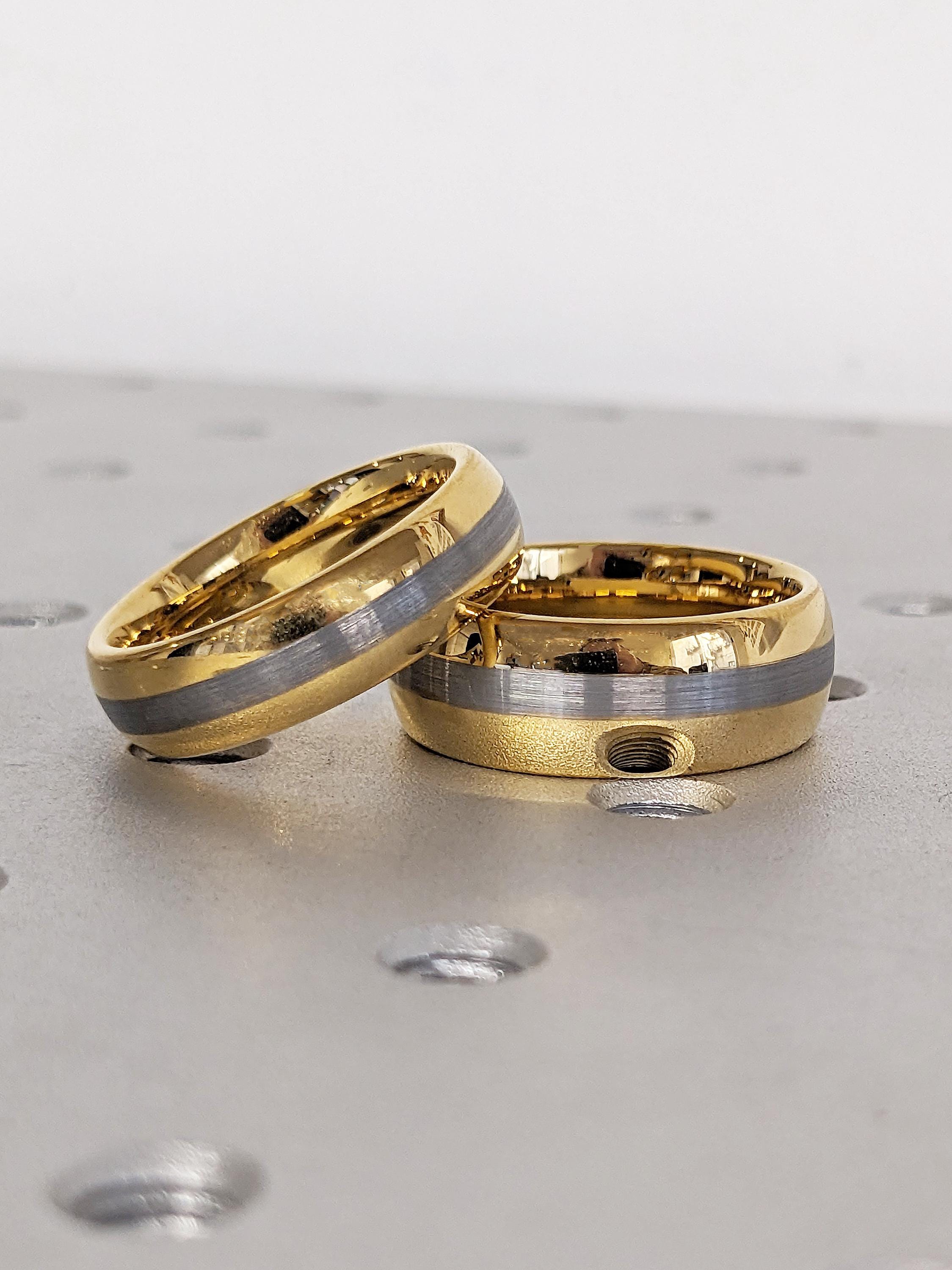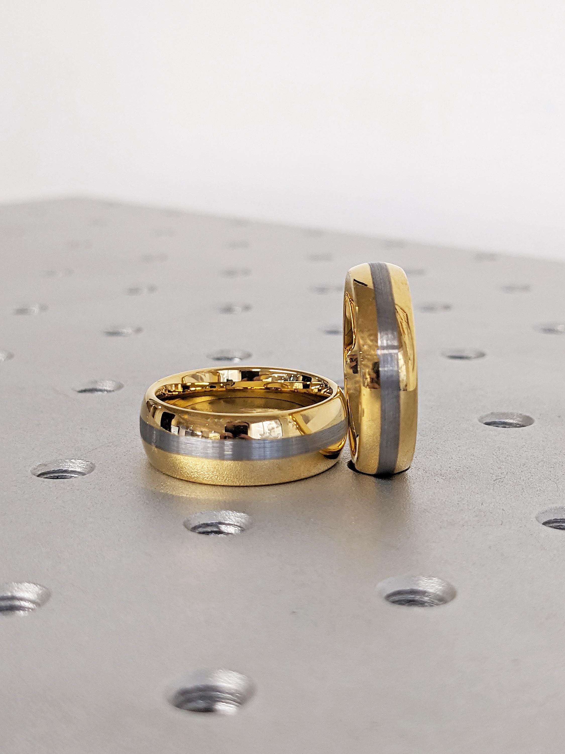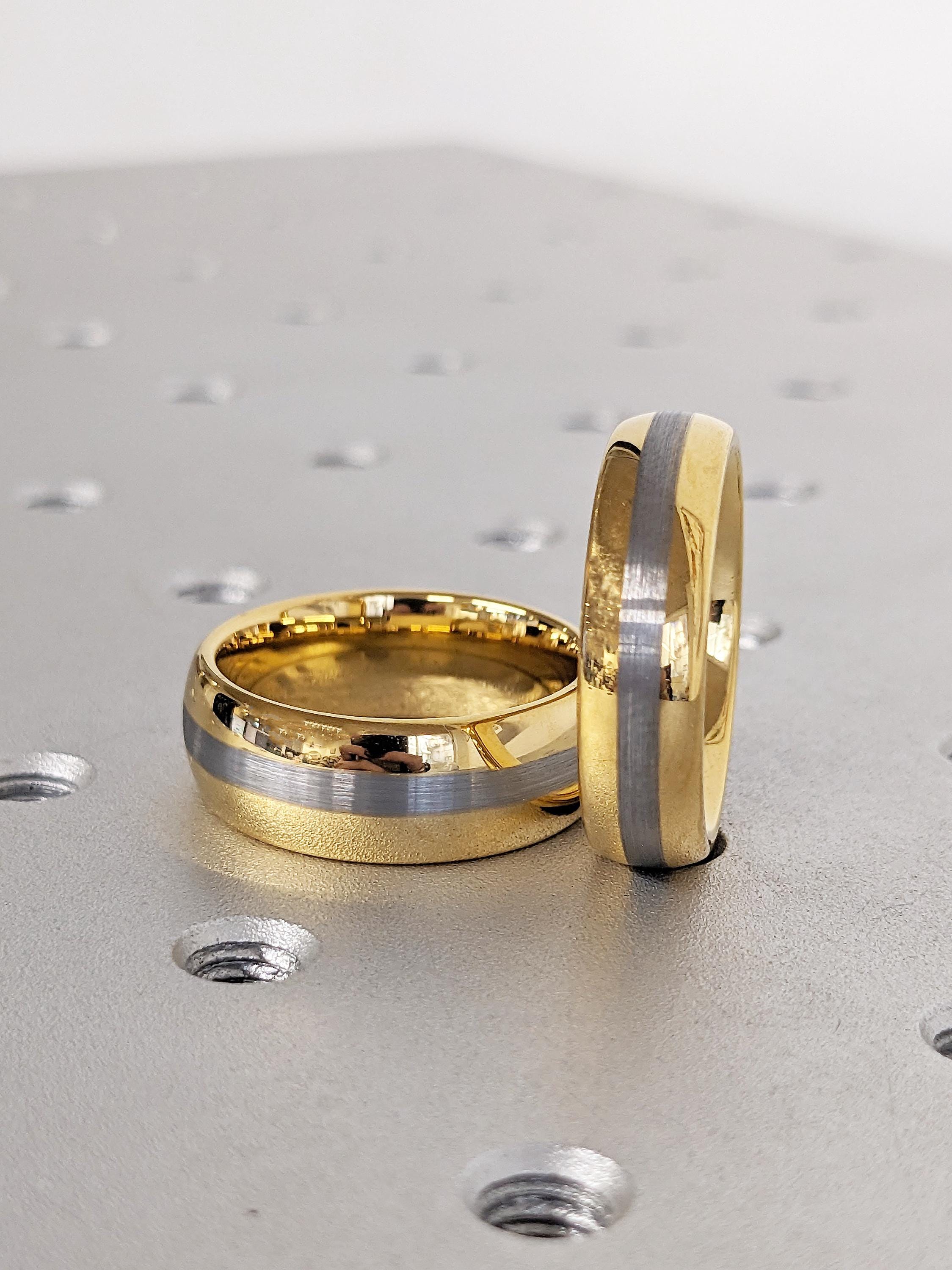 This 6mm and 8mm matching wedding band set is crafted from durable tungsten, featuring a polished yellow gold finish with a brushed natural center. Designed with classic domed profiles, the set offers a refined, modern look that’s perfect for everyday wear and special occasions.