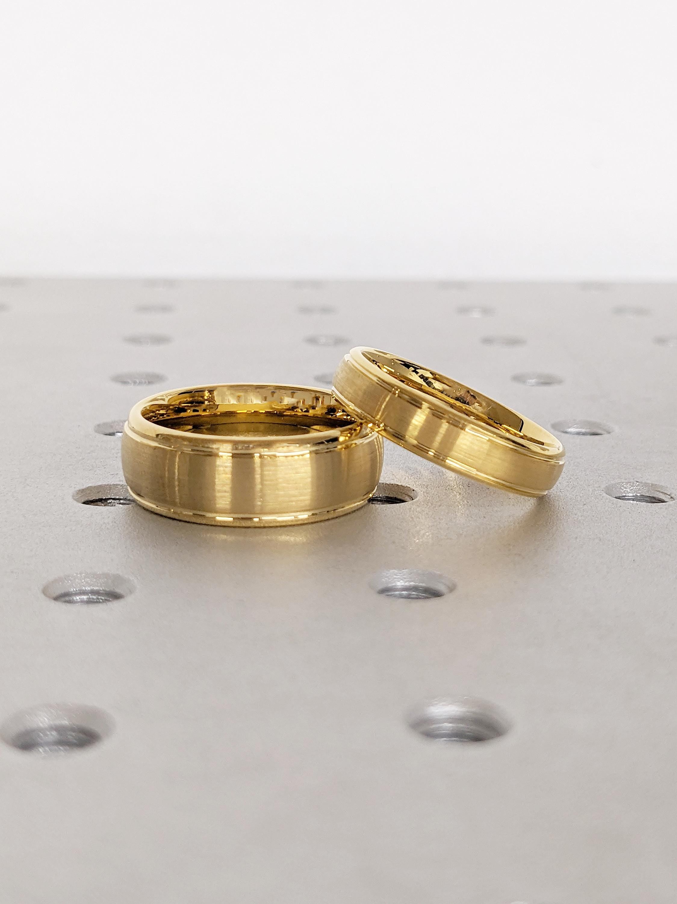 This wedding band set includes 5mm and 8mm dome rings crafted from durable tungsten with a brushed yellow gold plated finish. The soft matte texture and rounded profile offer a modern appeal, making them an elegant choice for couples who value both style and durability.