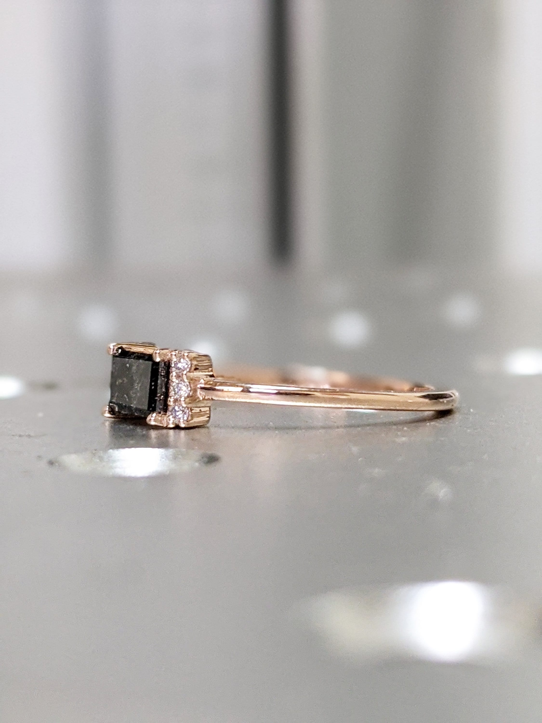 A cluster of 6 round brilliant cut diamonds, with brilliant sparkle and luster, accompany the center salt and pepper diamond, with a baguette/emerald cut, that gives a strong presence of vintage scent. This beautiful ring is made to order from hand selected and cut