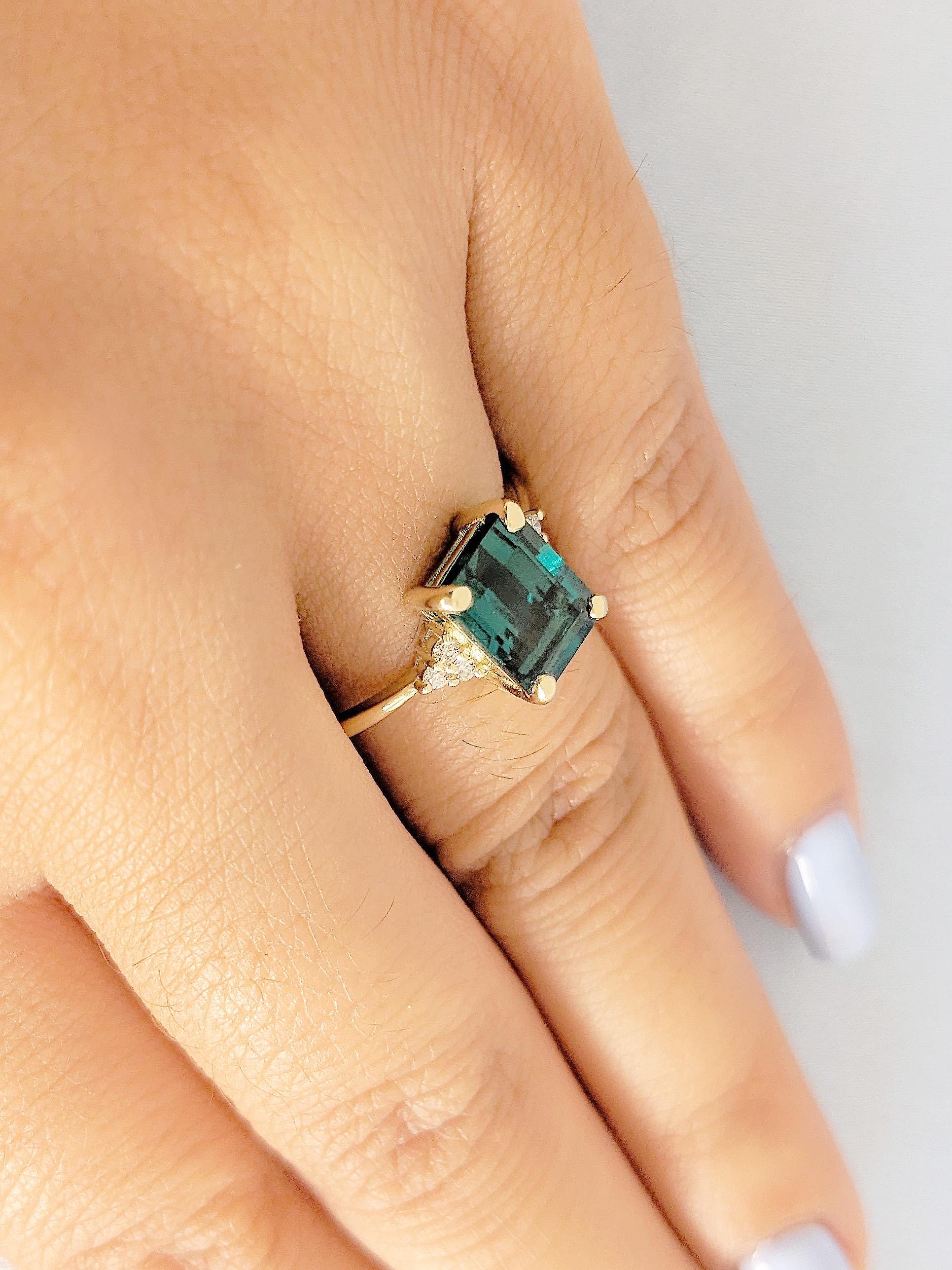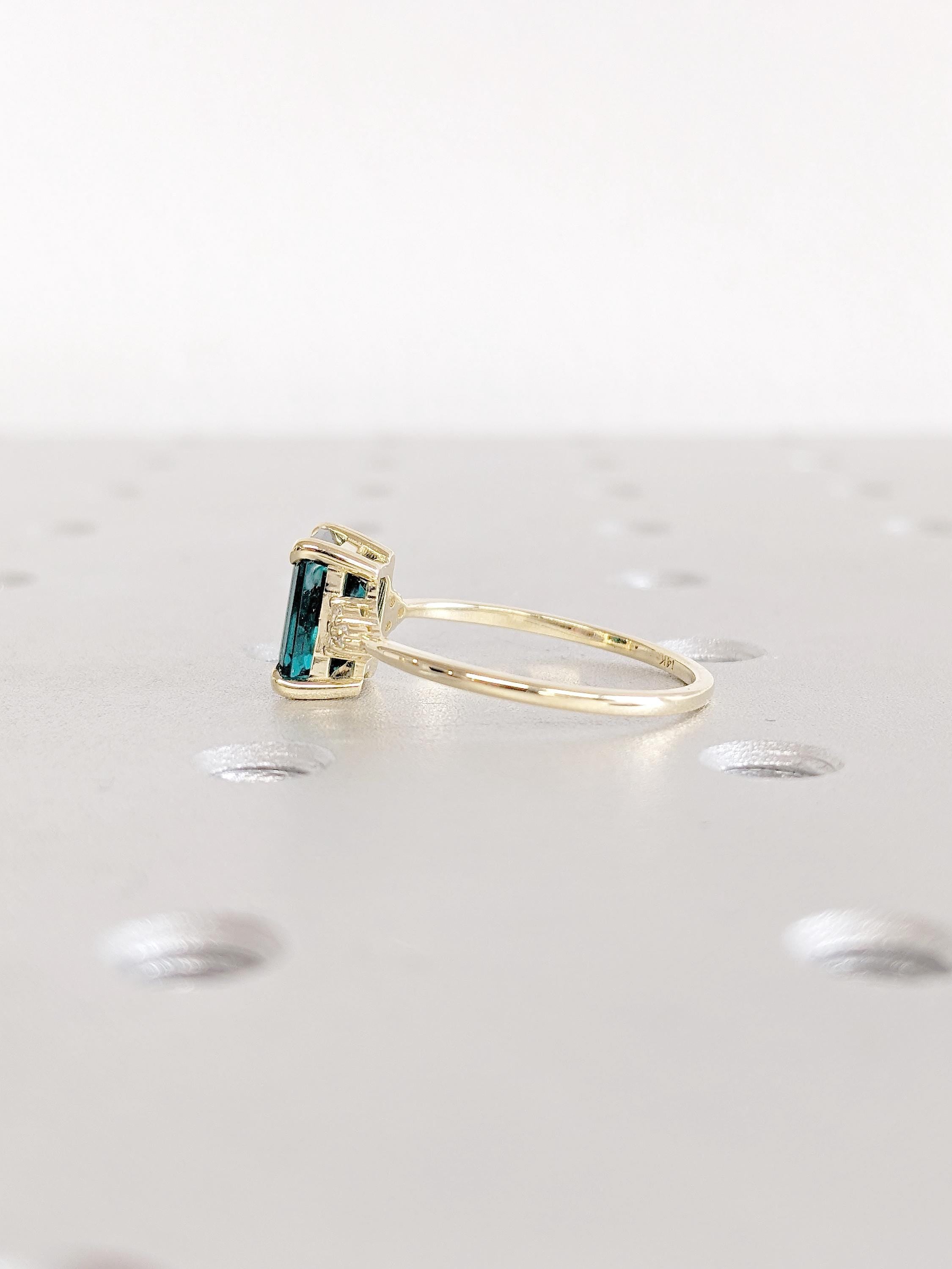 Green Emerald Cut Lab Sapphire Ring, 14K Yellow Gold Diamond Accent Engagement Ring, Dainty Promise Ring, Anniversary Jewelry, Wedding Ring