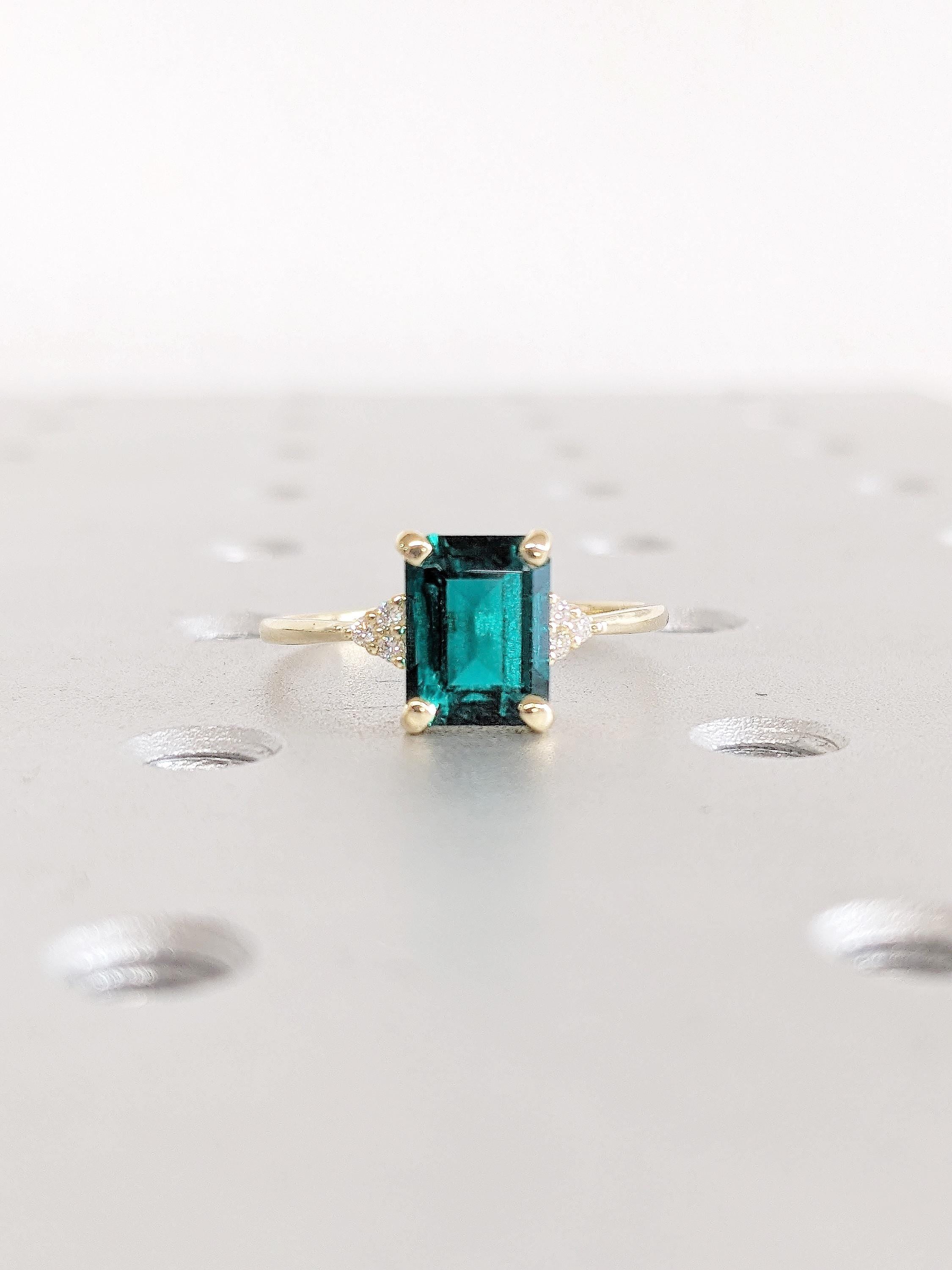 This elegant ring features a vibrant green emerald cut Lab Sapphire as the centerpiece, prong set to showcase its rich color and sleek geometry. Delicate round side stones in Natural Diamond, Lab Grown Diamond, or Moissanite add a refined sparkle on each side, enhancing its modern yet timeless appeal. The slim gold band offers a graceful finish, making this ring a beautiful choice as an engagement ring, promise ring, or anniversary piece. With its clean lines and sophisticated style, it’s a versatile piece of jewelry that balances bold color with classic brilliance