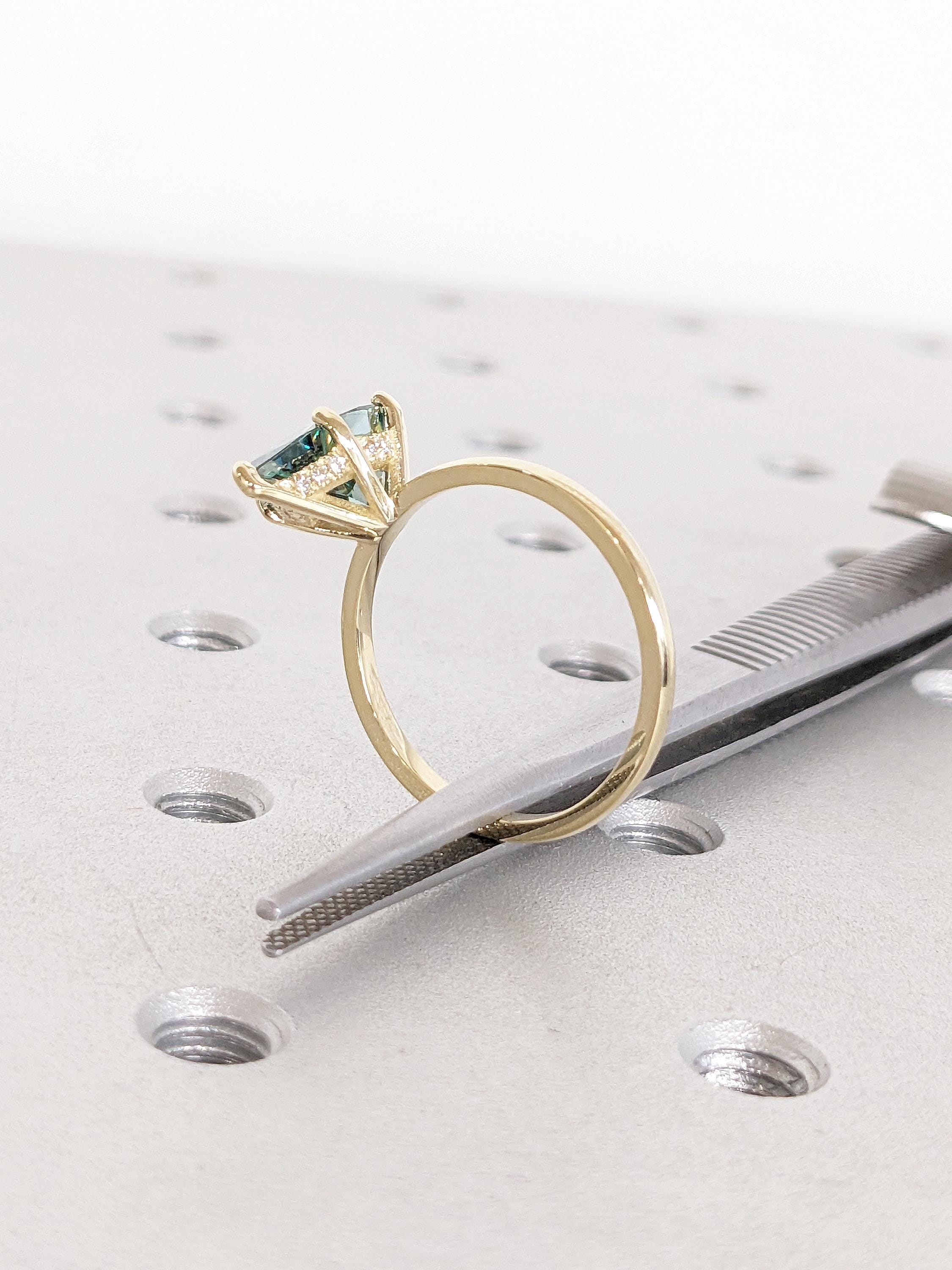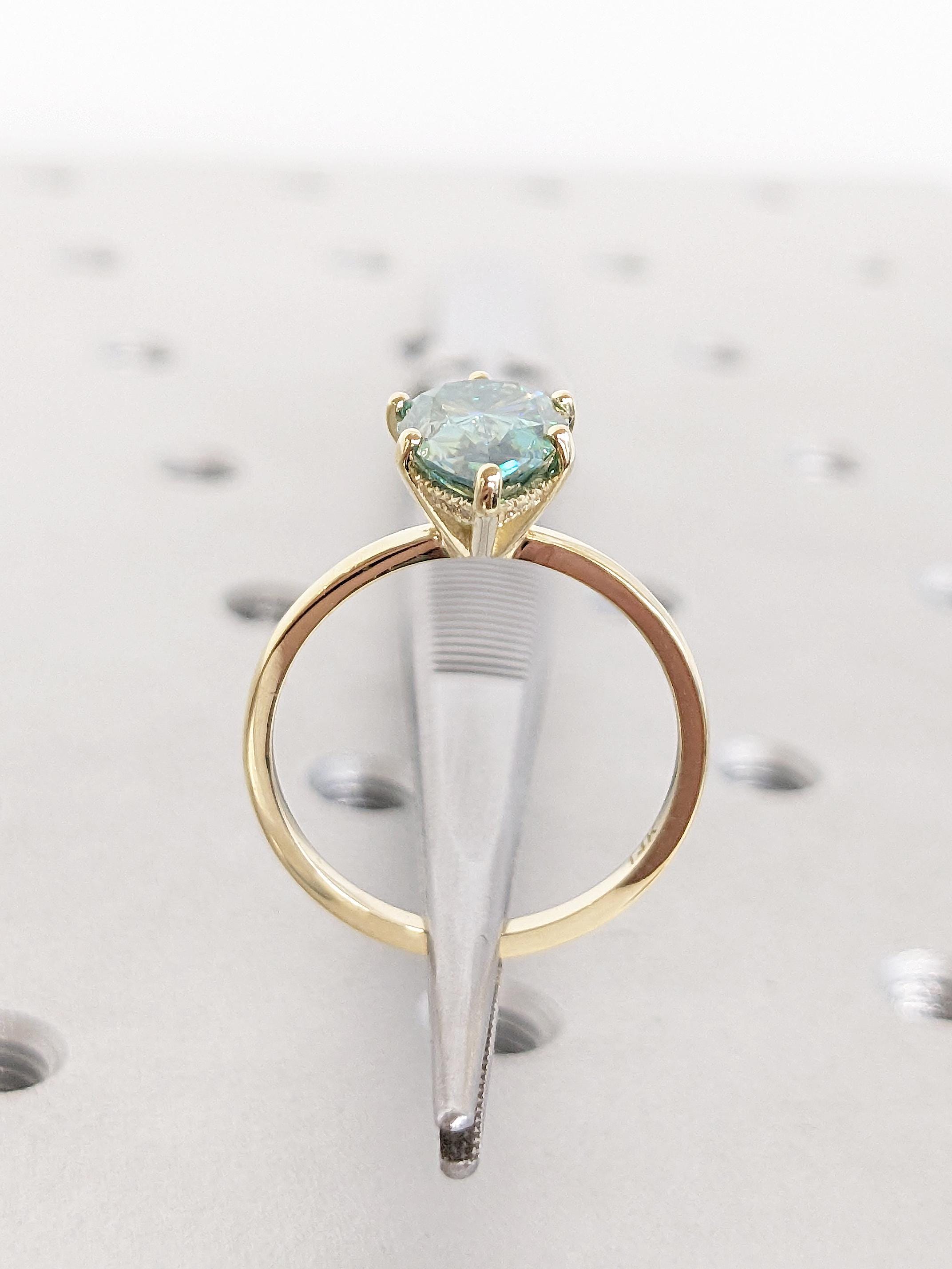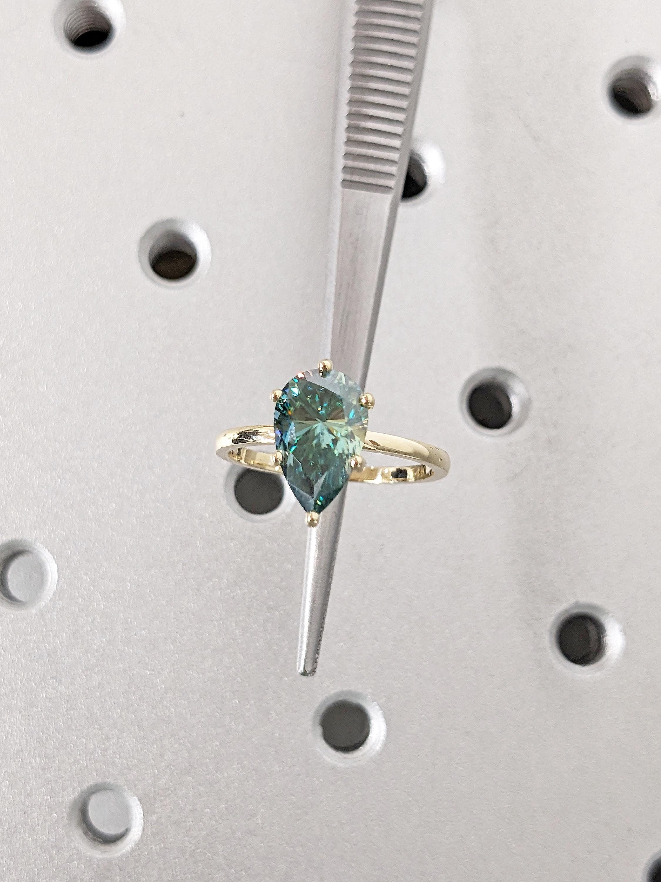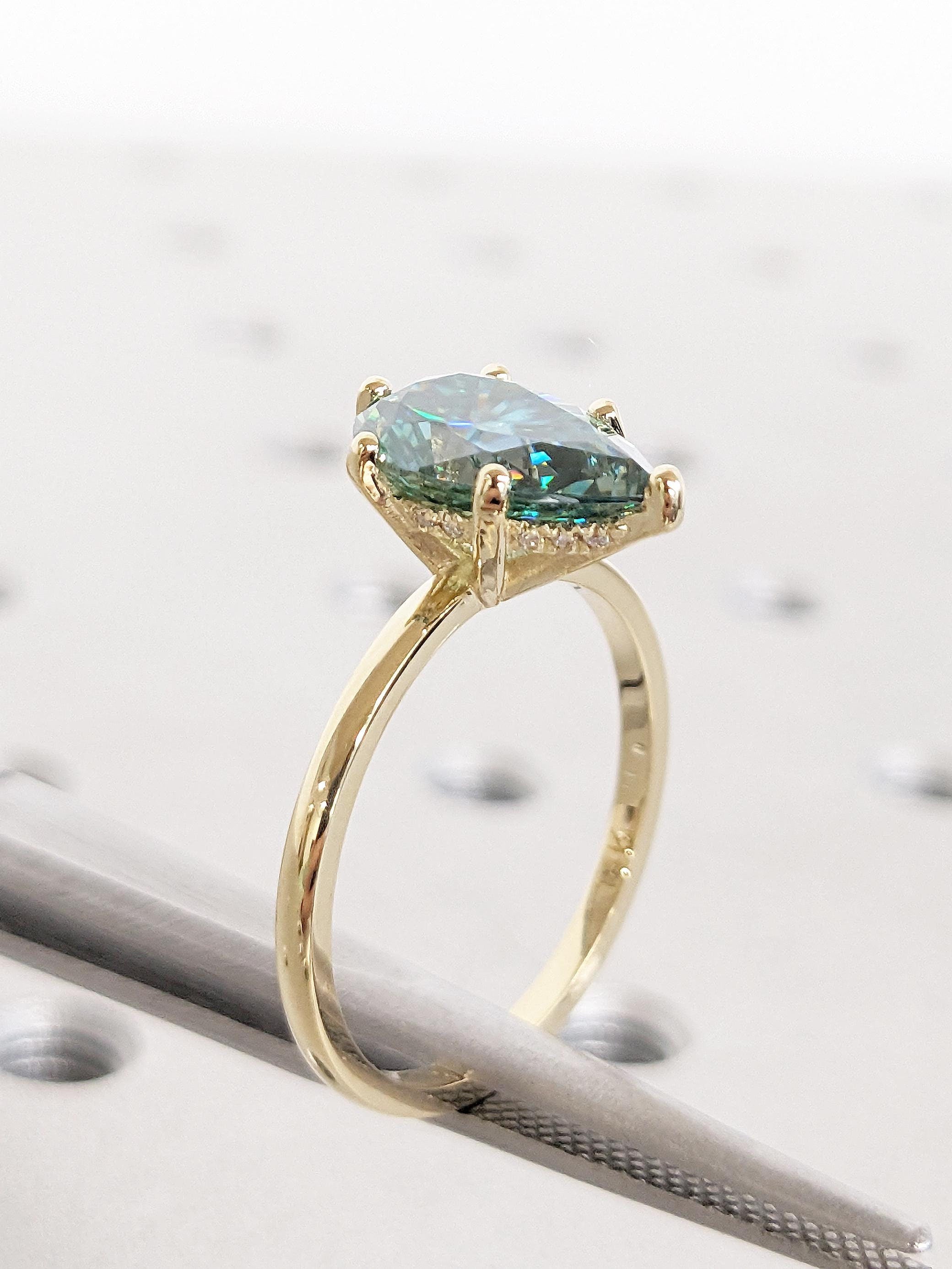 This ring showcases a stunning pear-shaped Green Moissanite in a delicate, thin setting, complemented by a hidden halo of pave Natural Diamonds, Lab Grown Diamonds or Moissanites on a sleek gold band. Elegant and handcrafted, it’s a timeless addition to any jewelry collection.