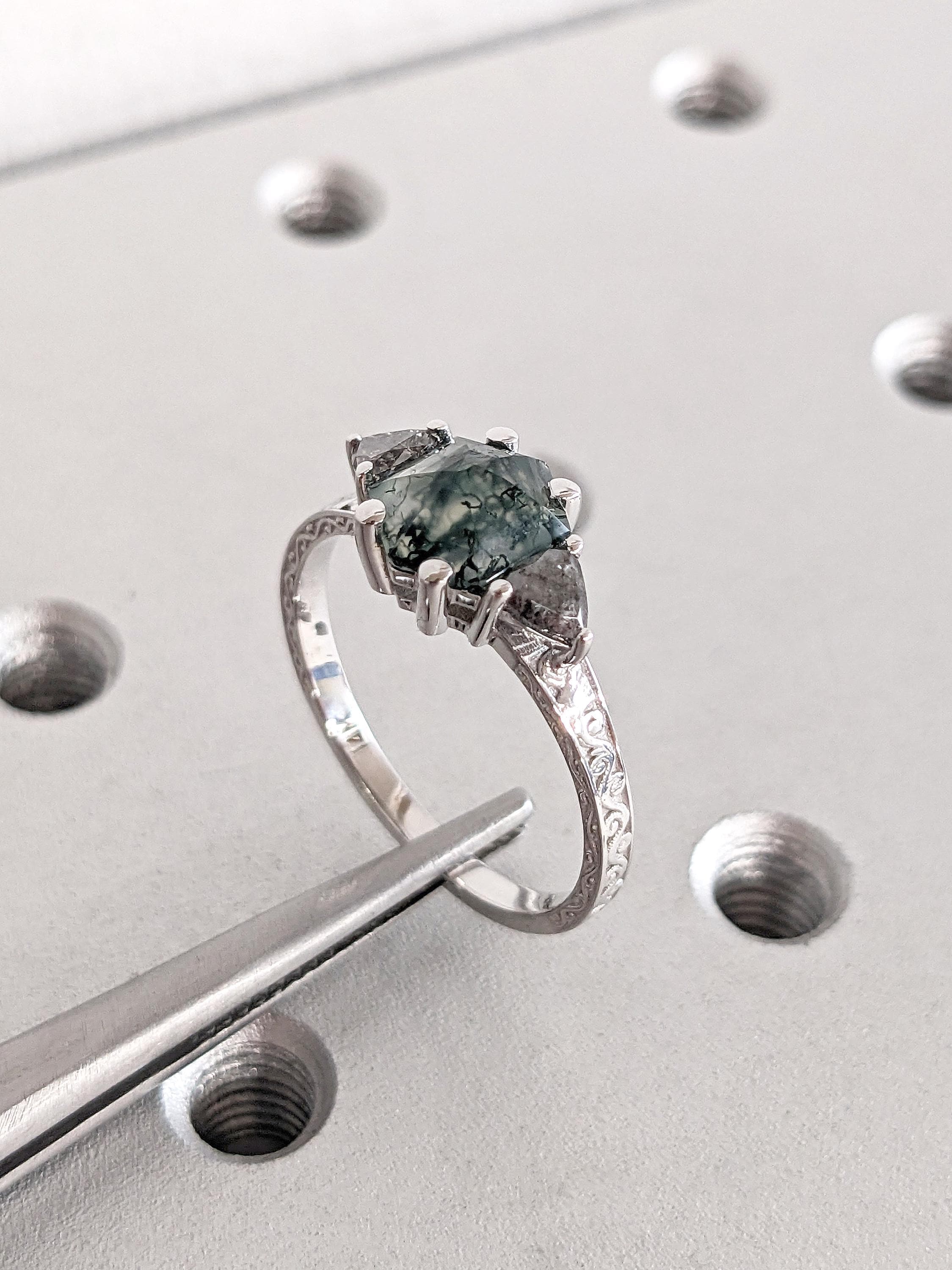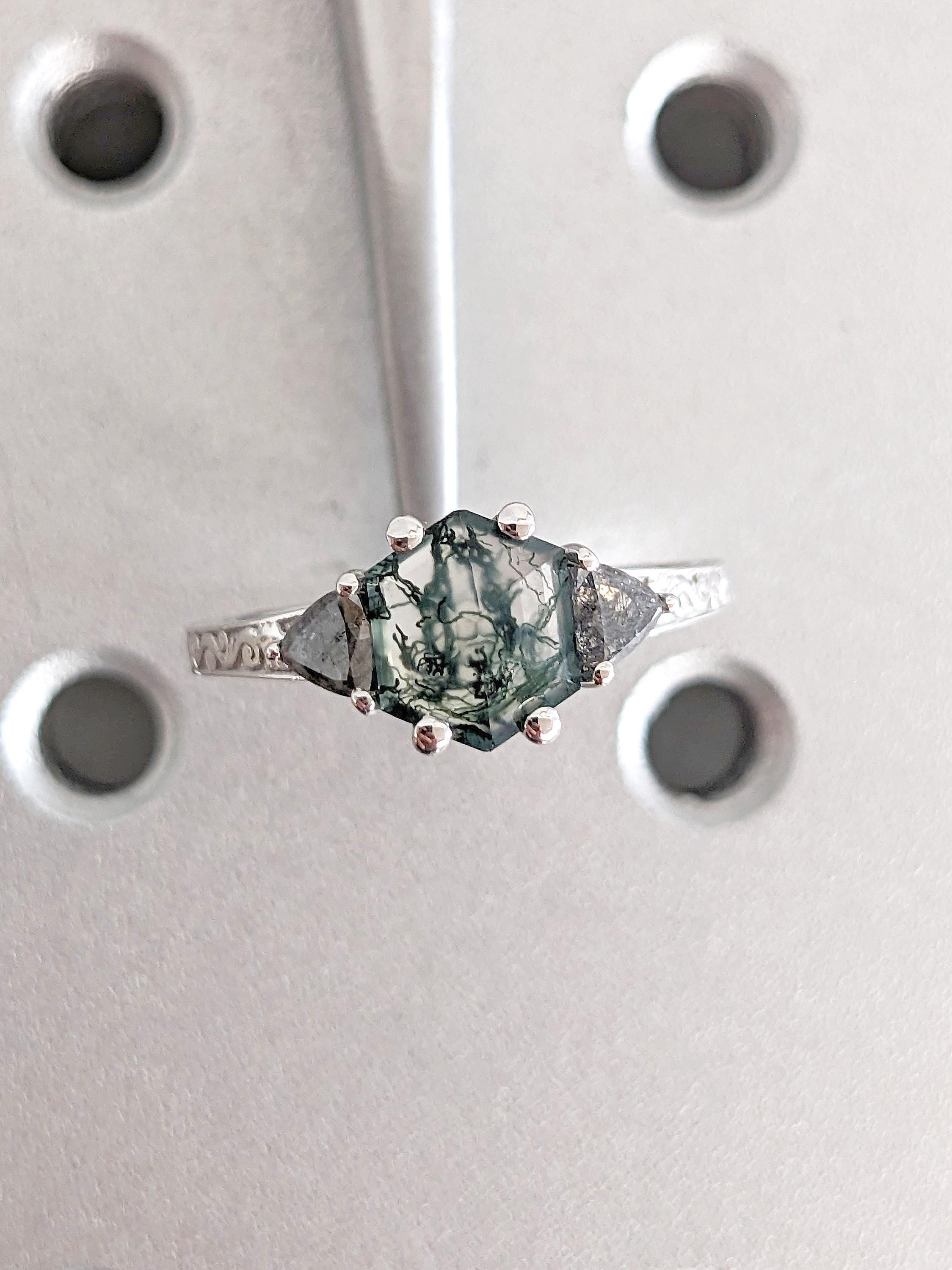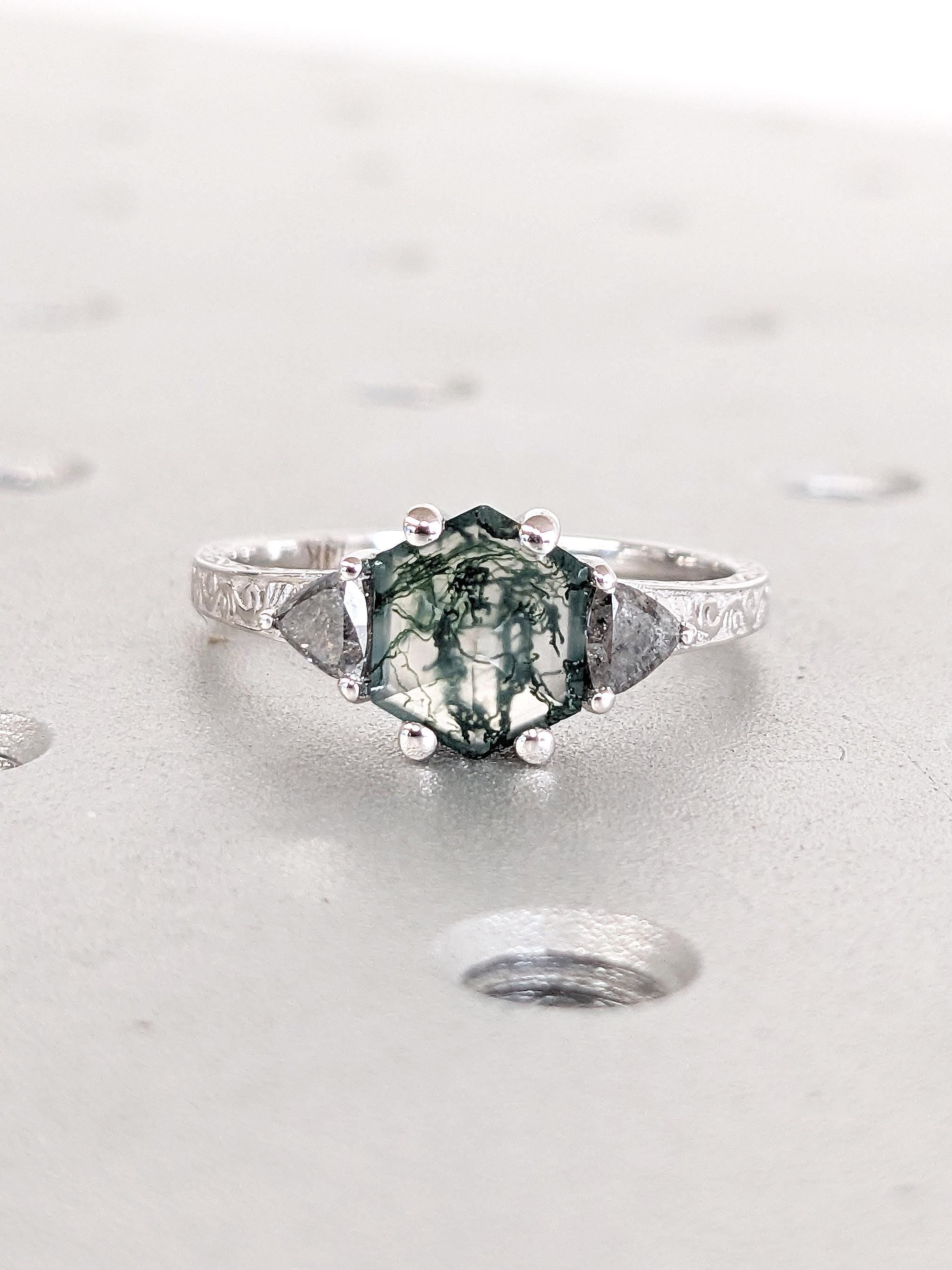 A geometrical beauty, this handmade ring, features a hexagon cut Moss Agate focal stone, accented by a pair of trillion cut Salt and Pepper Diamond side stones. With an intricate filigree engraving on its band of 3mm width and a unique inclusion from the center stone, this exquisite ring exudes both vintage charm and forestry vibe.