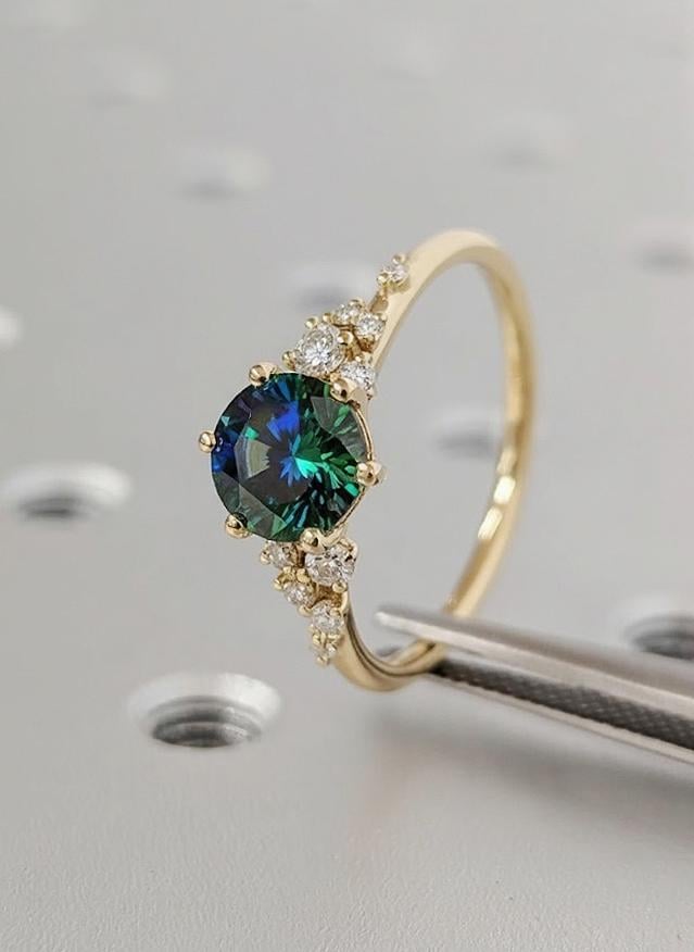Green Peacock Sapphire Snowdrift Engagement Ring, 18K Gold Cluster Diamond Wedding Ring, Libra Birthstone