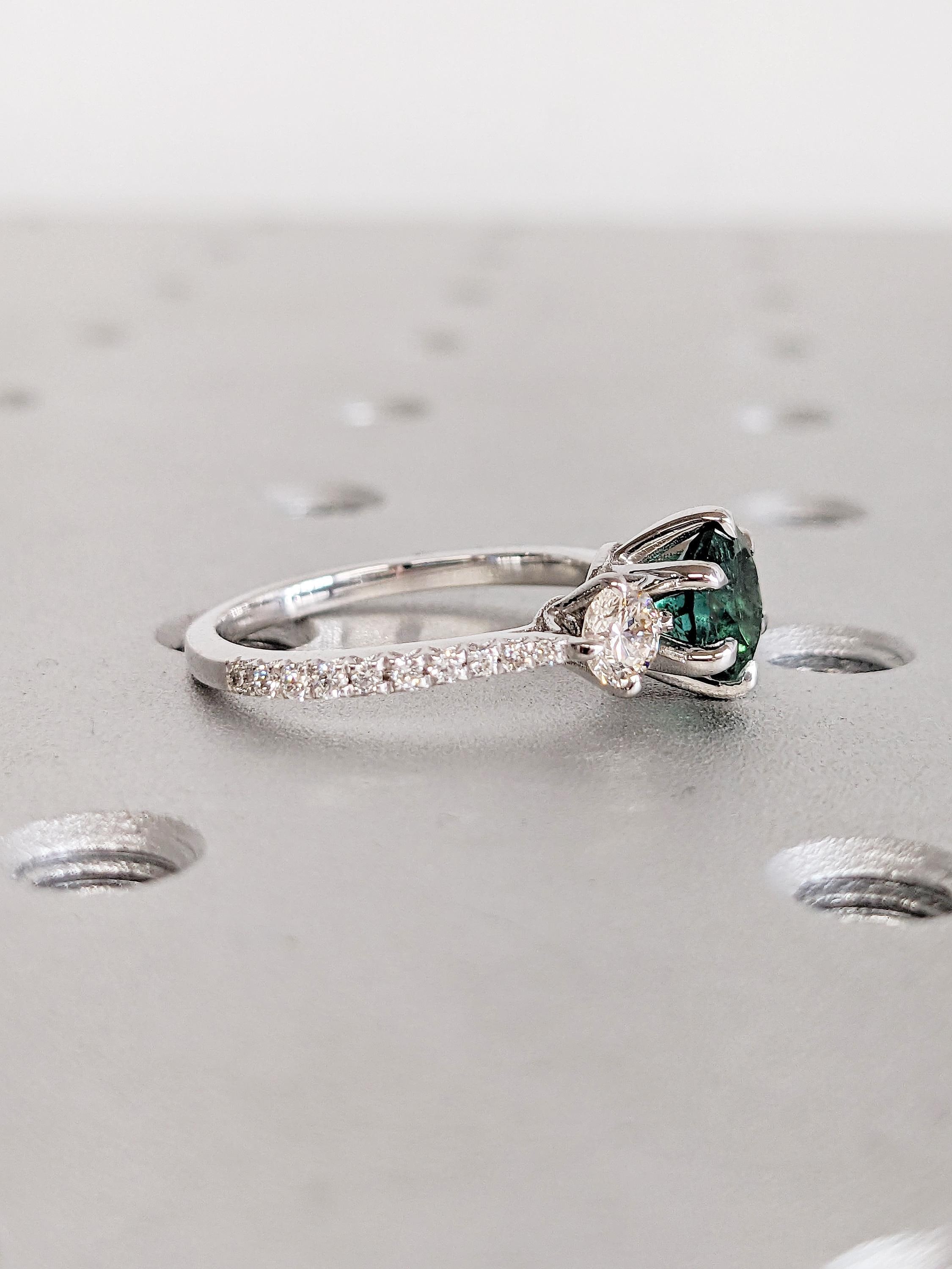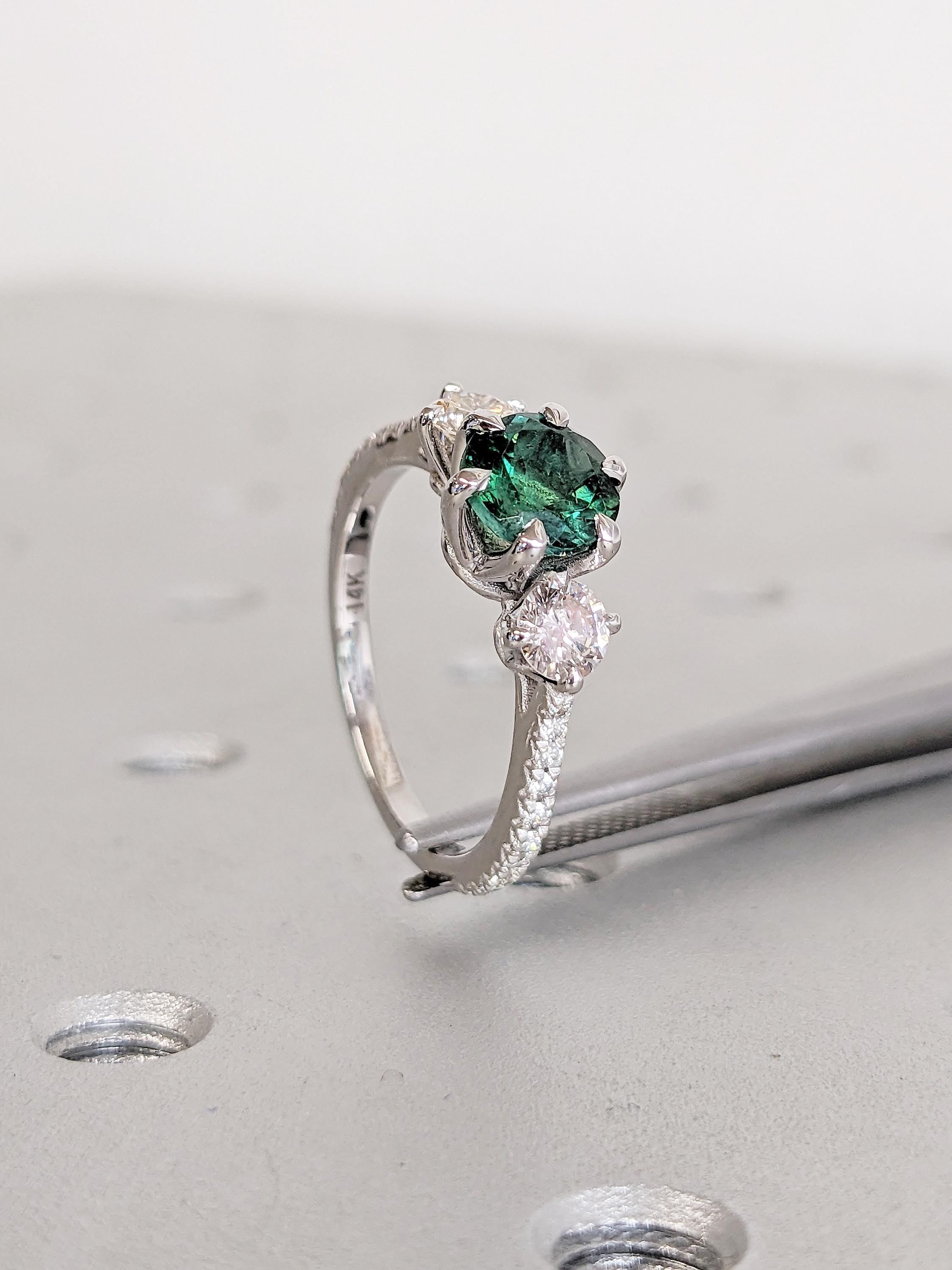 Green Tourmaline Ring, Dainty 14k White Gold Ring, 3 Stone Ring, Tourmaline Gemstone Ring, Diamond Half Eternity Band, Women Wedding Ring