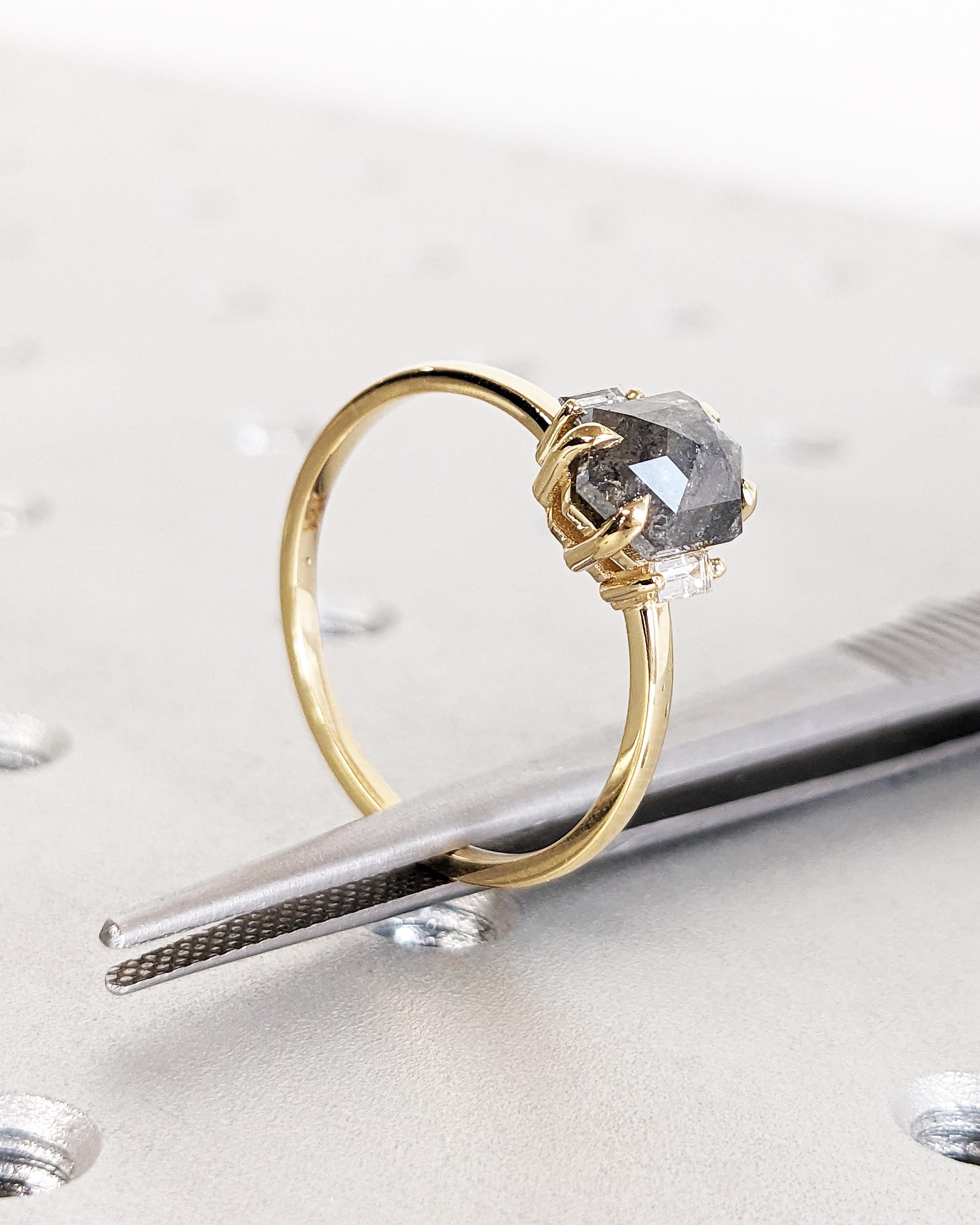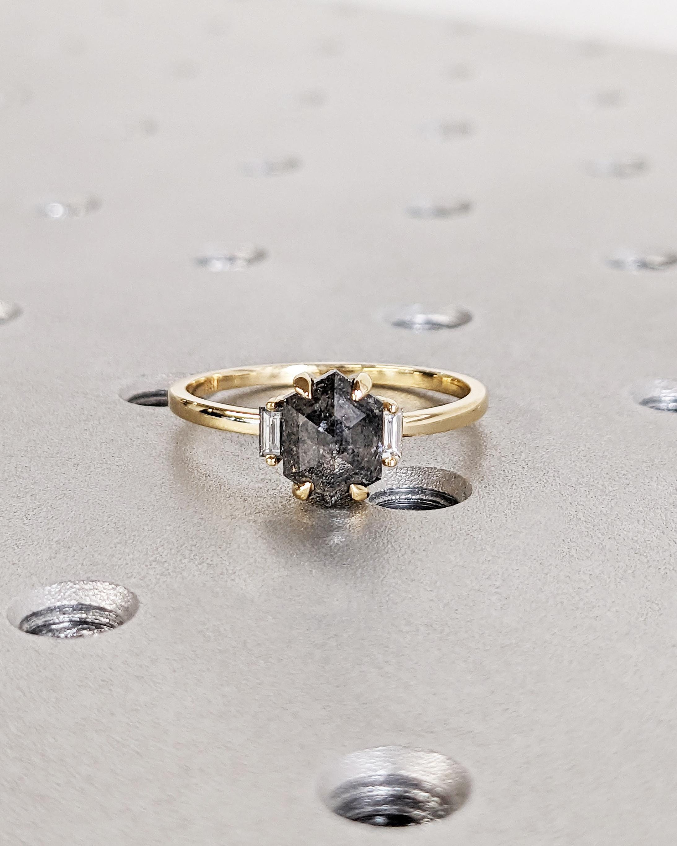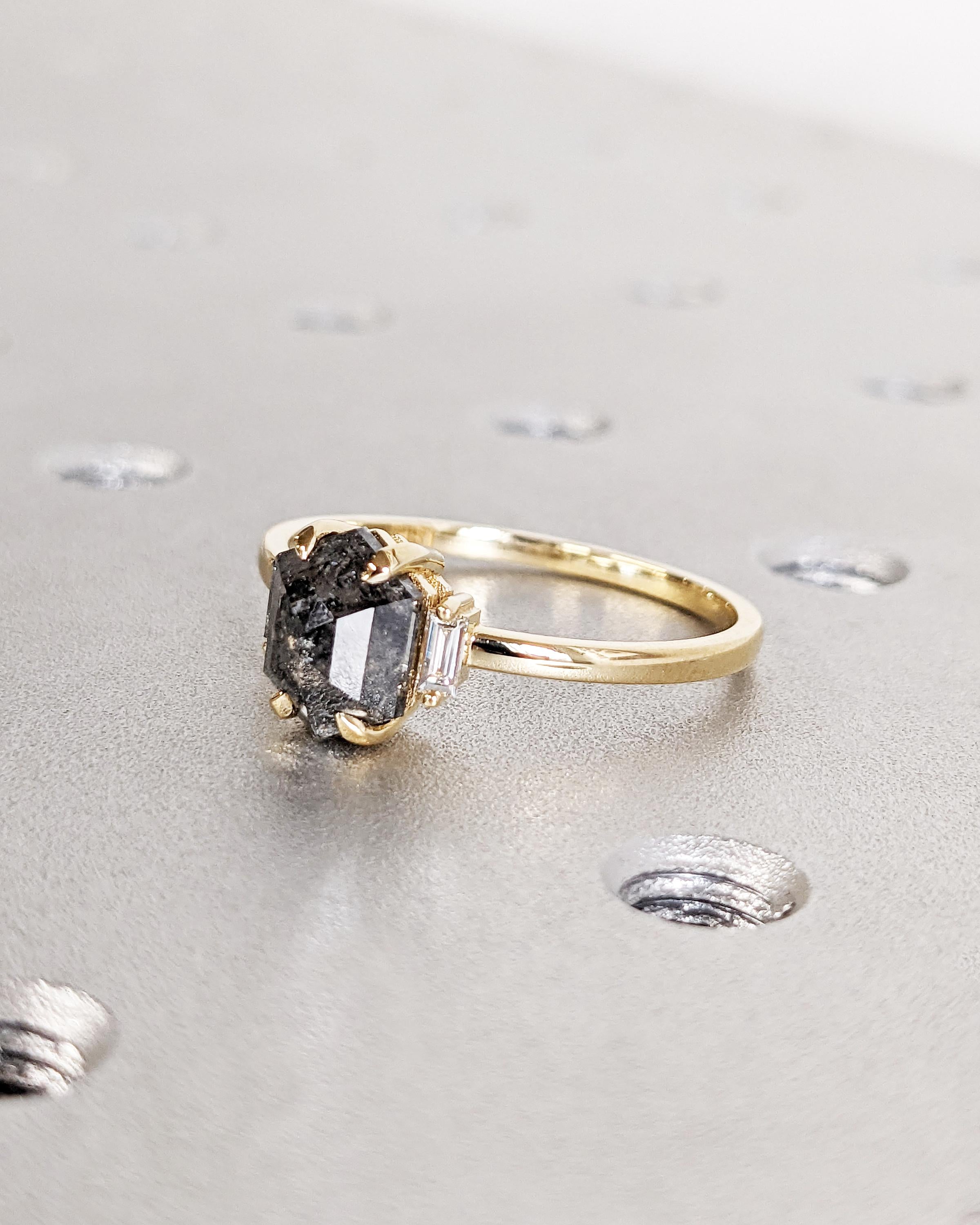 With a galaxy-like salt and pepper diamond in a hexagon cut, and baguette accents to highlight its brilliance, this ring is pure uniqueness. Perfect as a statement engagement ring or a distinctive bridal piece.