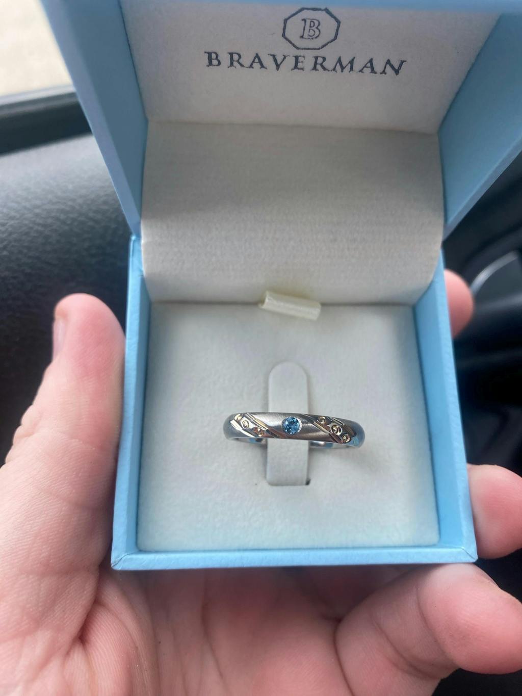 This hand made ring is crafted of the finest quality titanium. The ring is satin brushed with grooved high polished parts and 'diamond like' dents, domed and set with an aquamarine. It's comfort fit and can be as a day to day accessory or as a wedding band or engagement ring - can be set with any birthstone gem you wish!