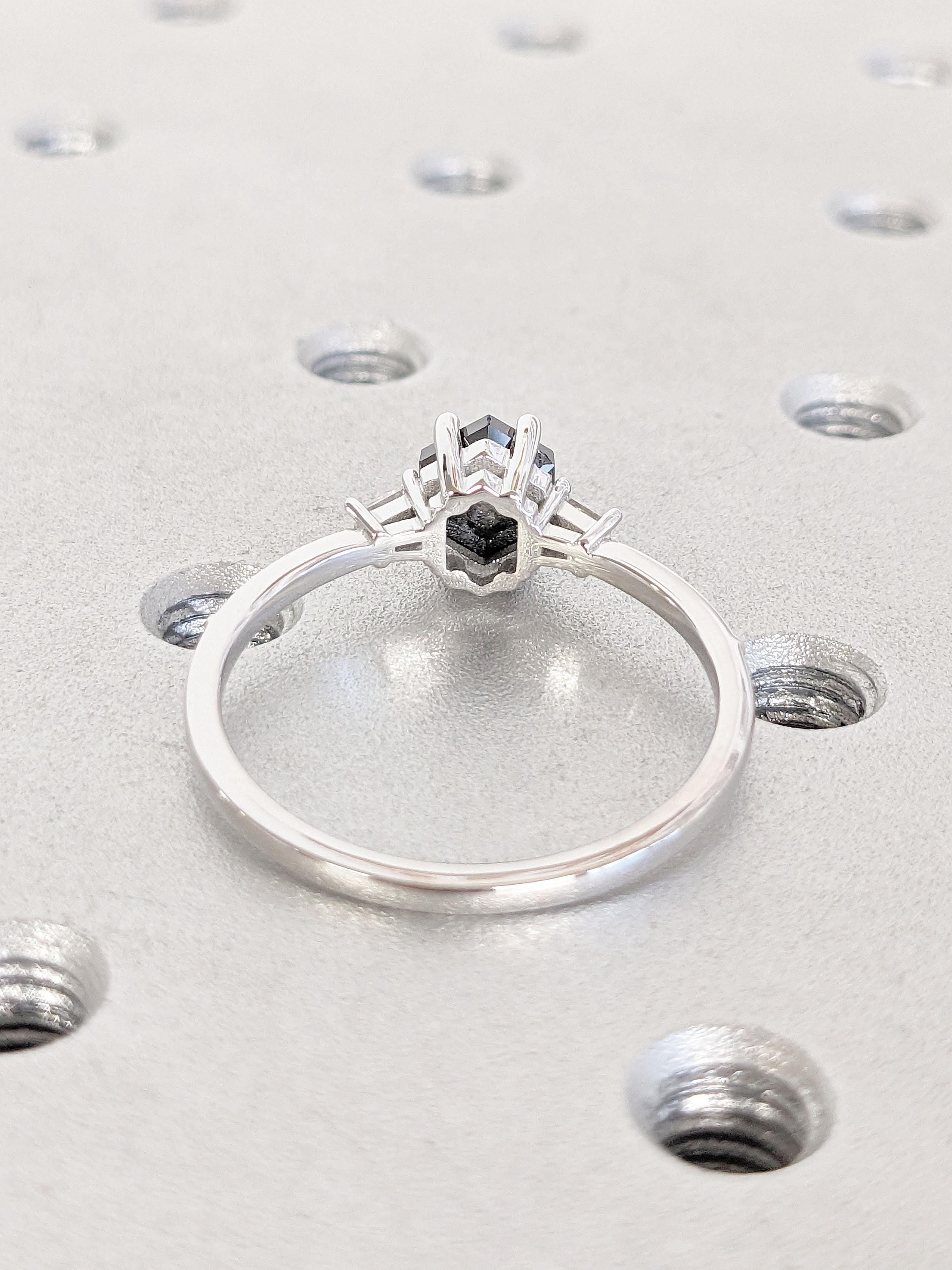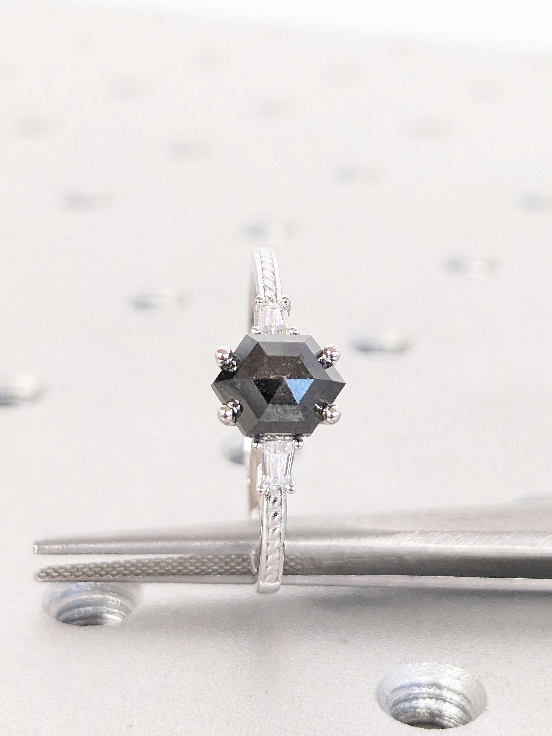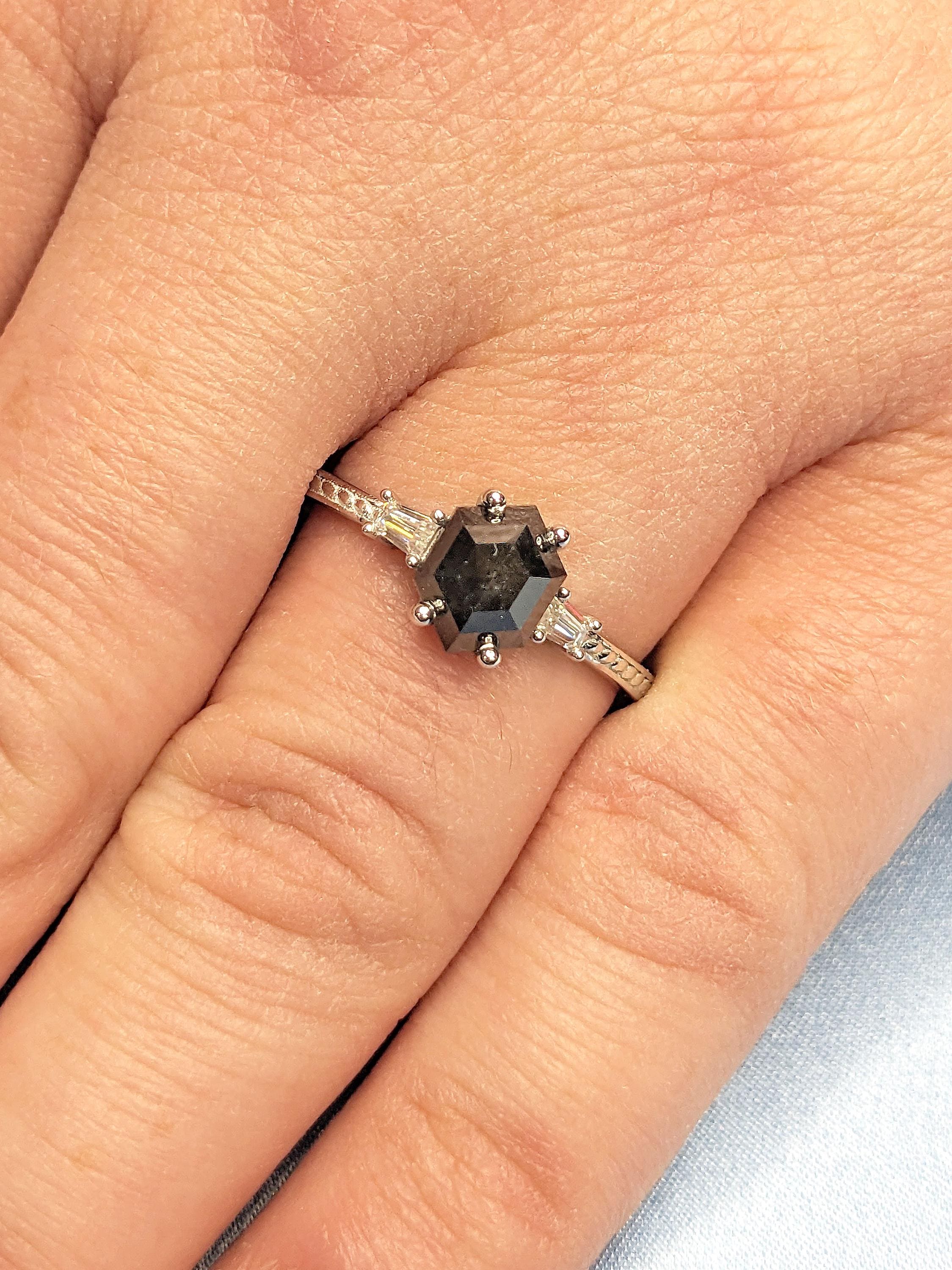 A dainty handmade geometrical ring, features a hexagon cut Salt and Pepper Diamond center. Accented by baguette cut side stones in your choice of natural diamonds, lab diamonds or moissanites on a thin band of 1.6mm width.