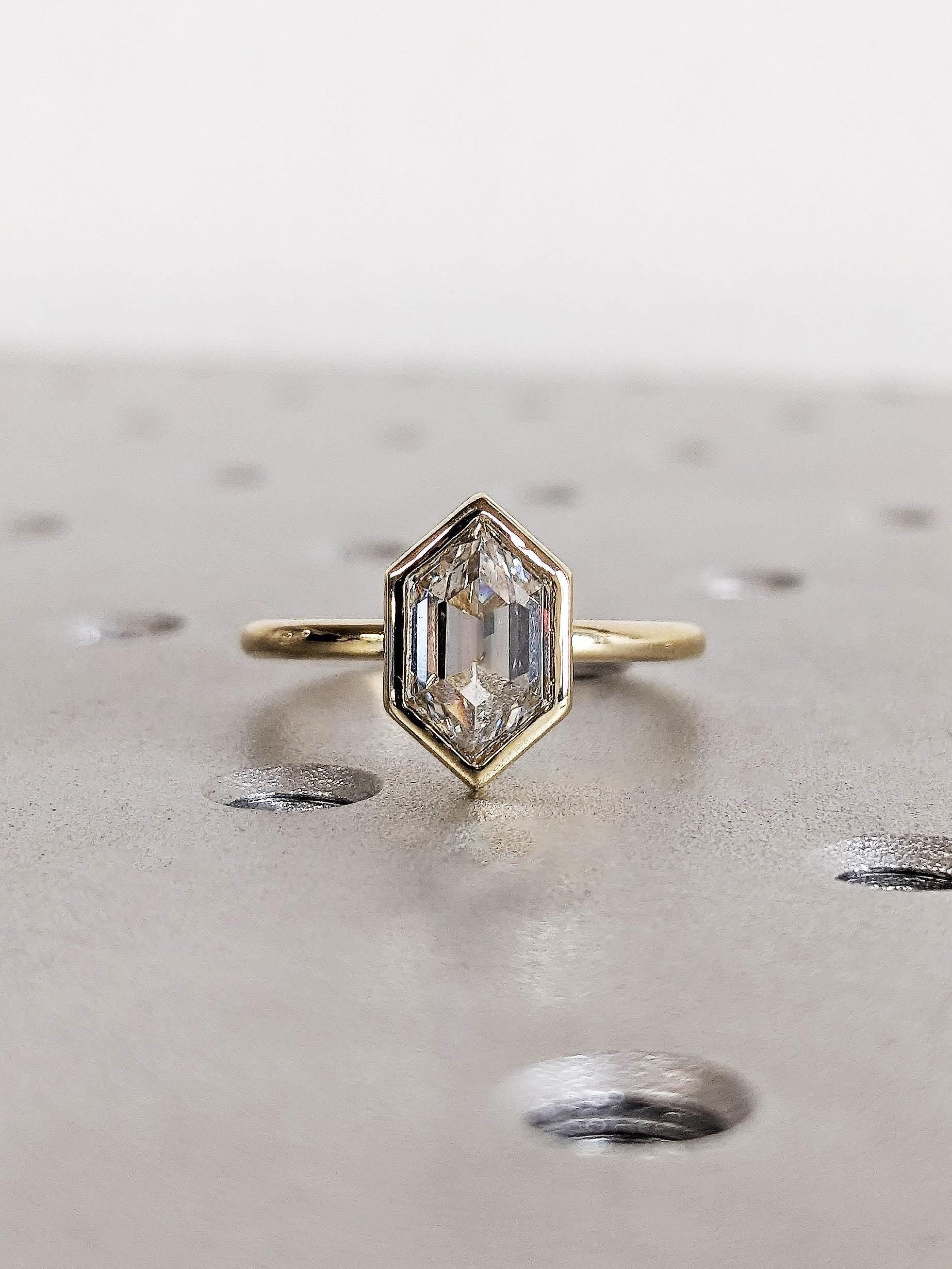 Hexagon Cut Lab Diamond Solitaire Ring, 14K Yellow Gold Bezel Setting Wedding Band, Women’s Engagement Anniversary Ring