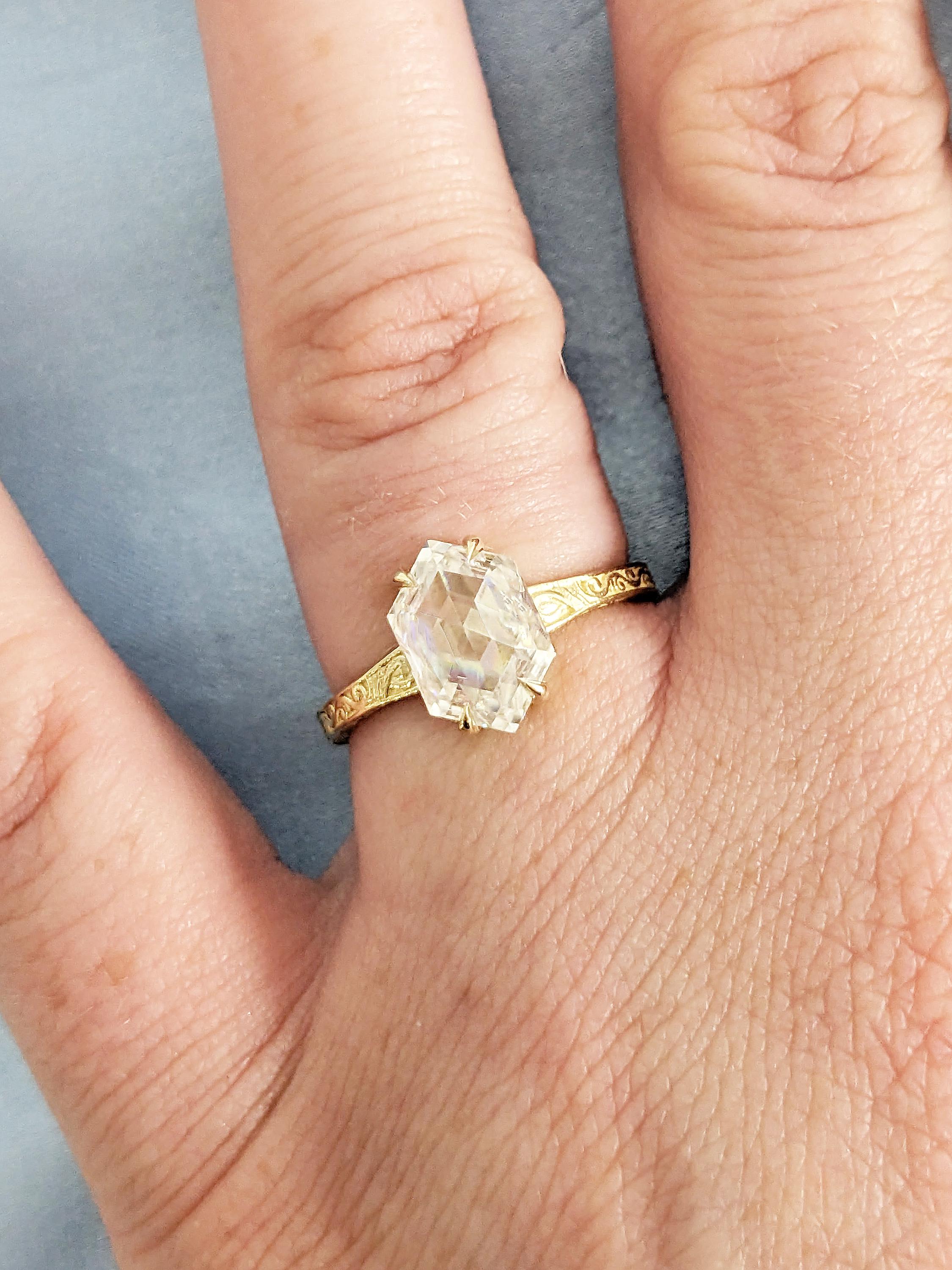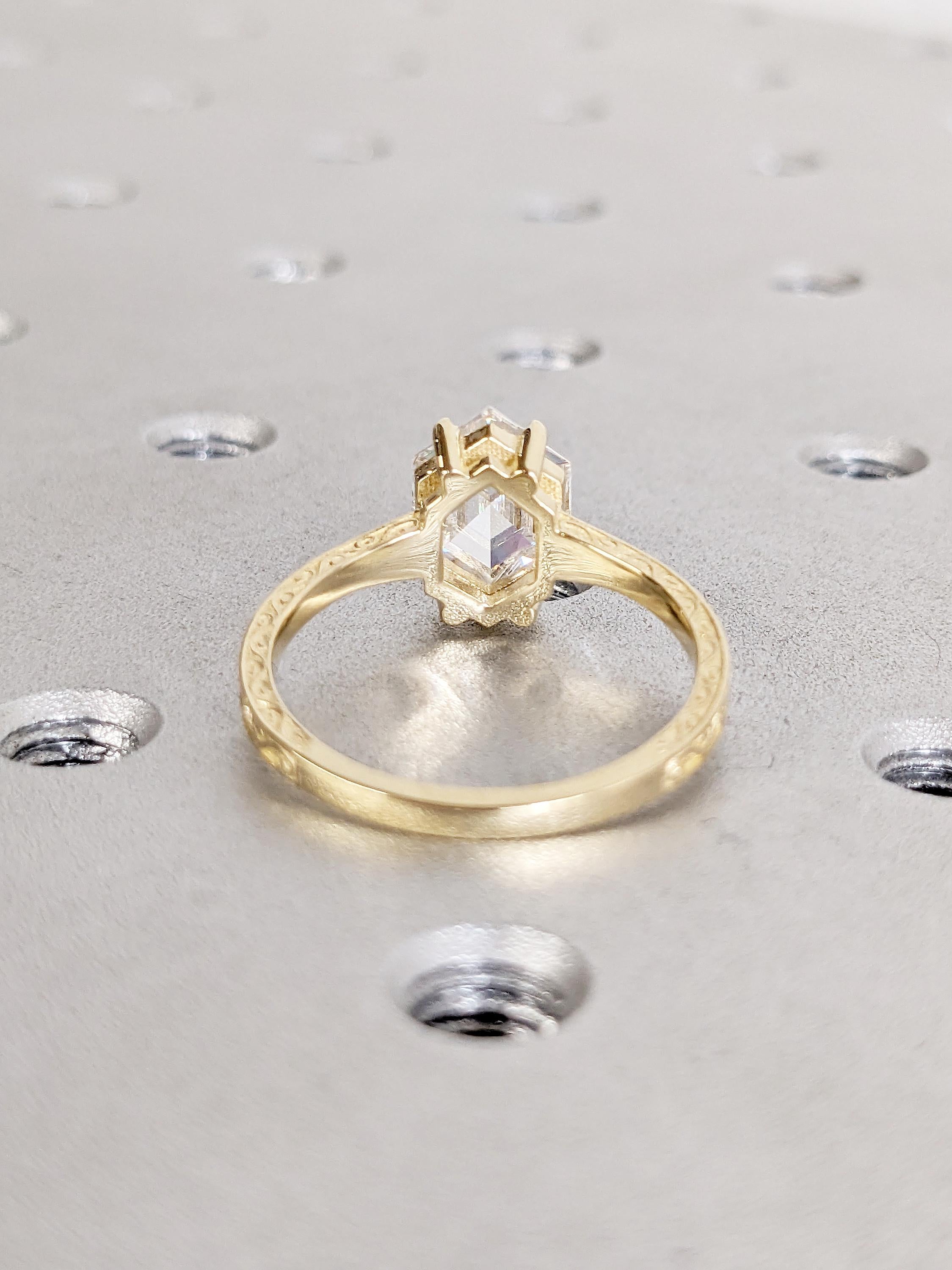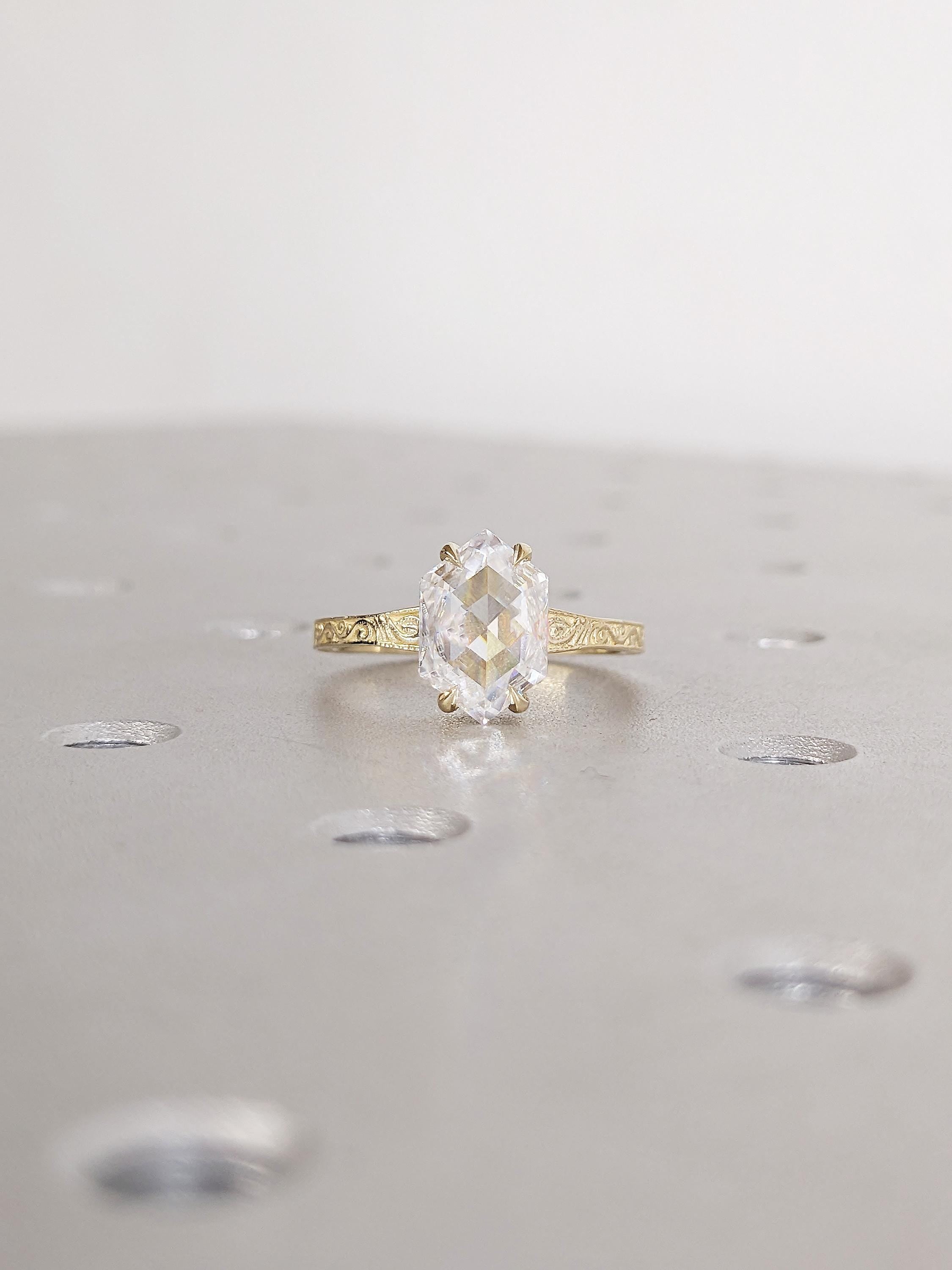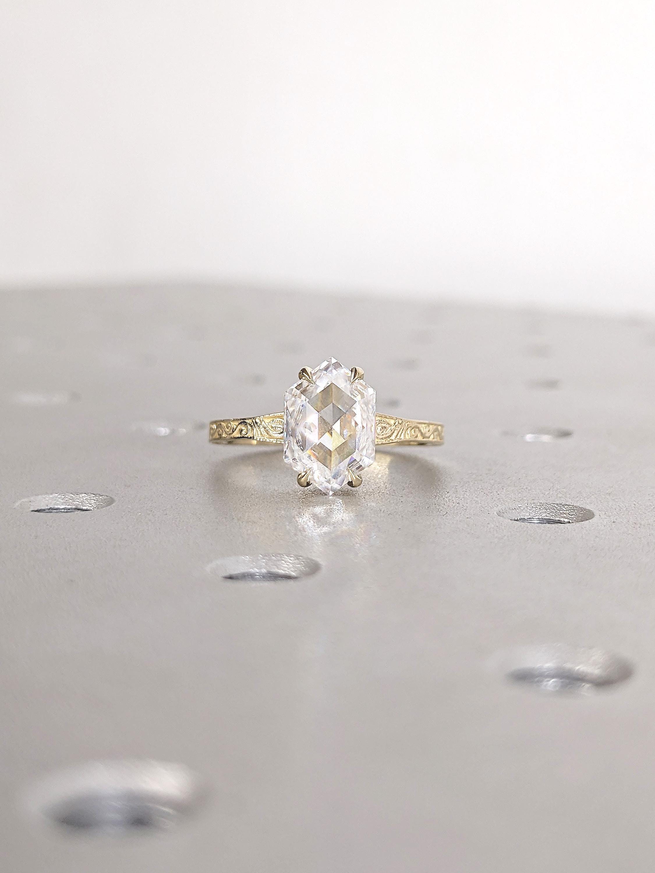 Hexagon Cut Moissanite Engagement Ring, Unique 14K Yellow Gold Filigree Engraving Wedding Band, Vintage Inspired Solitaire Rings for Women