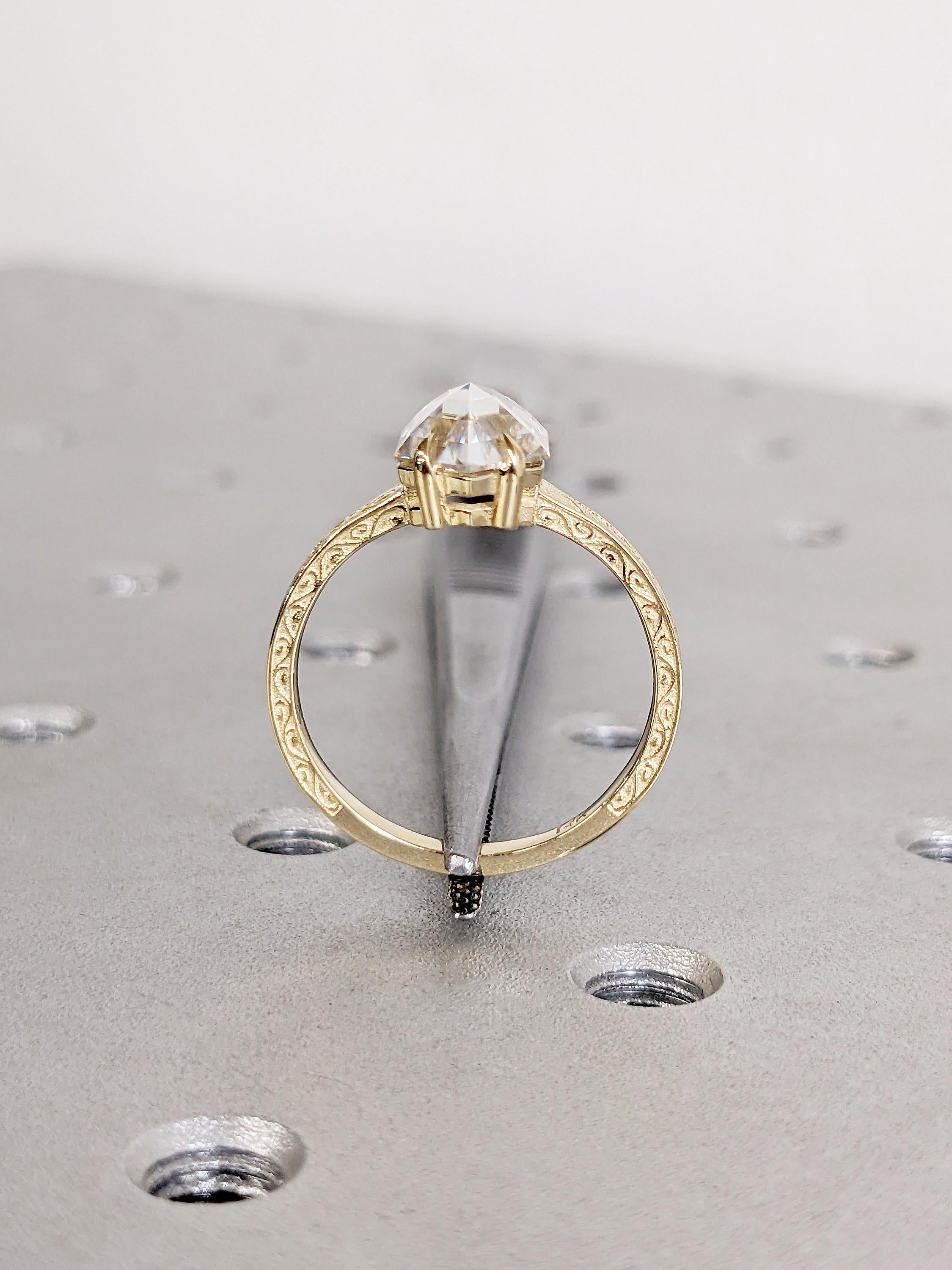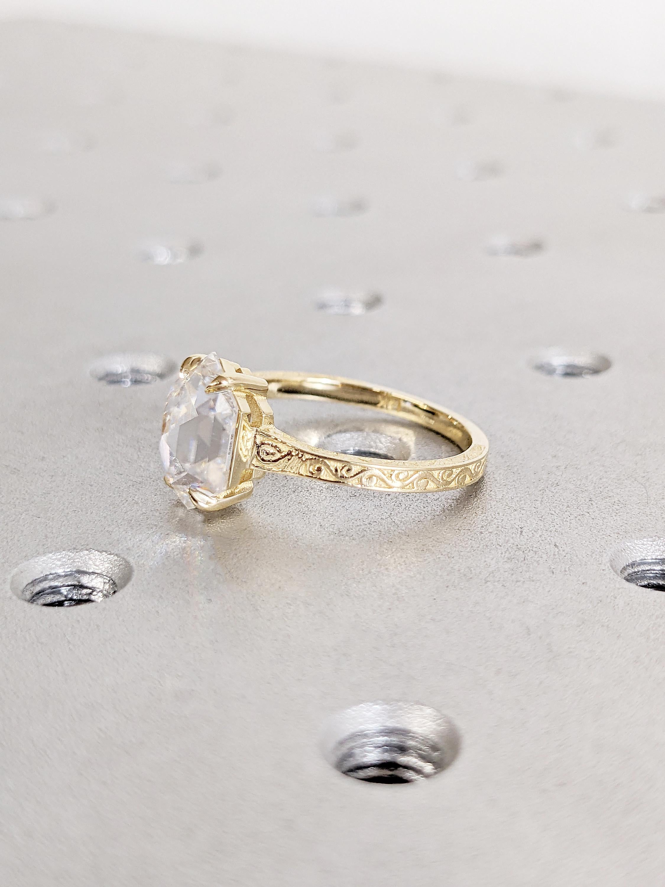 Unveil the timeless allure of your commitment with our antique-inspired Moissanite engagement ring. Its intricate design showcases a basket setting delicately placed on a square-shaped band, adorned with undulating wave filigree for a touch of vintage elegance.