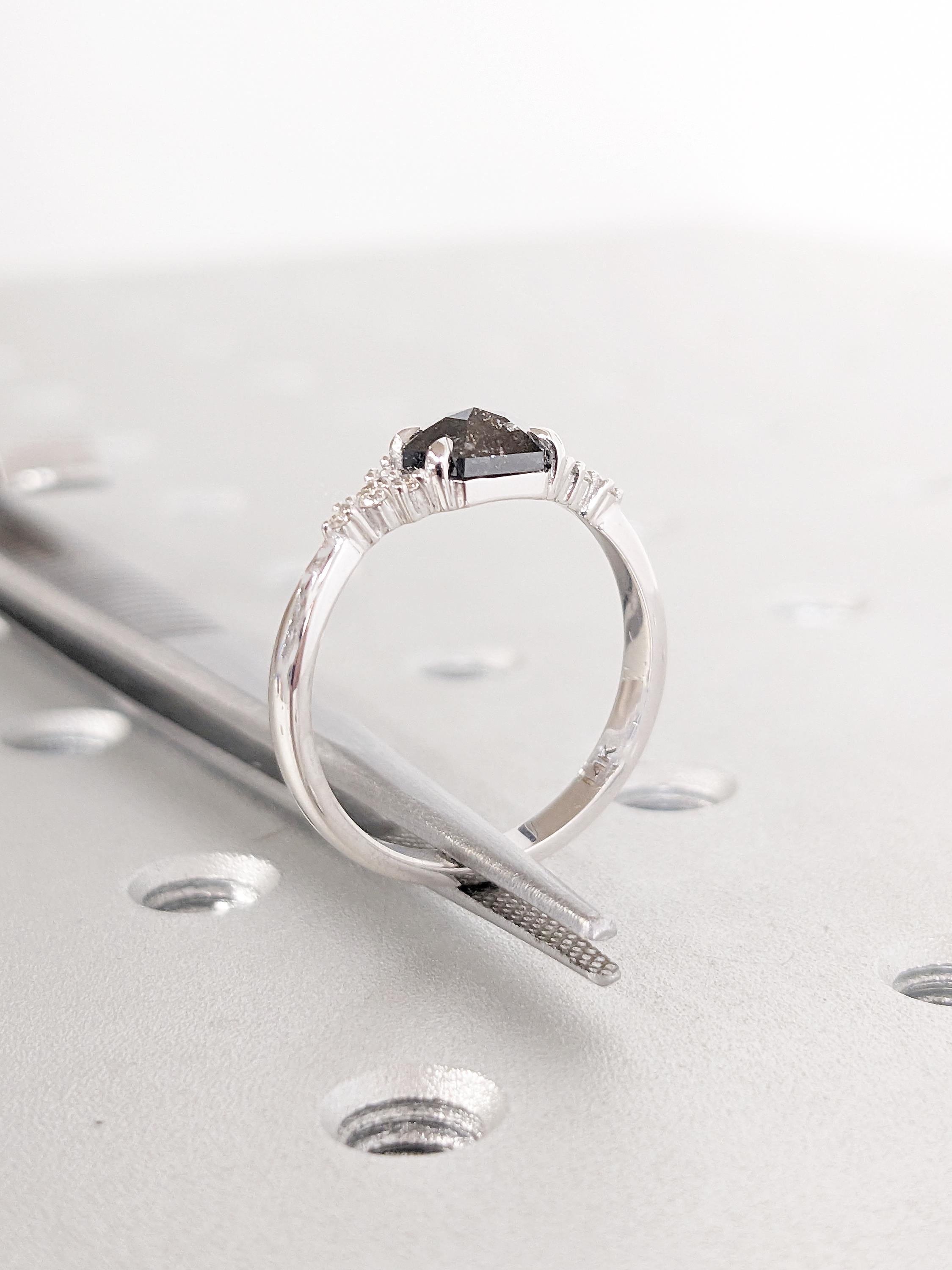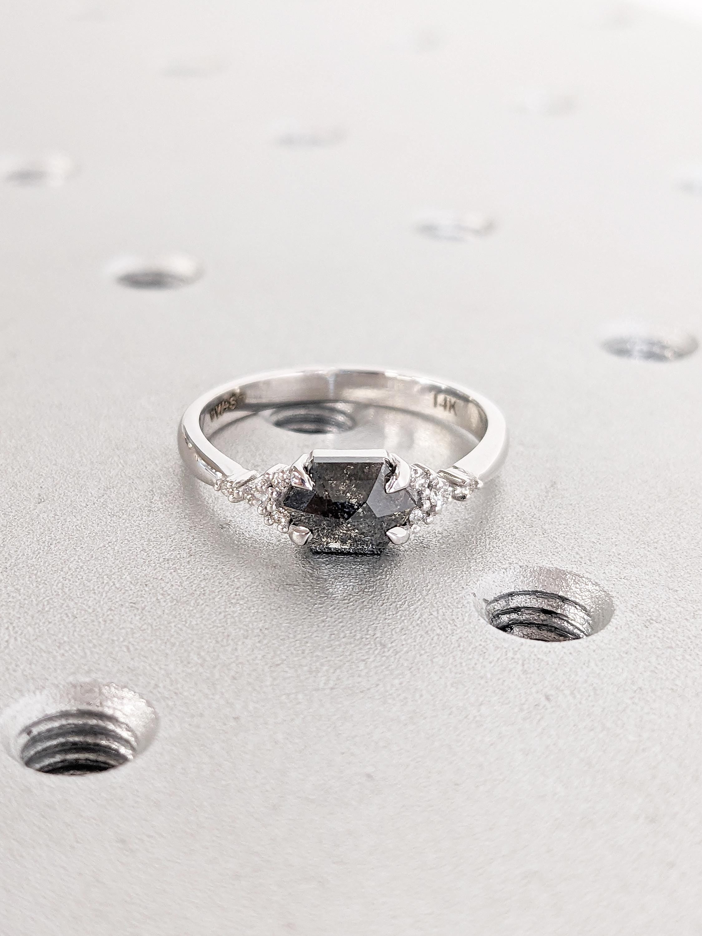 This ring features a hexagon-cut Salt and Pepper Diamond, accented by clusters of round side stones in Natural Diamonds, Lab Grown Diamonds, or Moissanite. Set on a sleek band, it’s a modern yet timeless design, perfect as an anniversary or wedding ring