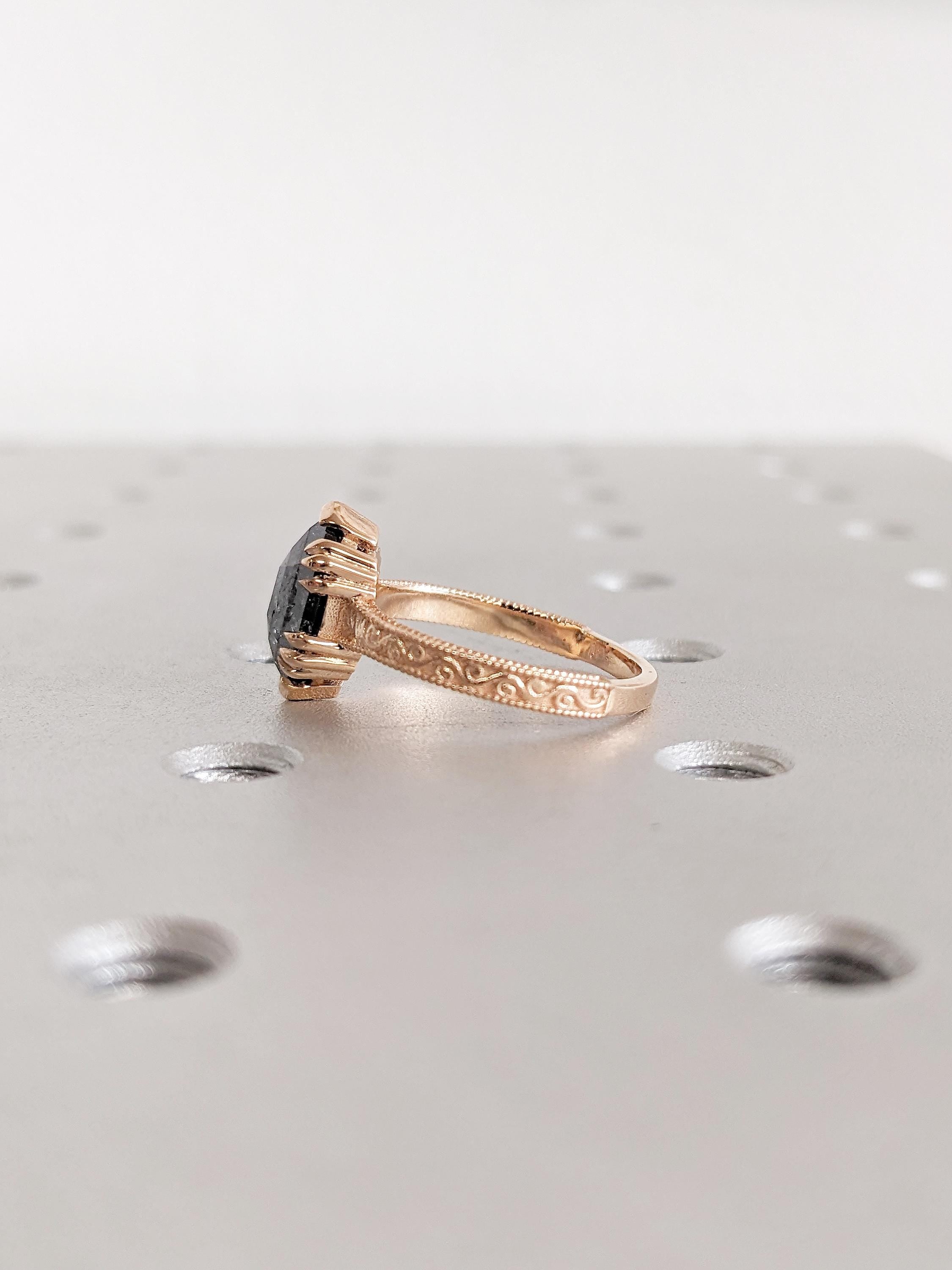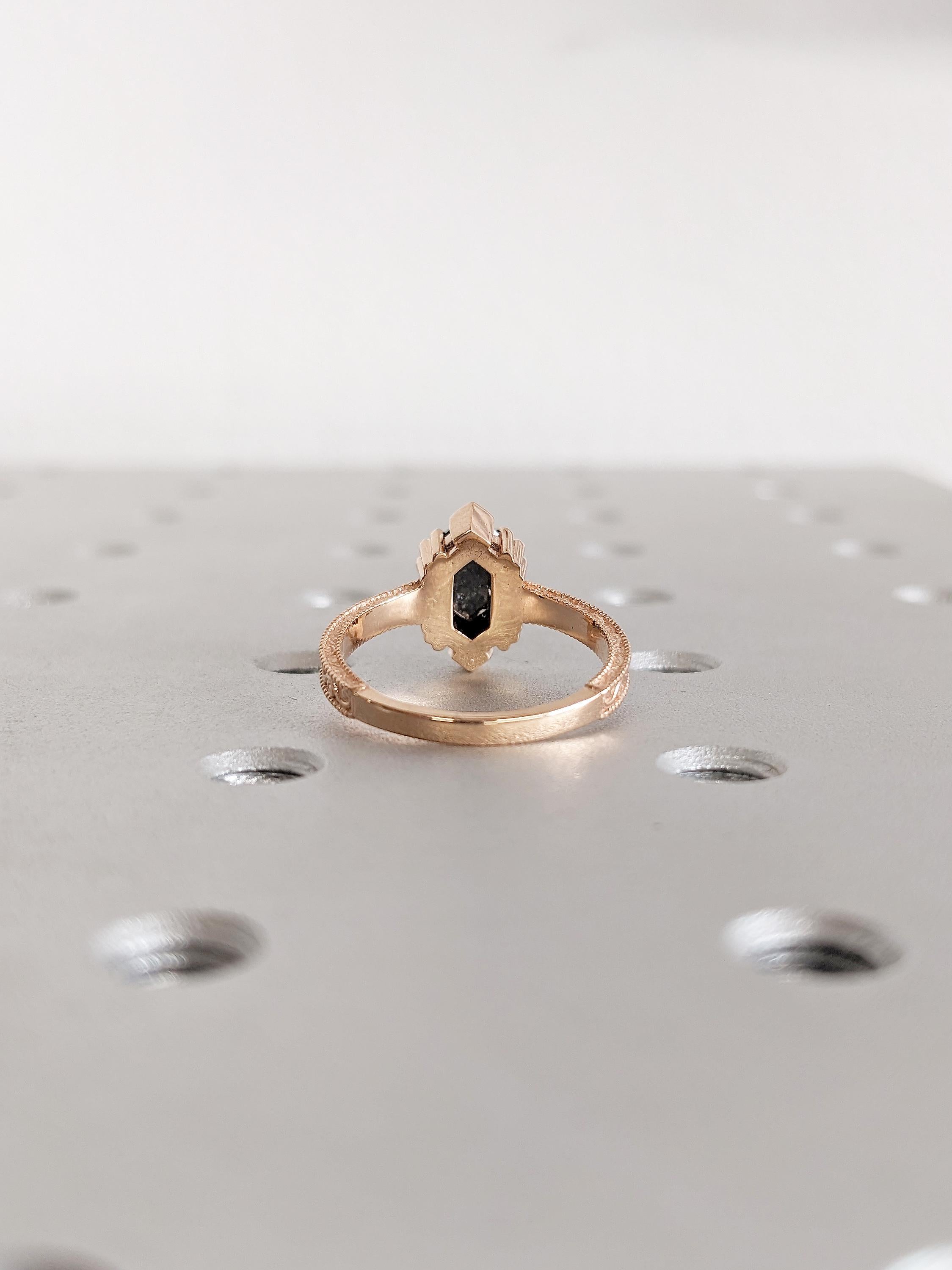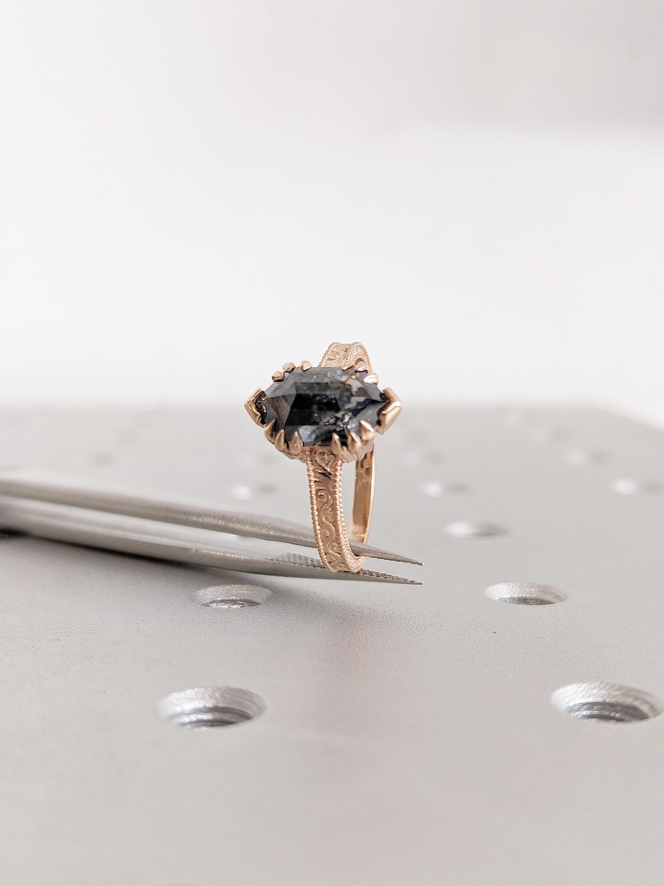 Hexagon Cut Salt and Pepper Diamond Engagement Ring, Milgrain 18k Rose Gold Promise Ring for Her, Filigree Diamond Ring, Big Statement Ring