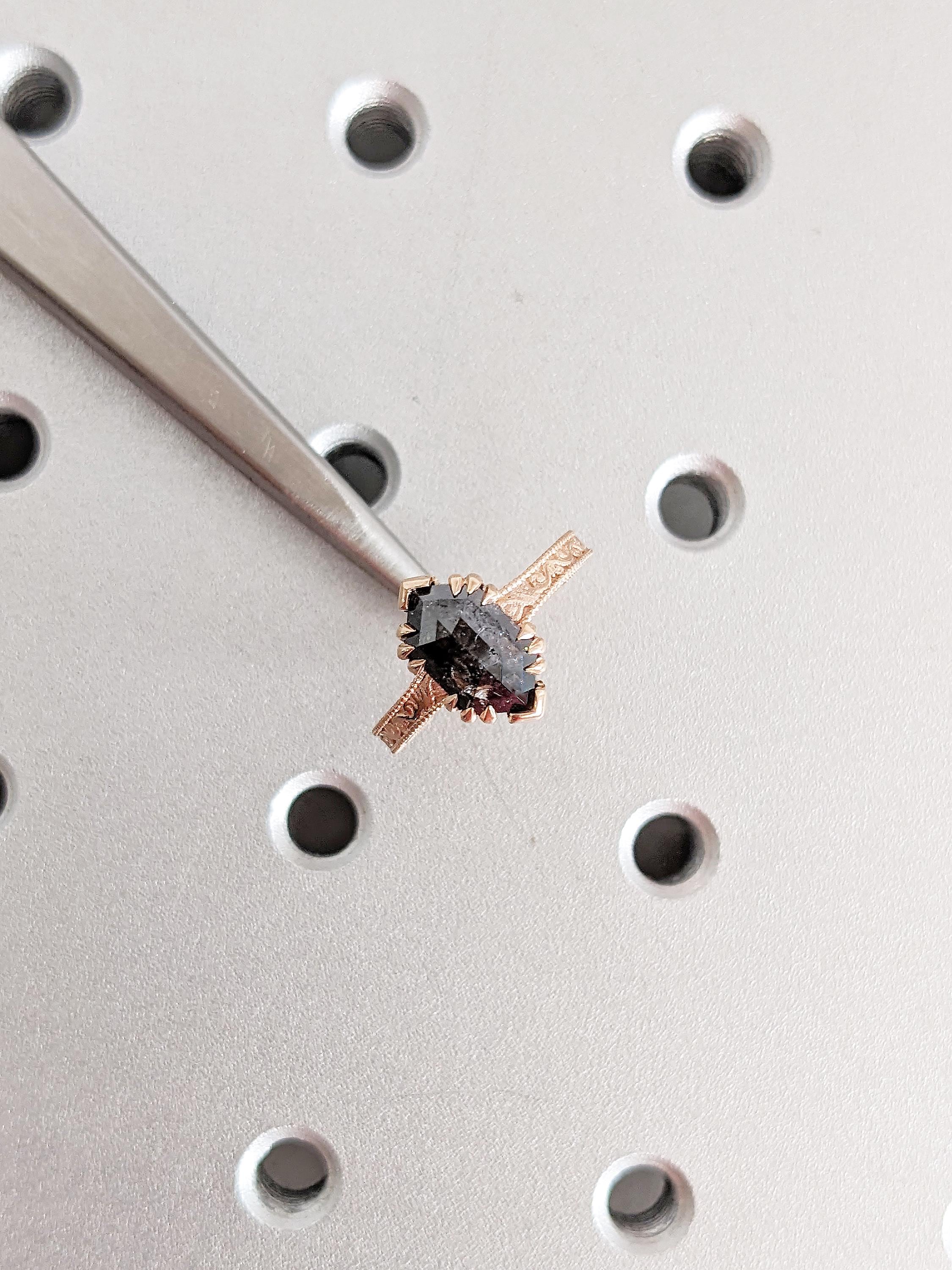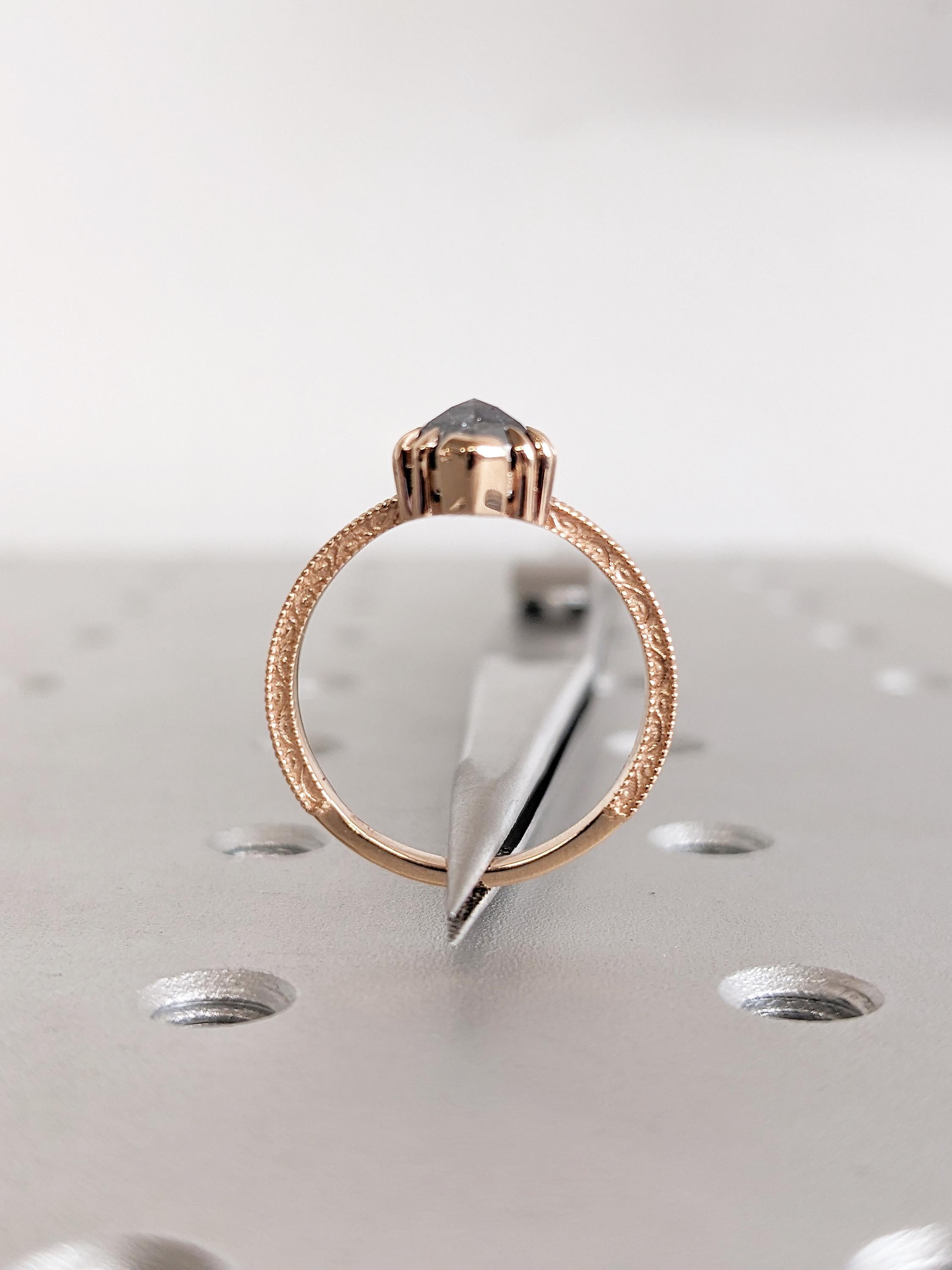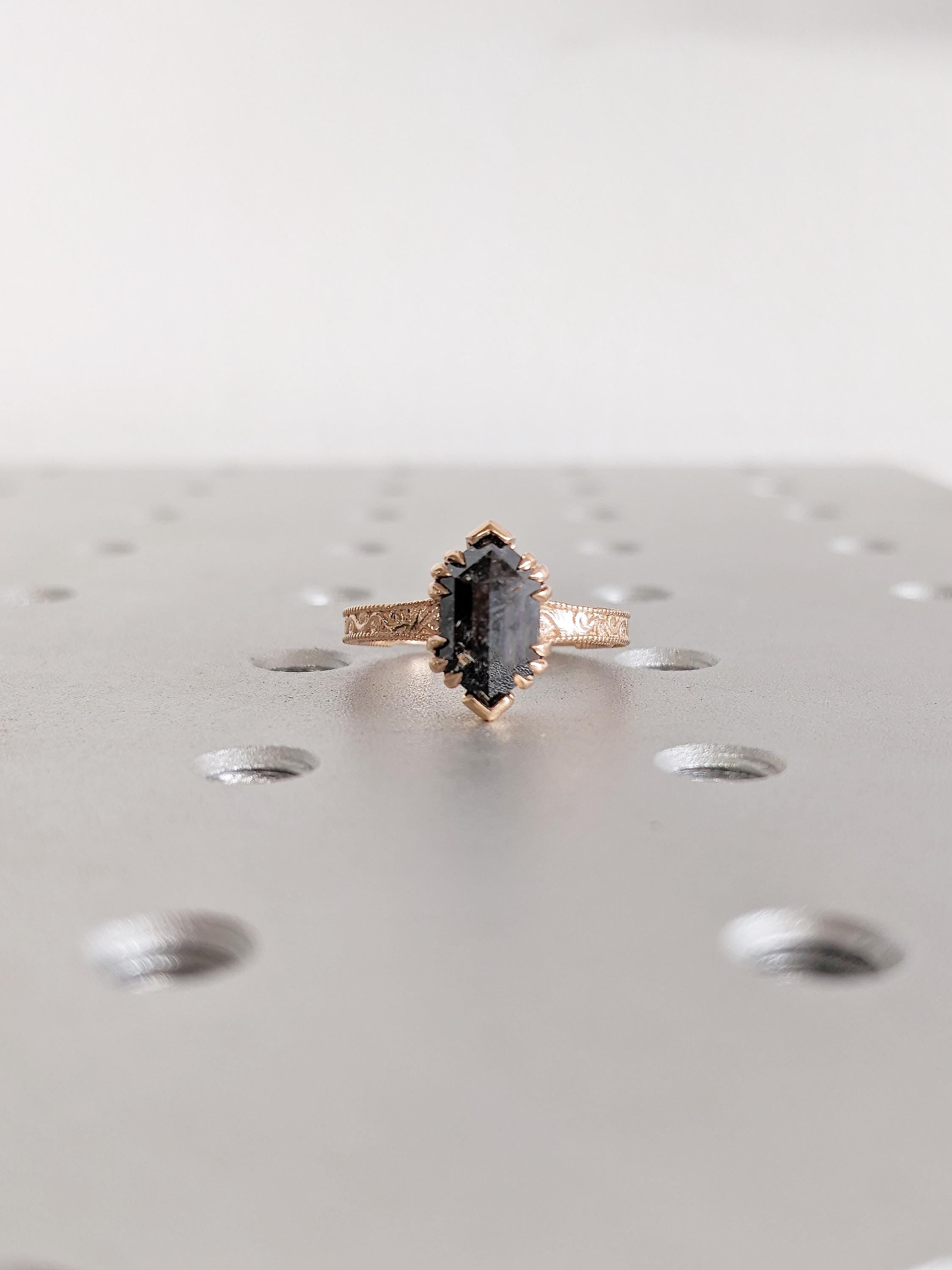 This hexagon-cut Salt and Pepper Diamond engagement ring showcases a unique blend of modern geometry and vintage charm. The solitaire stone is set in elegant talon prongs, while the band features intricate milgrain and filigree details for a timeless, handcrafted appeal. A perfect choice for those who love distinctive, antique-inspired elegance.