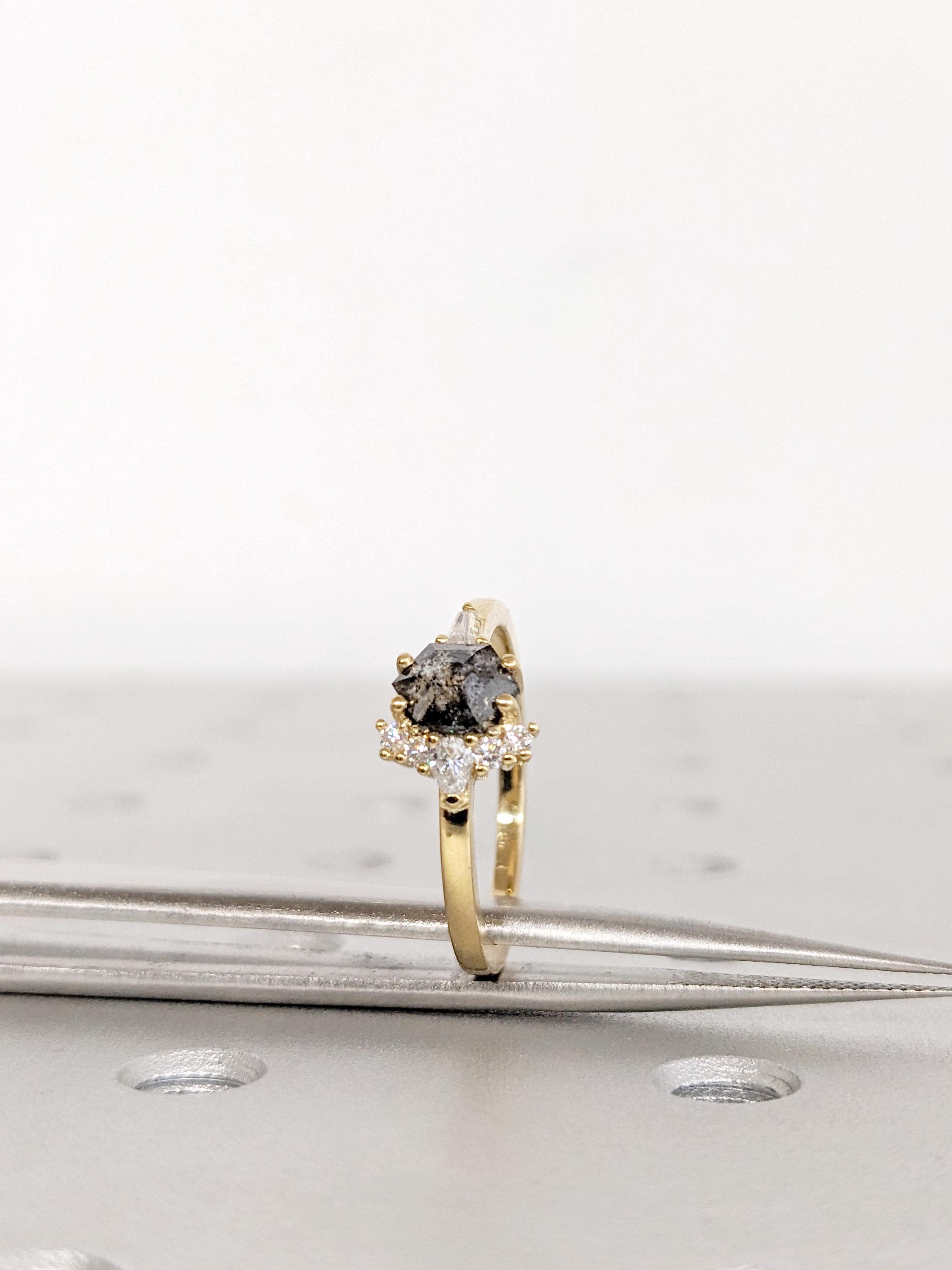 This Salt and Pepper Diamond engagement ring showcases a unique hexagon cut center stone in a secure prong setting, complemented by Natural Diamond or Moissanite side stones in pear, round, and tapered baguette cuts. Its modern yet timeless design makes it a perfect choice for engagements, weddings, anniversaries, or a meaningful everyday statement piece.