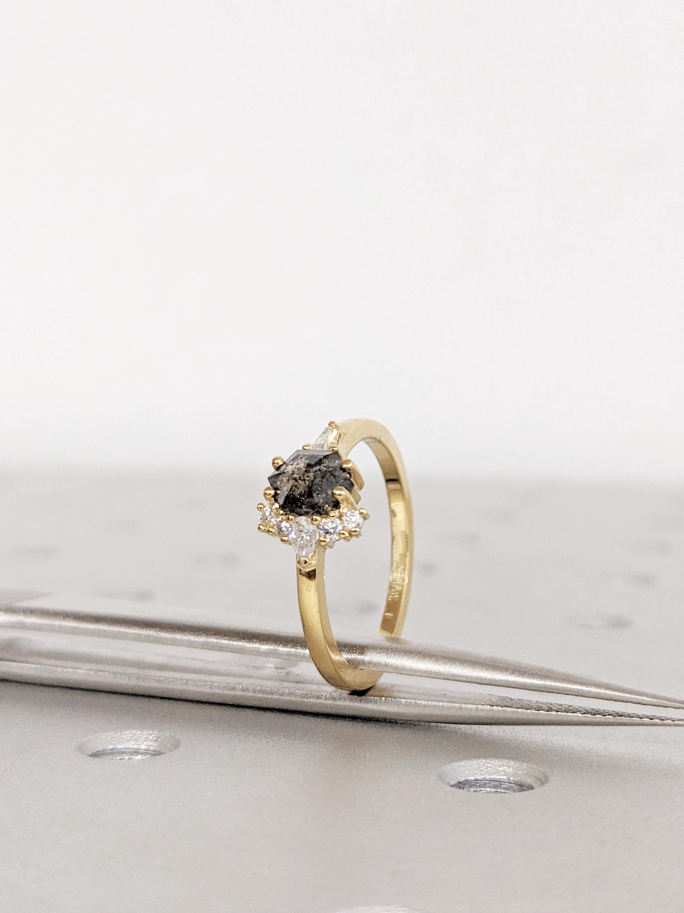 Hexagon Cut Salt and Pepper Diamond Ring, Diamond Cluster Engagement Ring, 18K Yellow Gold Salt and Pepper Wedding Ring, Bridal Jewelry Gift