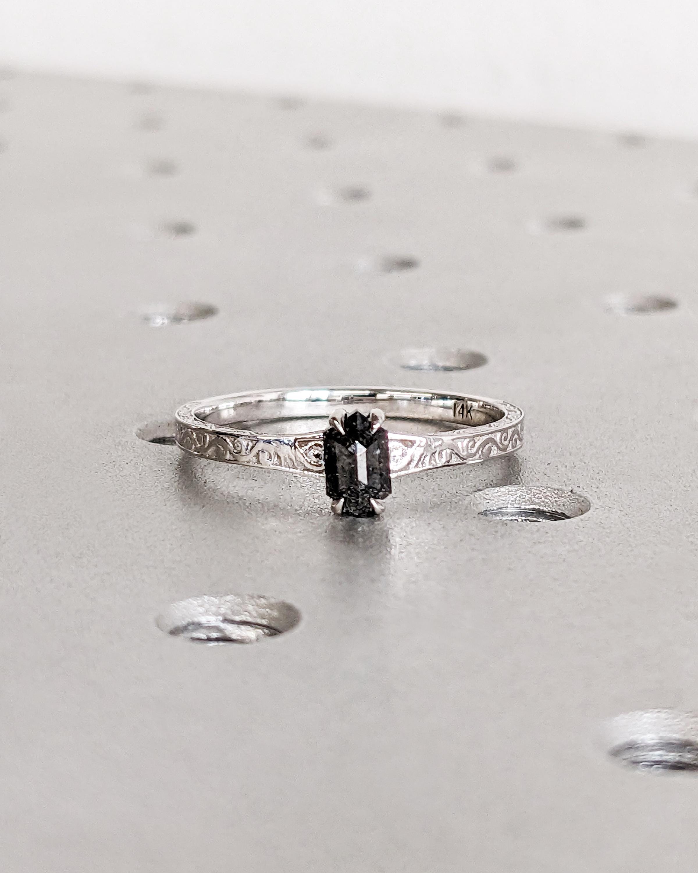 This handcrafted antique-inspired engagement ring features a beautiful hexagon cut natural Salt and Pepper Diamond on a basket setting, held on a square-shaped band, adorned with undulating wave filigree. This minimalist statement piece effortlessly combines vintage charm with a modern flair, suitable for any occasion.