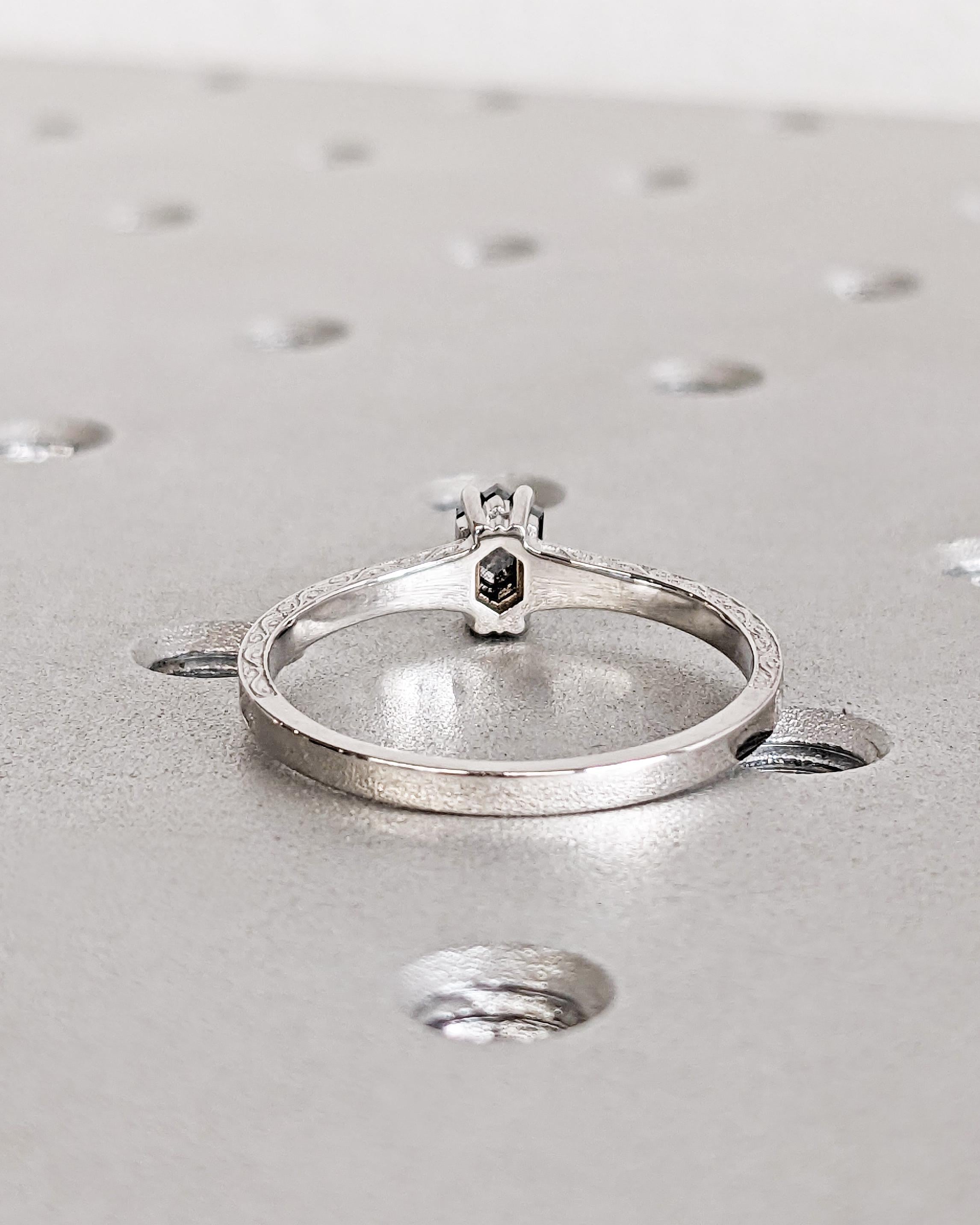 Hexagon Salt and Pepper Diamond Ring, Solitaire Hexagon Diamond Engagement Ring, Filigree Hexagon Wedding Ring, 14K White Gold Vintage Ring