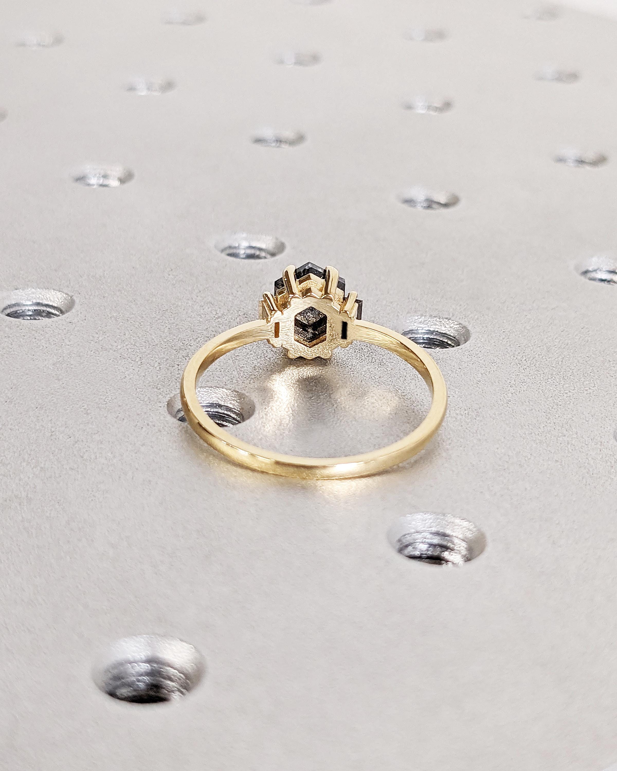 Hexagon Salt & Pepper Diamond Ring, Solid Gold Hexagon Baguette Diamond Engagement Ring, Unique Grey Galaxy Geometric Rose Cut Diamond Ring