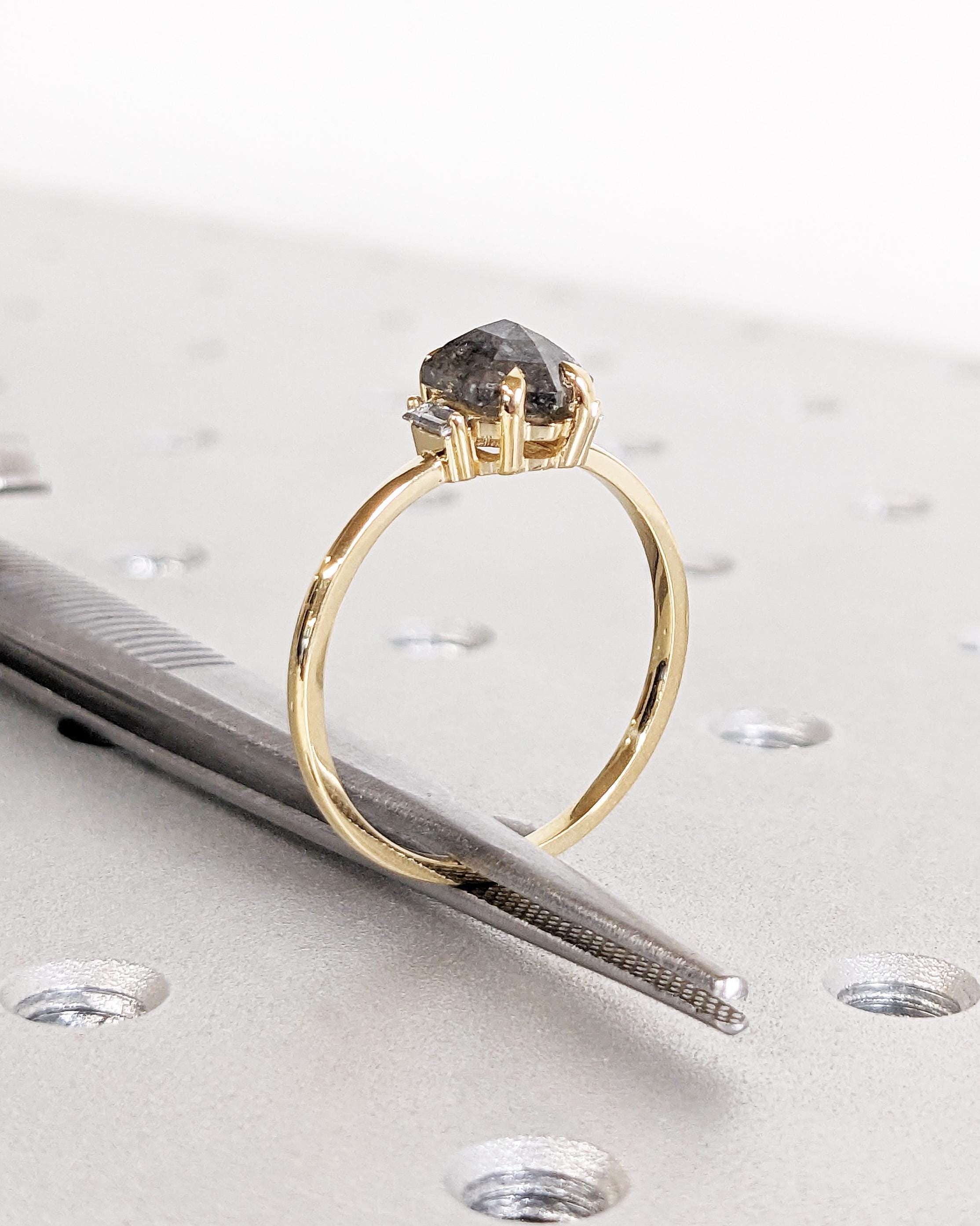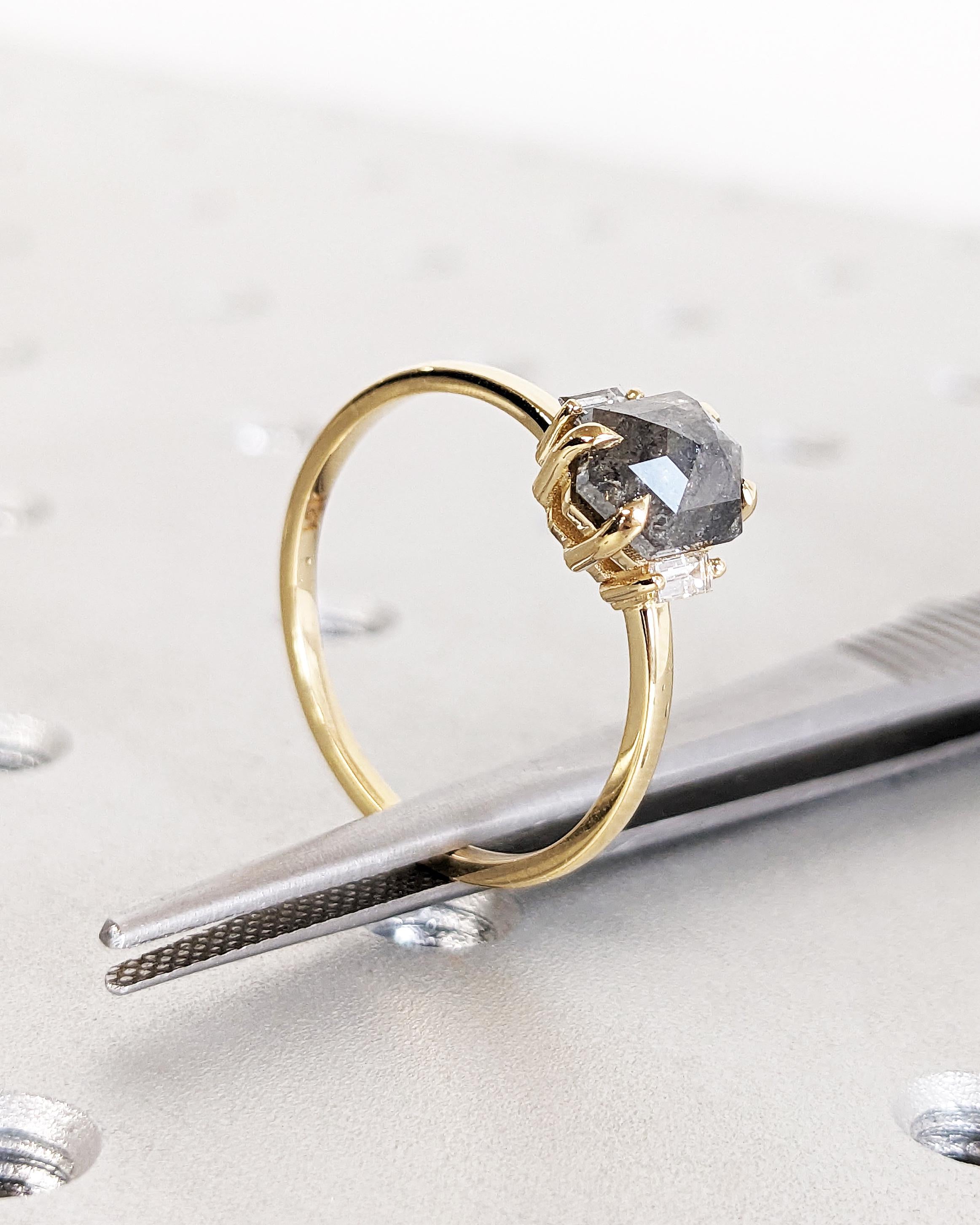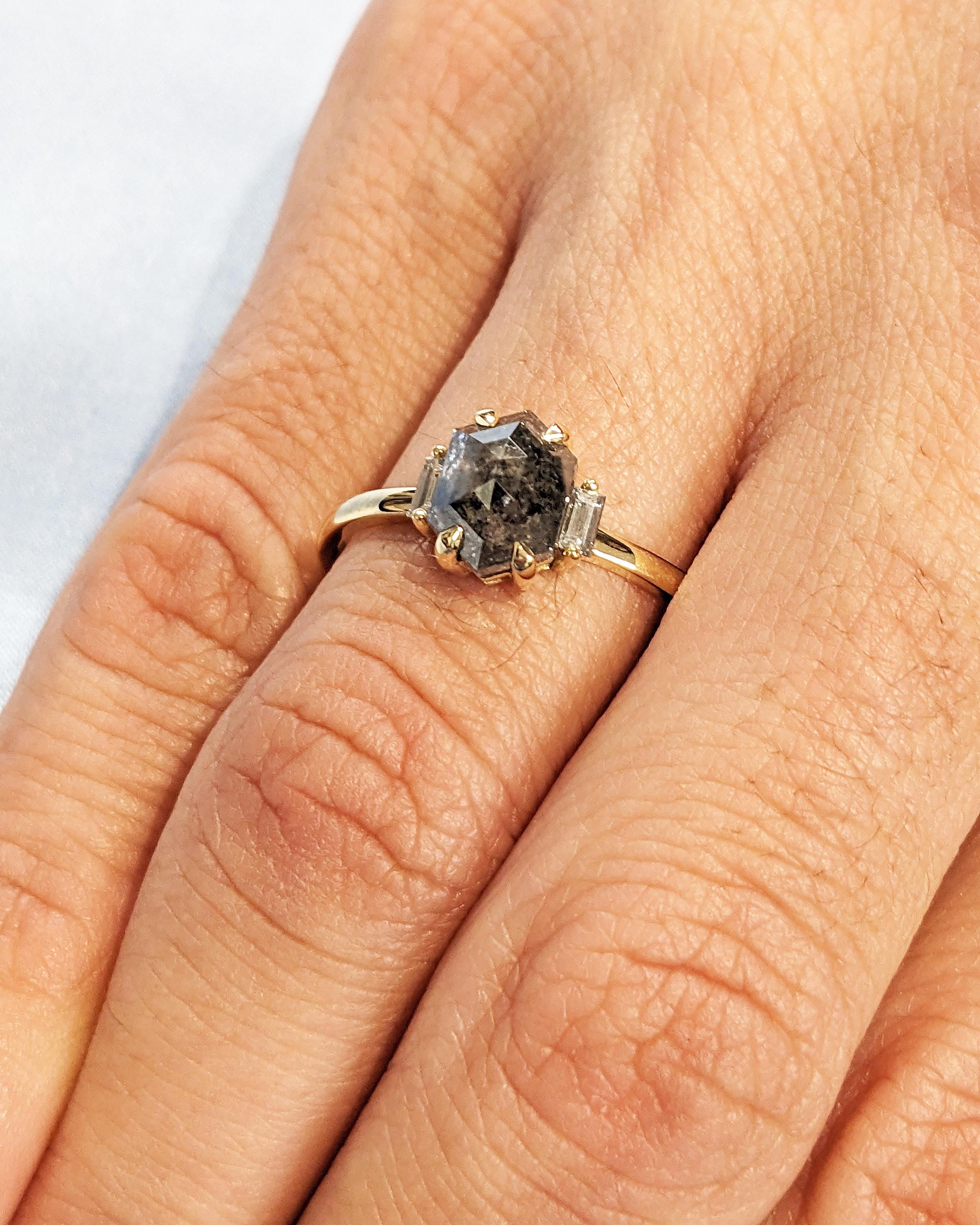 ONE-OF-A-KIND hexagon salt and pepper diamond, a baguette-enhanced diamond ring that is just pure uniqueness.