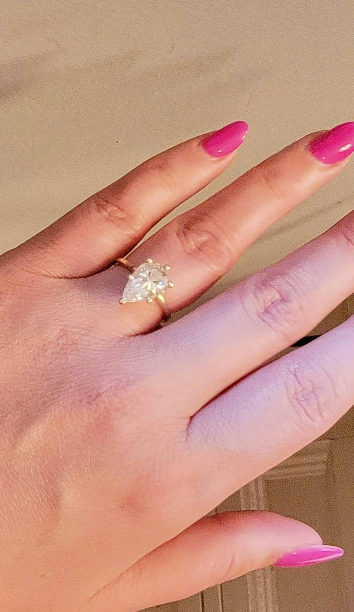 A beautiful Pear shaped Moissanite, set with a super delicate and thin setting, paved with a row of moissanites , a thin band of 1.6mm width, make this ring a true stunner!