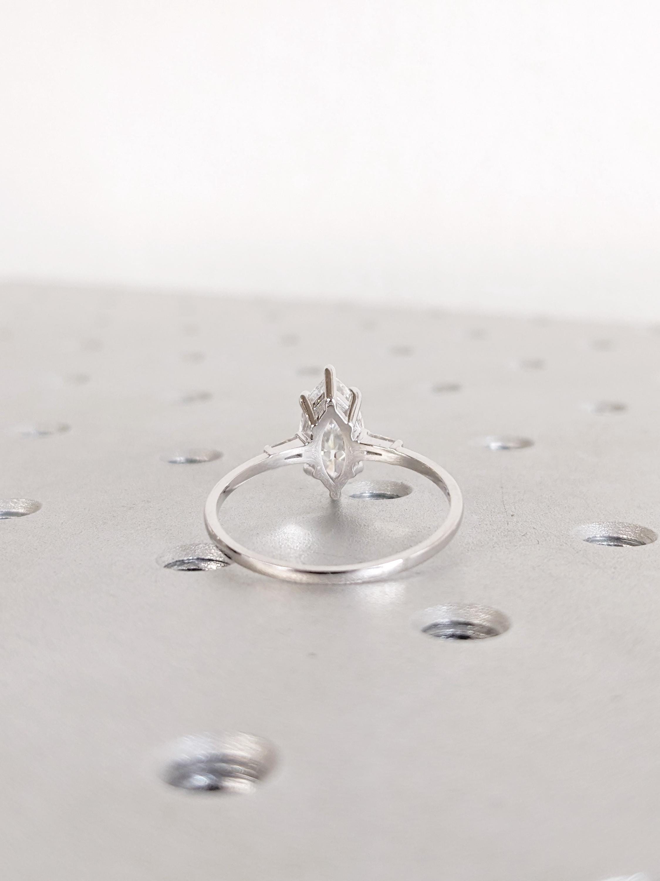 This Lab Diamond engagement ring showcases a brilliant marquise-cut center stone in a prong setting, gracefully accented by tapered baguette side stones of Moissanite or Natural Diamond. The design blends timeless beauty with modern sophistication, making it a stunning choice for an engagement, bridal jewelry, anniversary gift, or an elegant ring for everyday wear