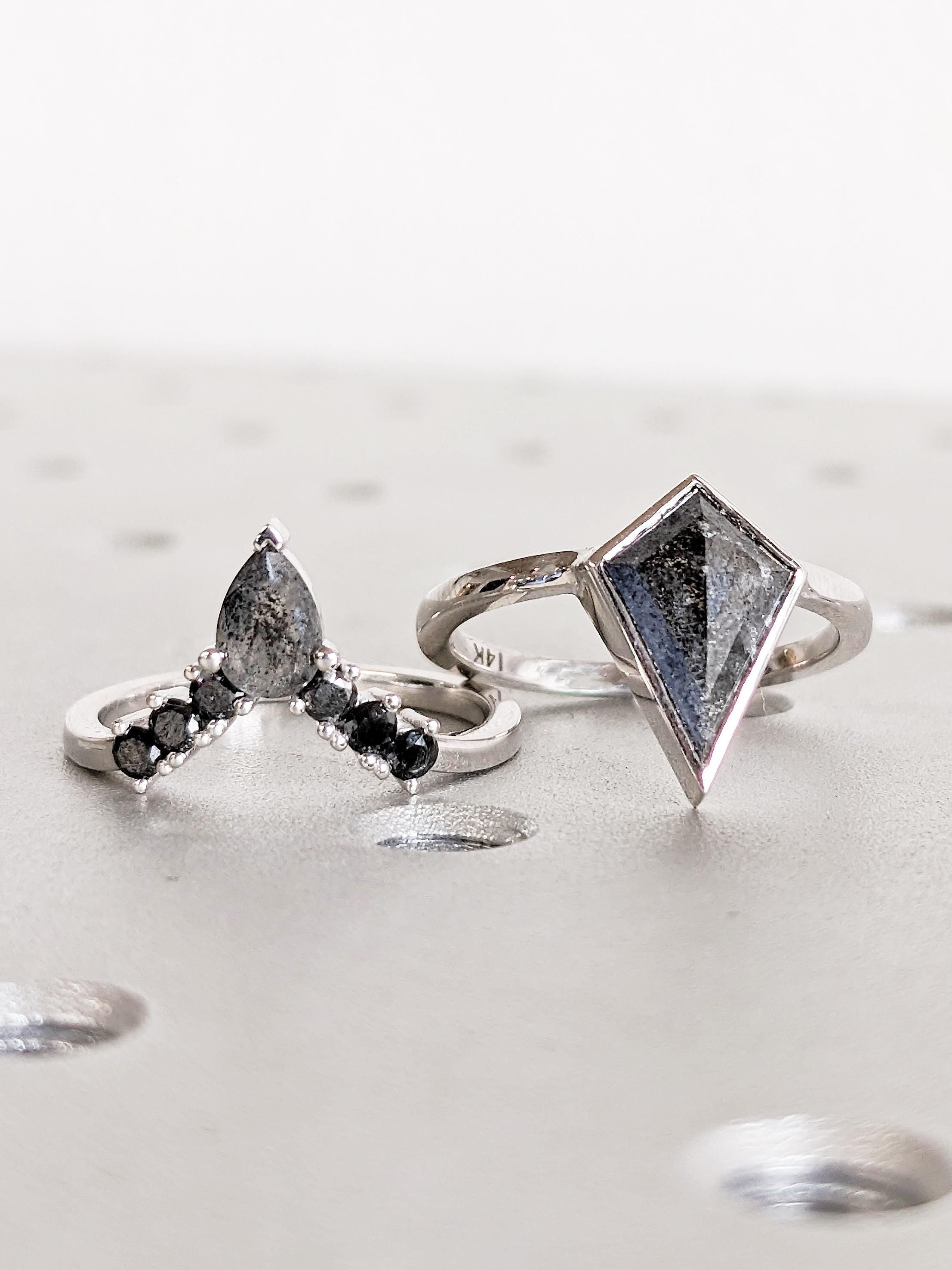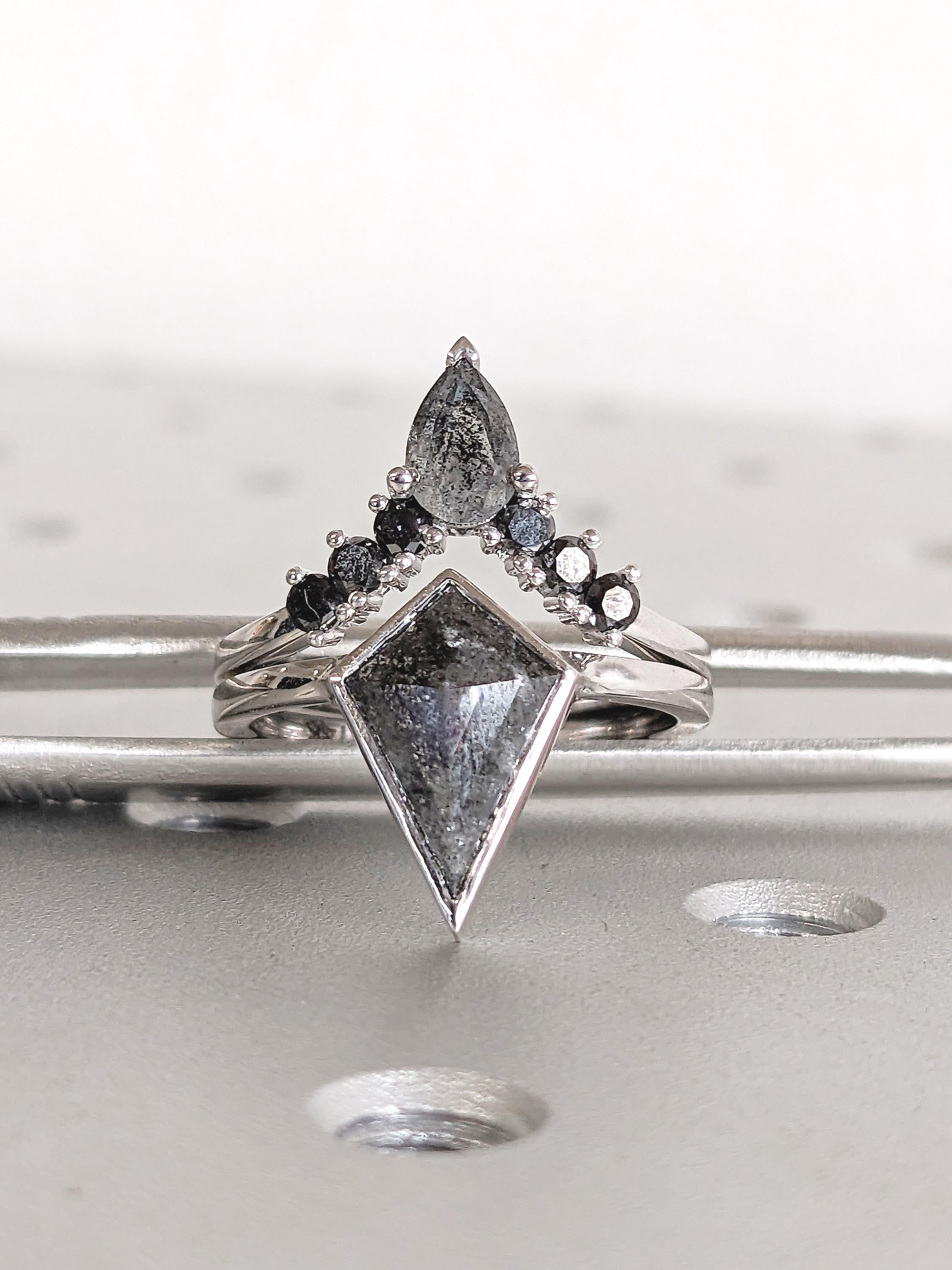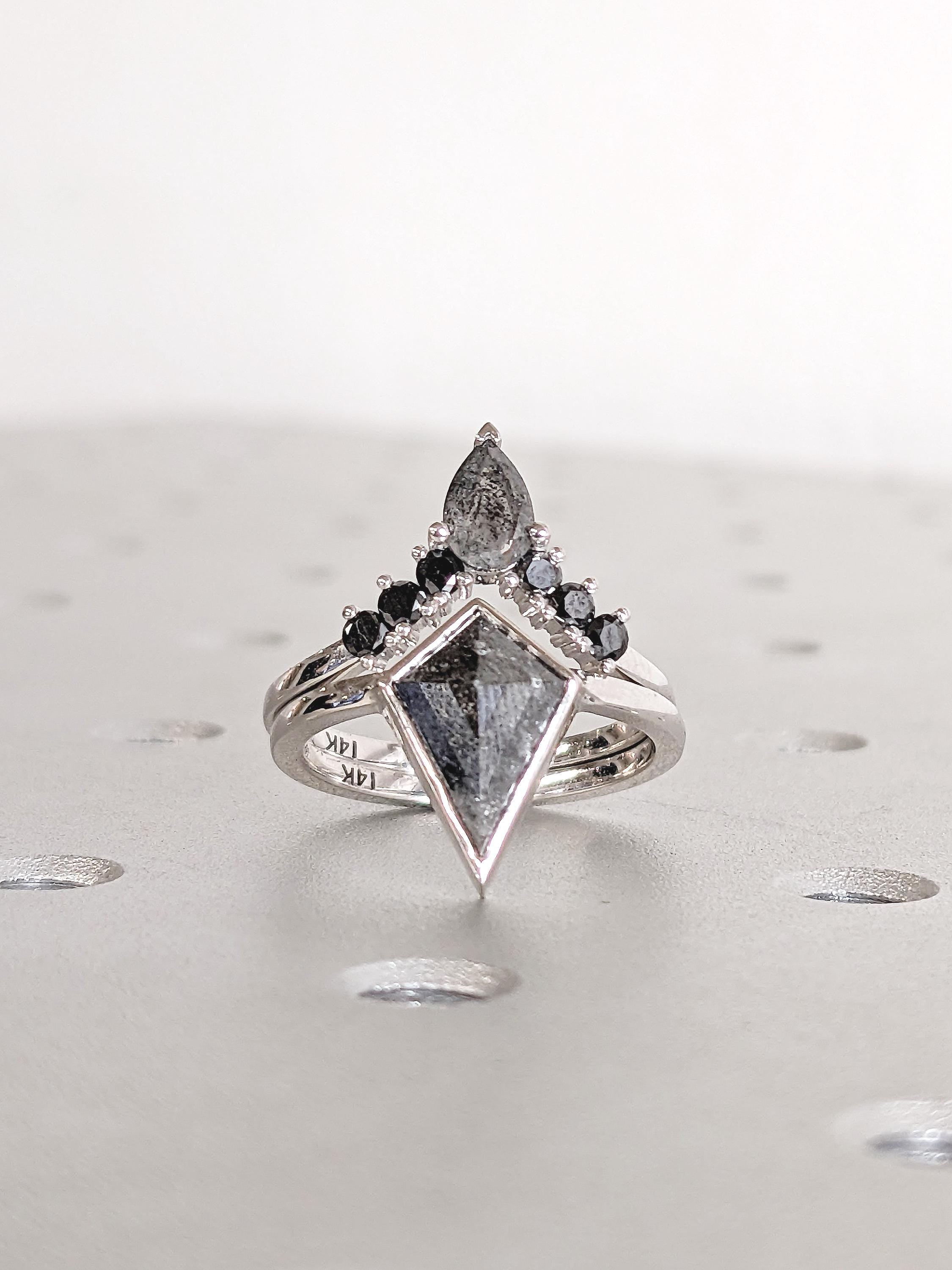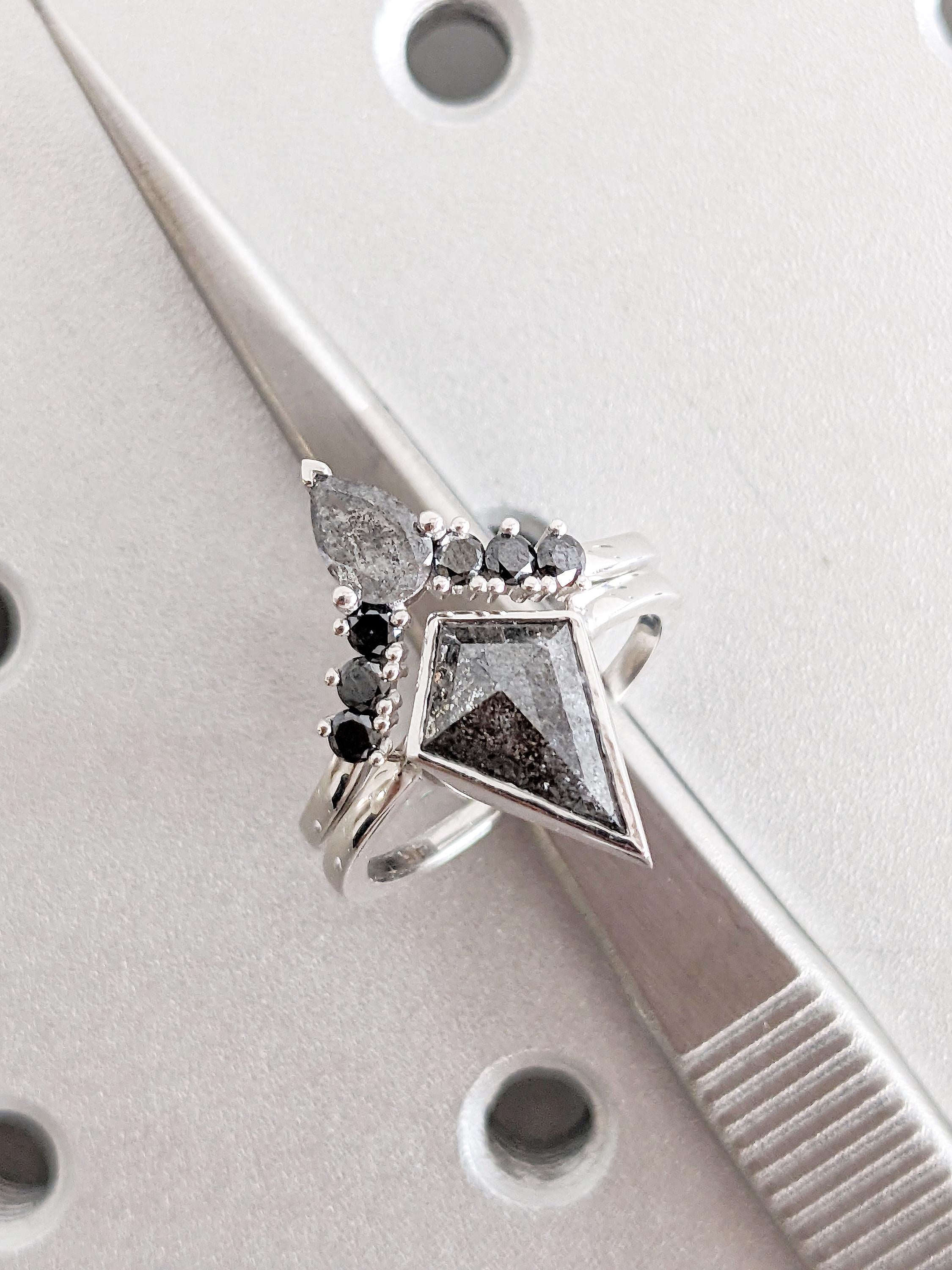 This modern bridal set features a kite-cut Salt and Pepper Diamond engagement ring in a sleek bezel setting, paired with a chevron band adorned with a pear-cut Salt and Pepper Diamond and round Black Diamonds. This is ideal for a bride who dares to be different.