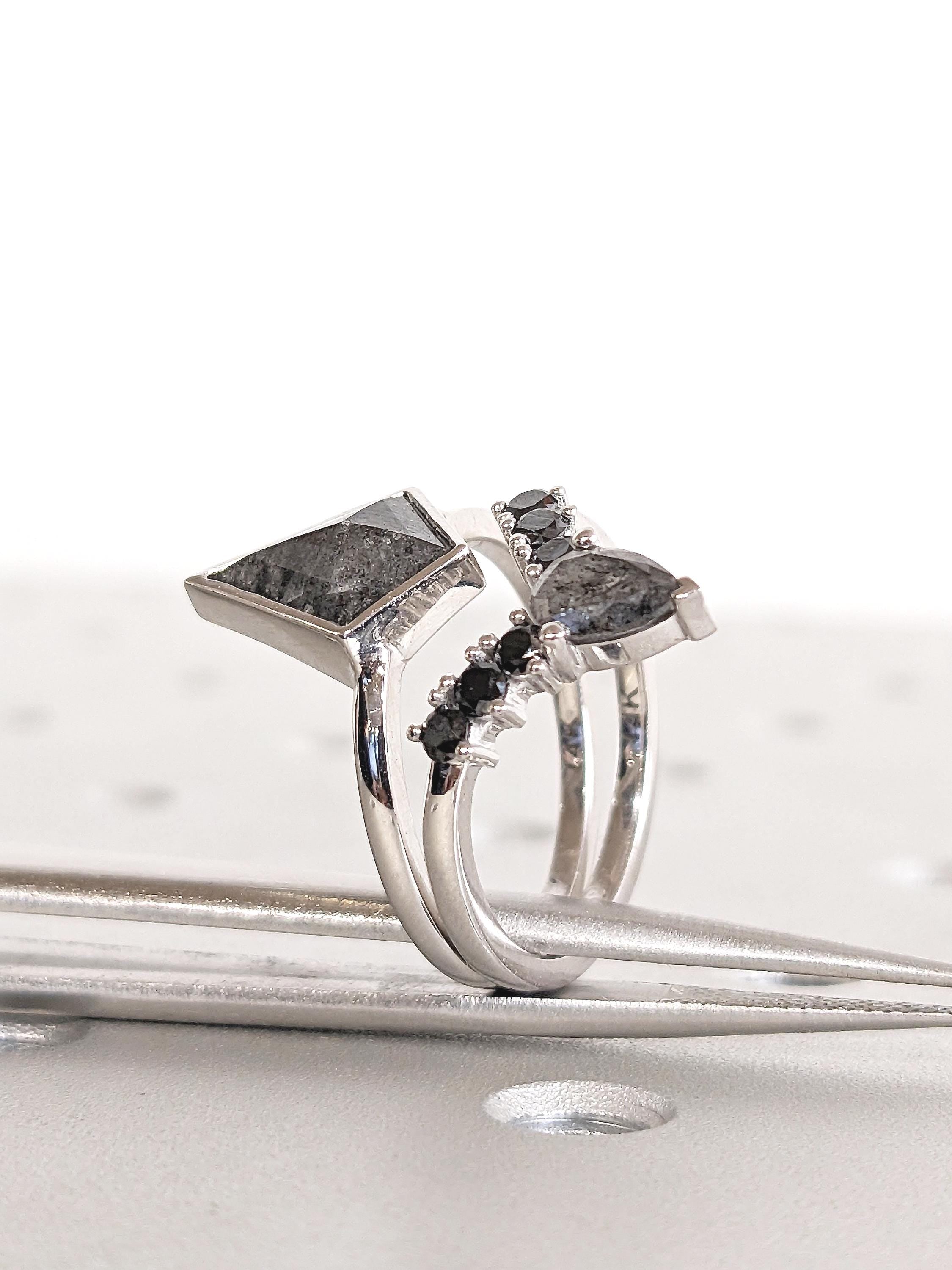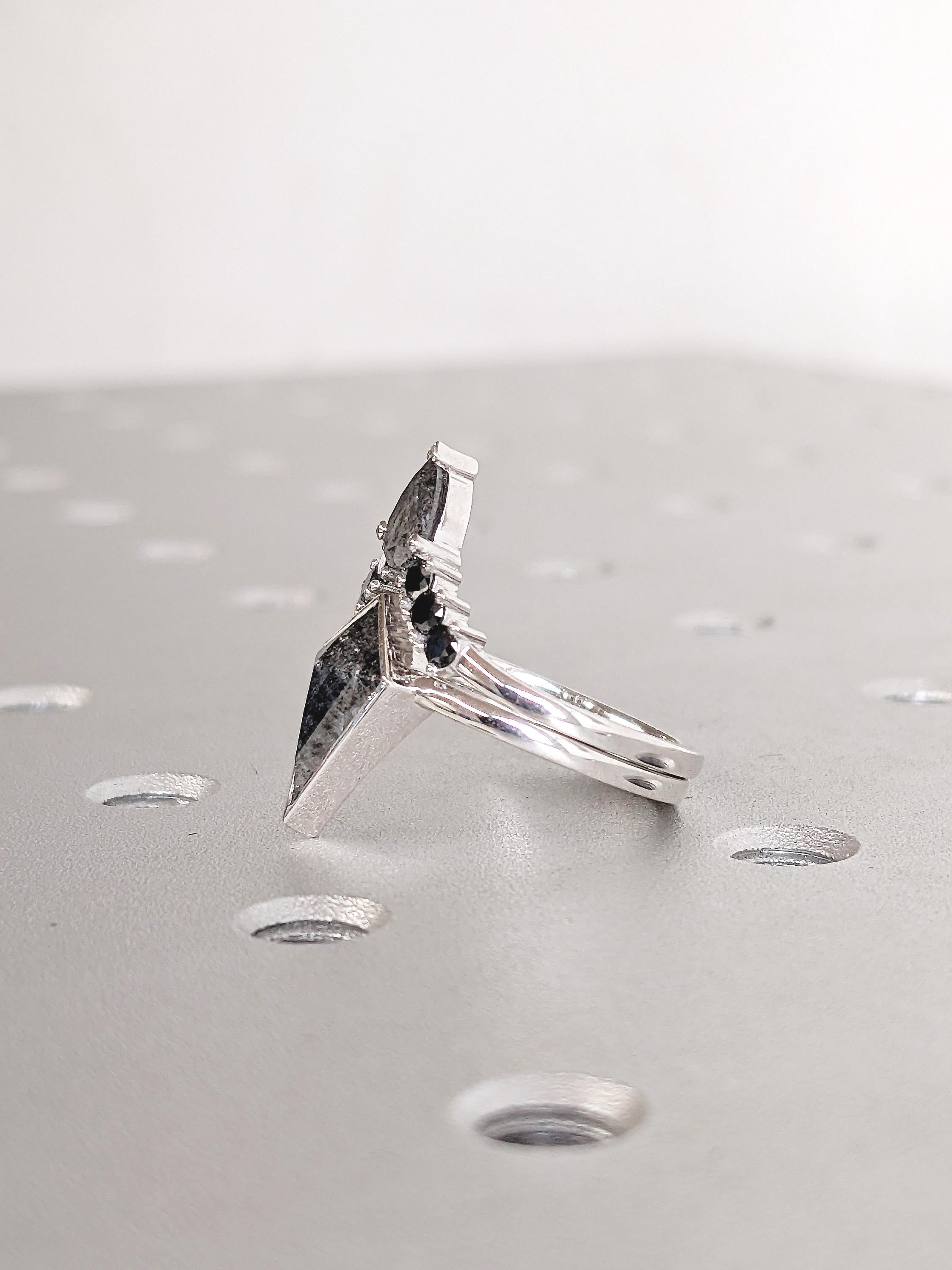 Kite Cut Salt and Pepper Diamond Engagement Ring Set, 14k White Gold Ring, Diamond Statement Ring, Black Diamond Wedding Ring, Bridal Ring