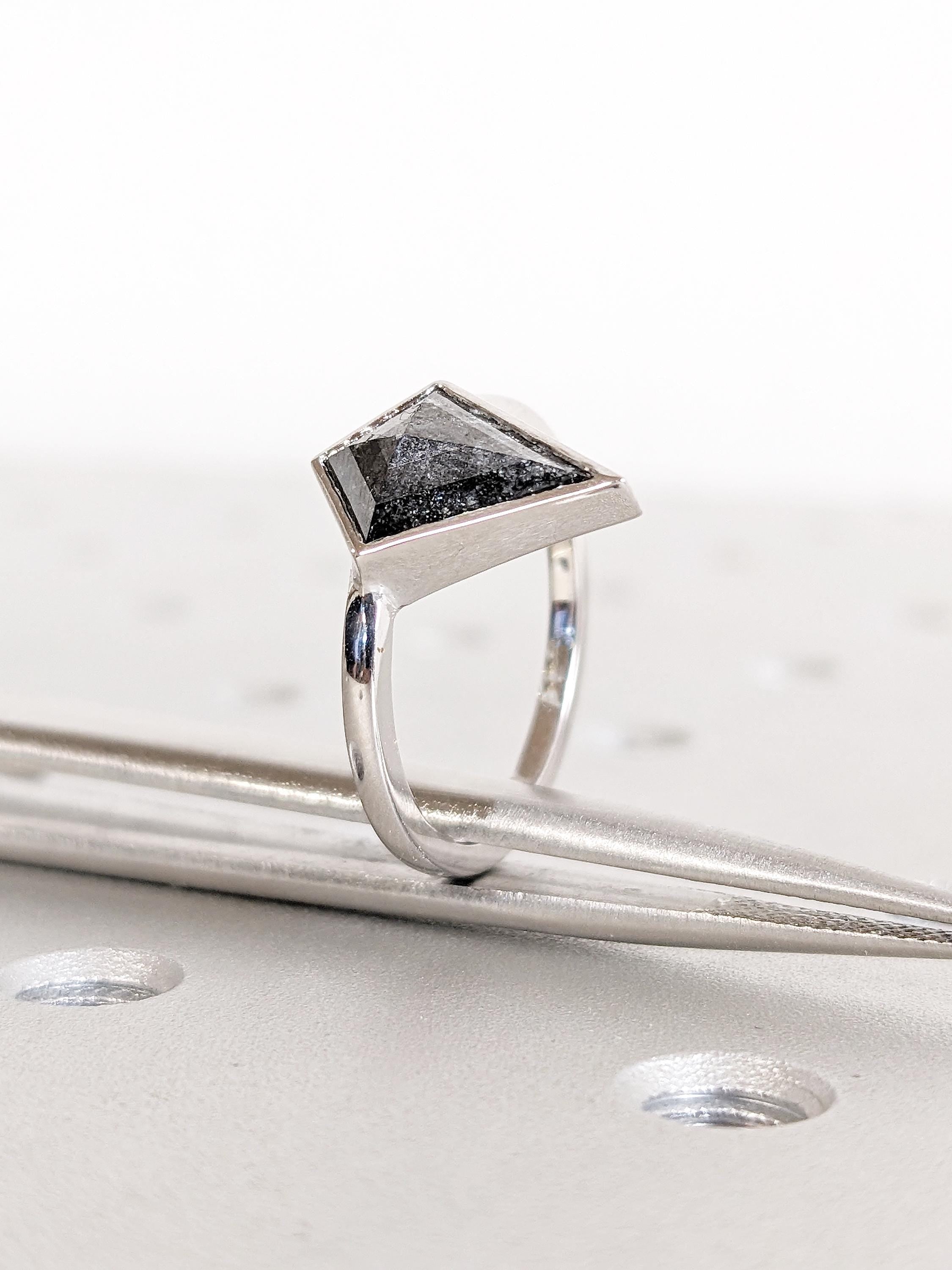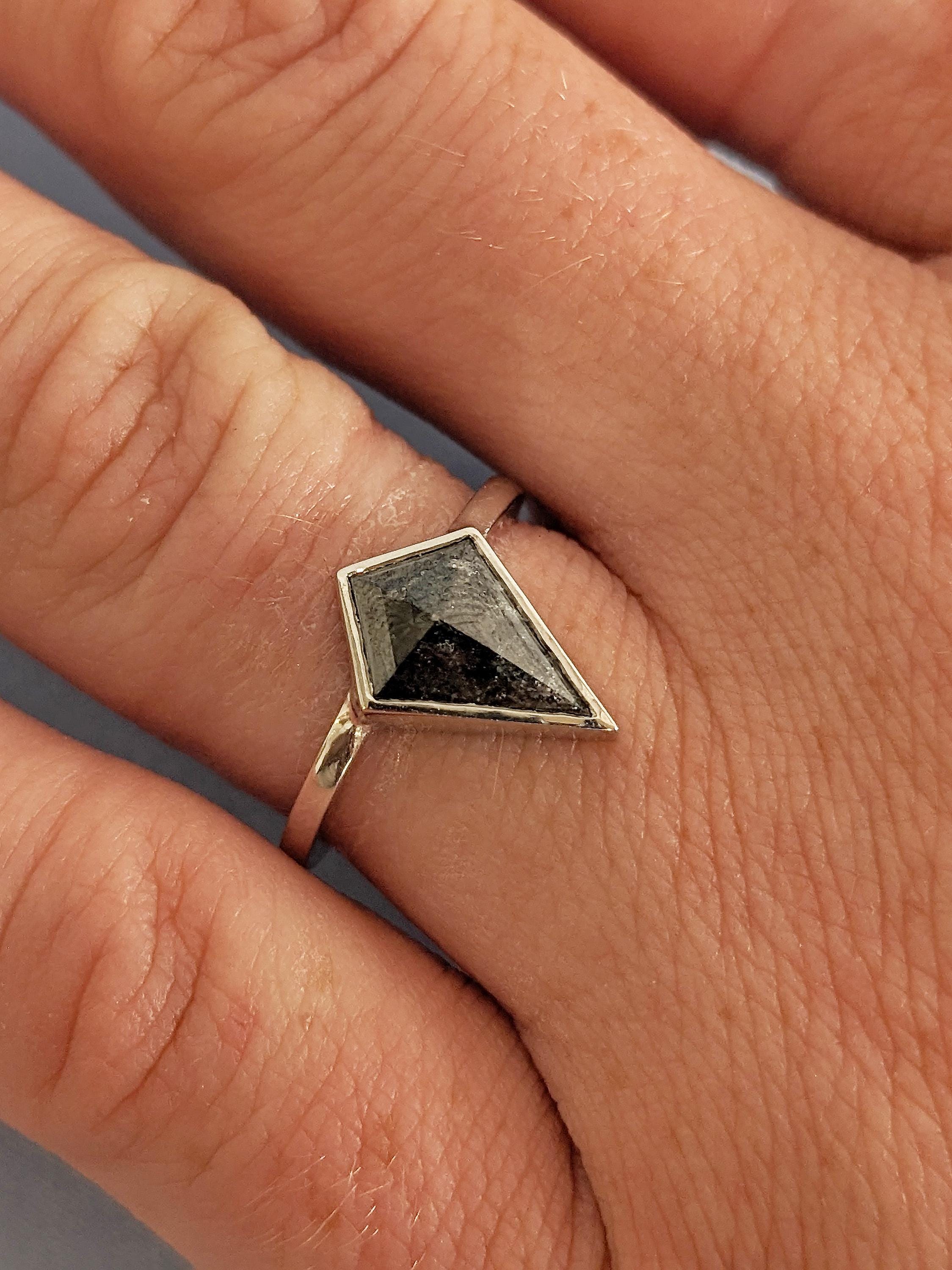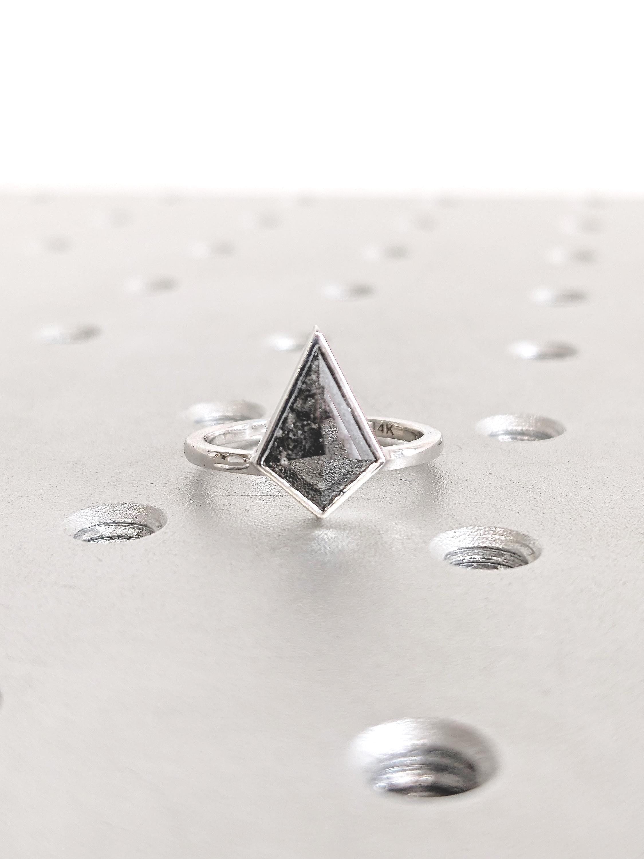 Kite Cut Salt and Pepper Diamond Ring, Bezel Engagement Ring, 14k White Gold Ring, Solitaire Ring, Big Statement Ring, Promise Ring for Her