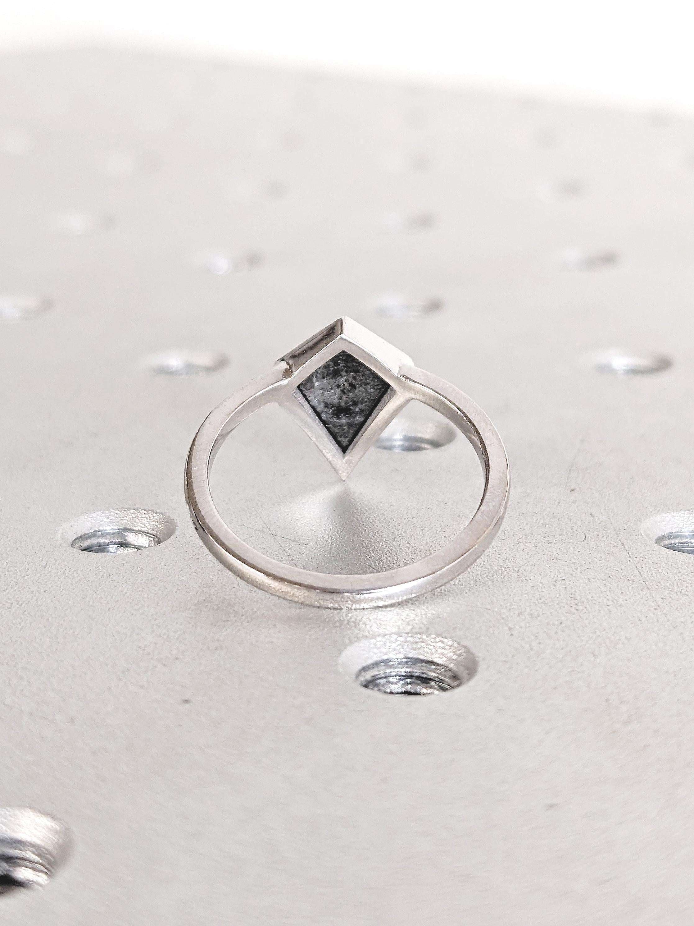 This modern engagement ring features a kite-cut Salt and Pepper Diamond, set securely in a sleek bezel setting that highlights the stone’s unique inclusions and geometric shape. The minimalist band complements the diamond’s edgy design, creating a perfect balance of sophistication and bold, contemporary style. Ideal for the bride who loves individuality and modern elegance.