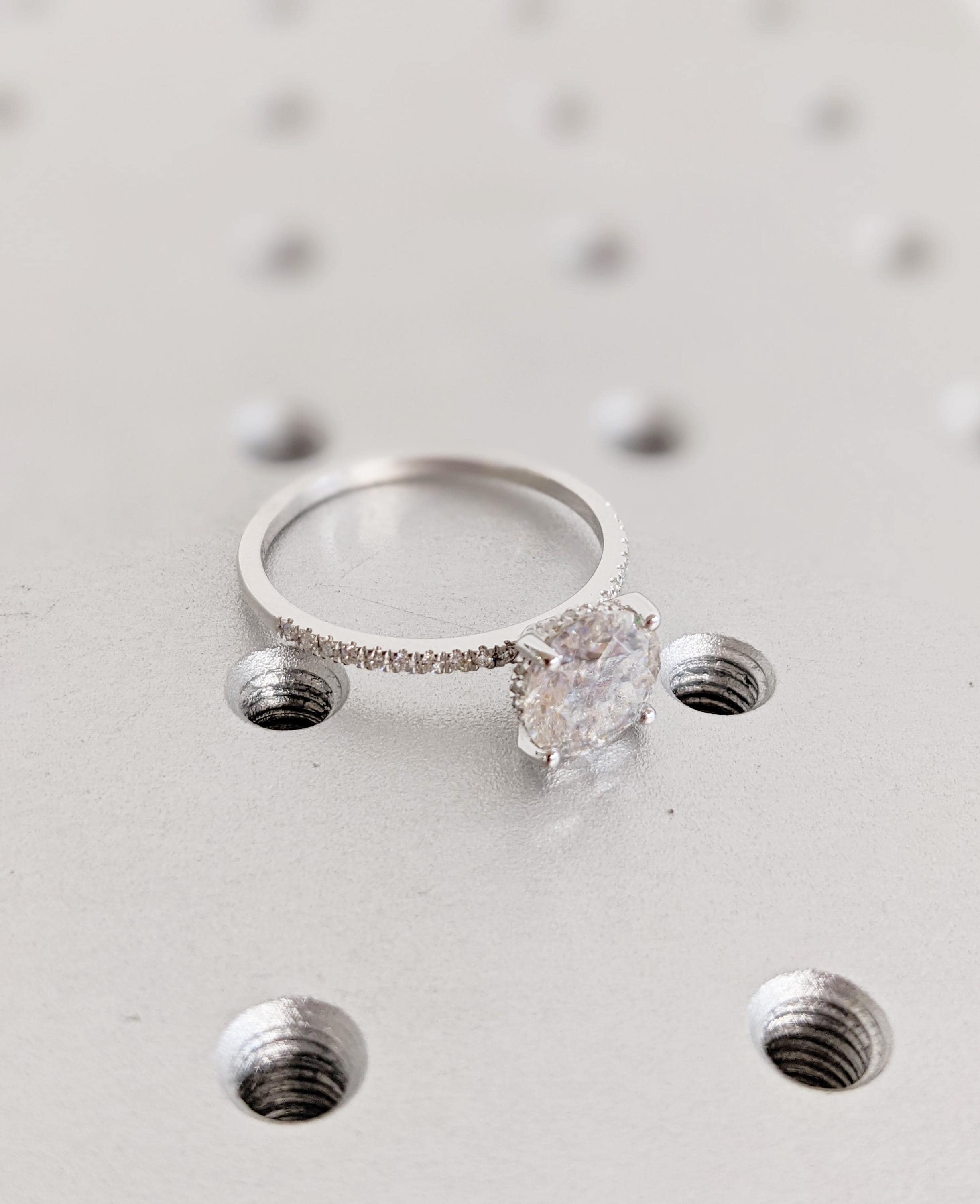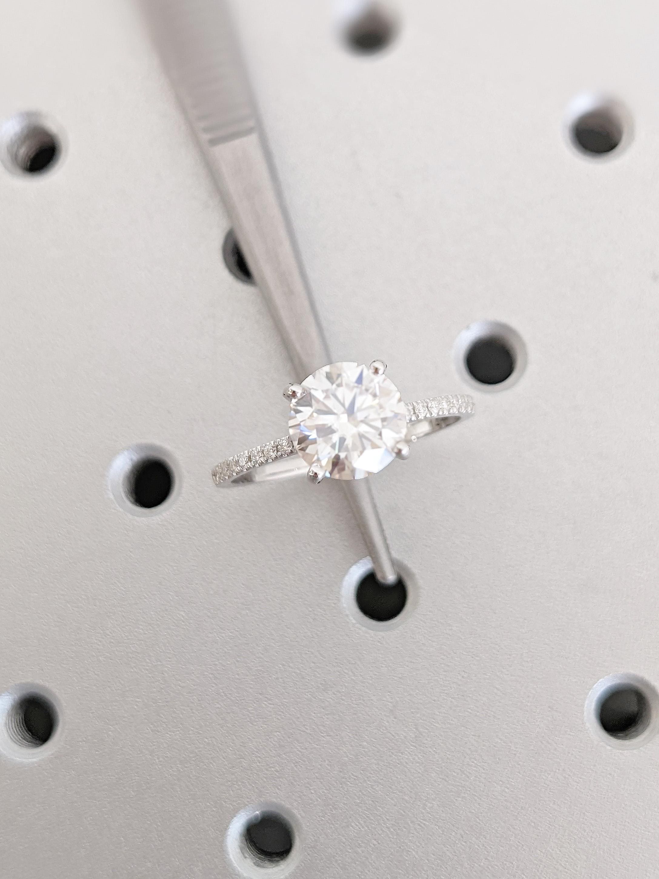 Lab Diamond Engagement Ring with Round Cut Center | Hidden Halo Setting | Half Eternity Pave Band | 14K White Gold Wedding Ring for Brides