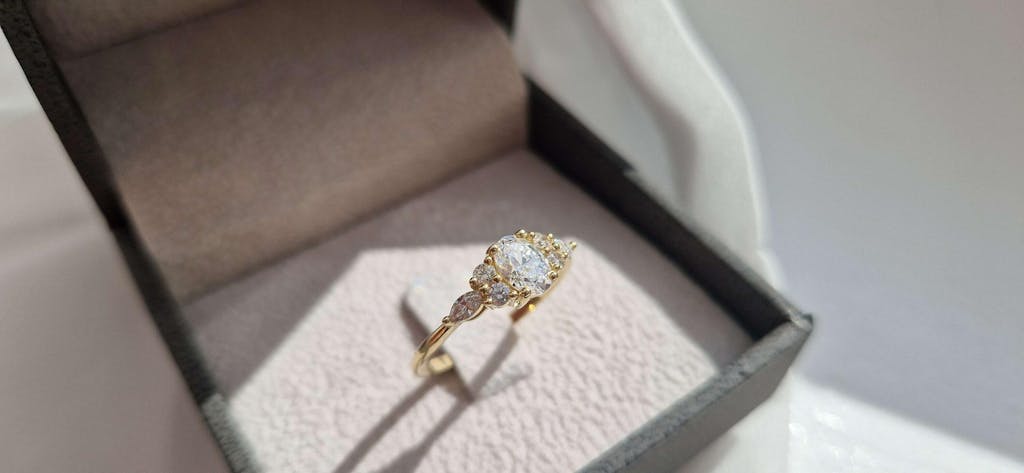 Enhance your collection with a stunning oval-cut lab-grown diamond, complemented by clusters of marquise and round-shaped side stones. Select from a range of exquisite diamond or brilliant moissanite options to elevate your choice.