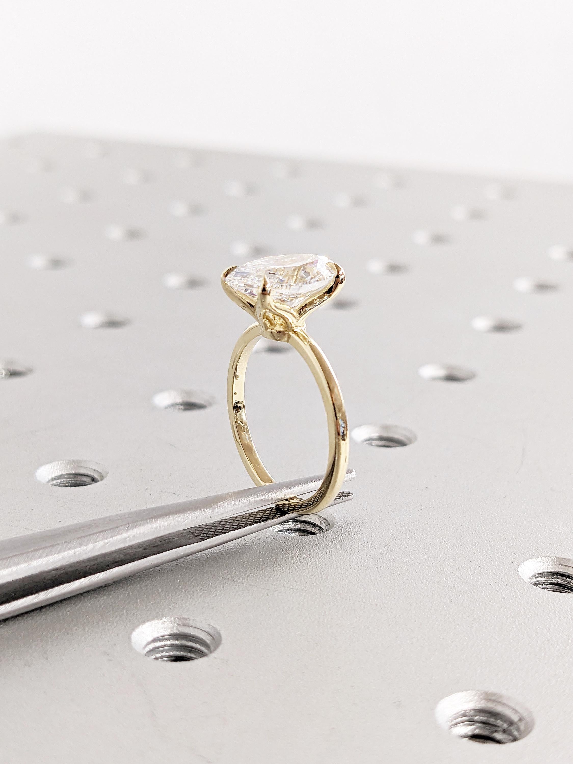 A timeless solitaire ring, features an oval cut Lab Grown Diamond center stone, elegantly held on a tulip style open basket with talon prong setting, on a delicate thin band of 1.5mm width. This minimalist nature inspired jewelry, makes a great gift for engagement, wedding anniversary or birthday.