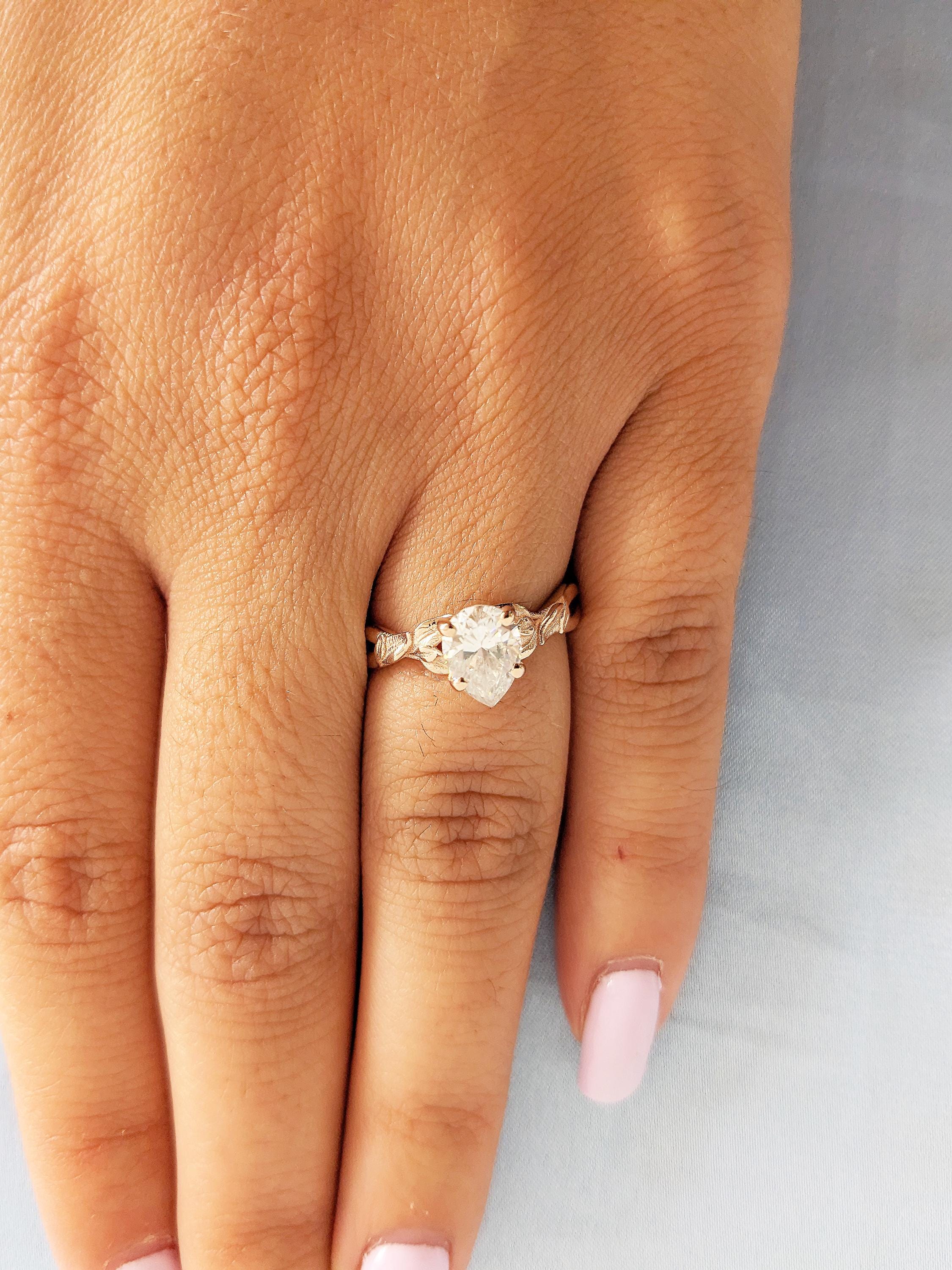 Nature inspired split shank ring, with intertwined leaves and twigs that holds a pear cut Lab Grown Diamond solitaire center. A charming combination of modernity and vintage flair, this statement jewelry makes a wonderful complement to your style for any occasion.