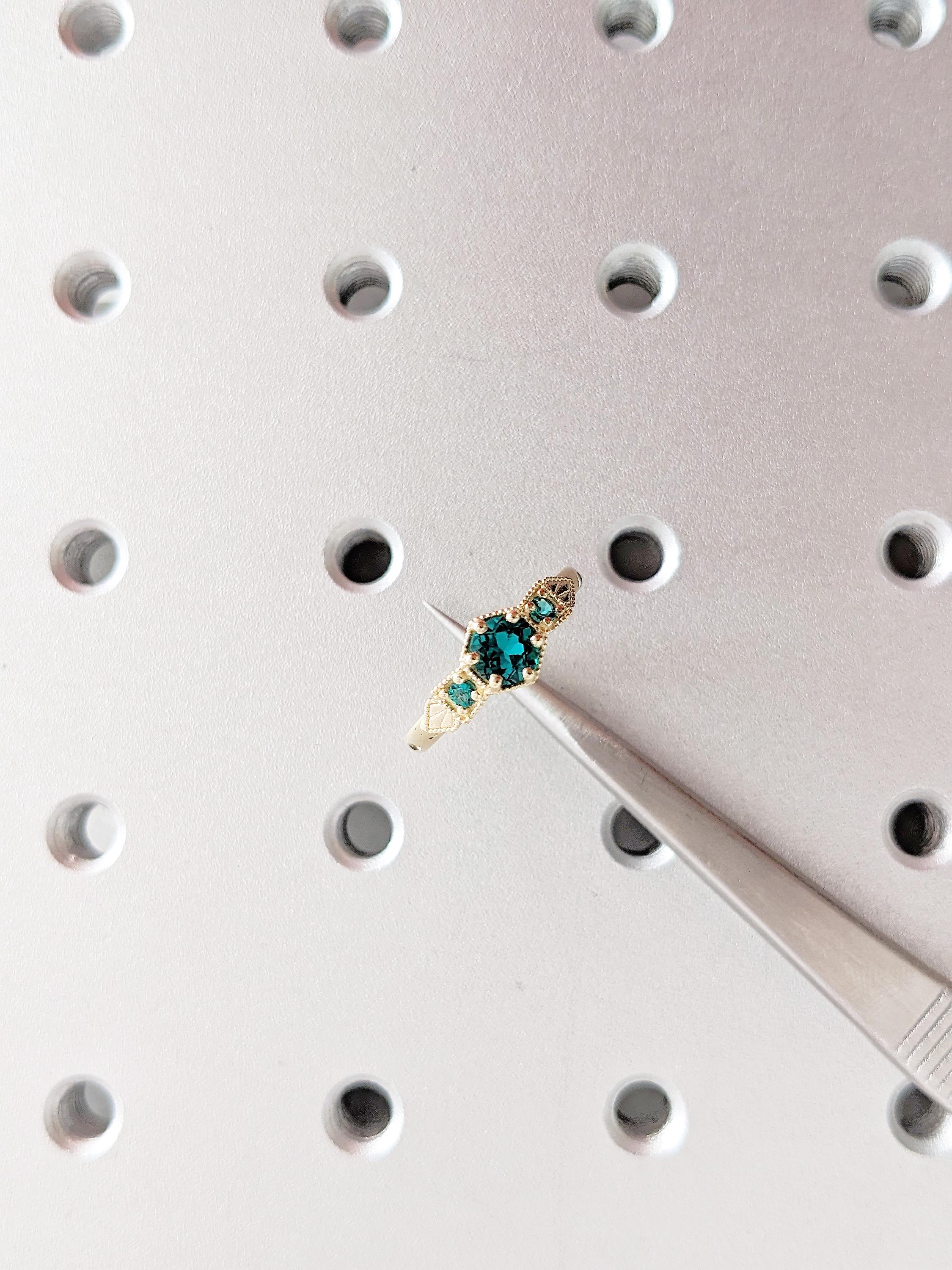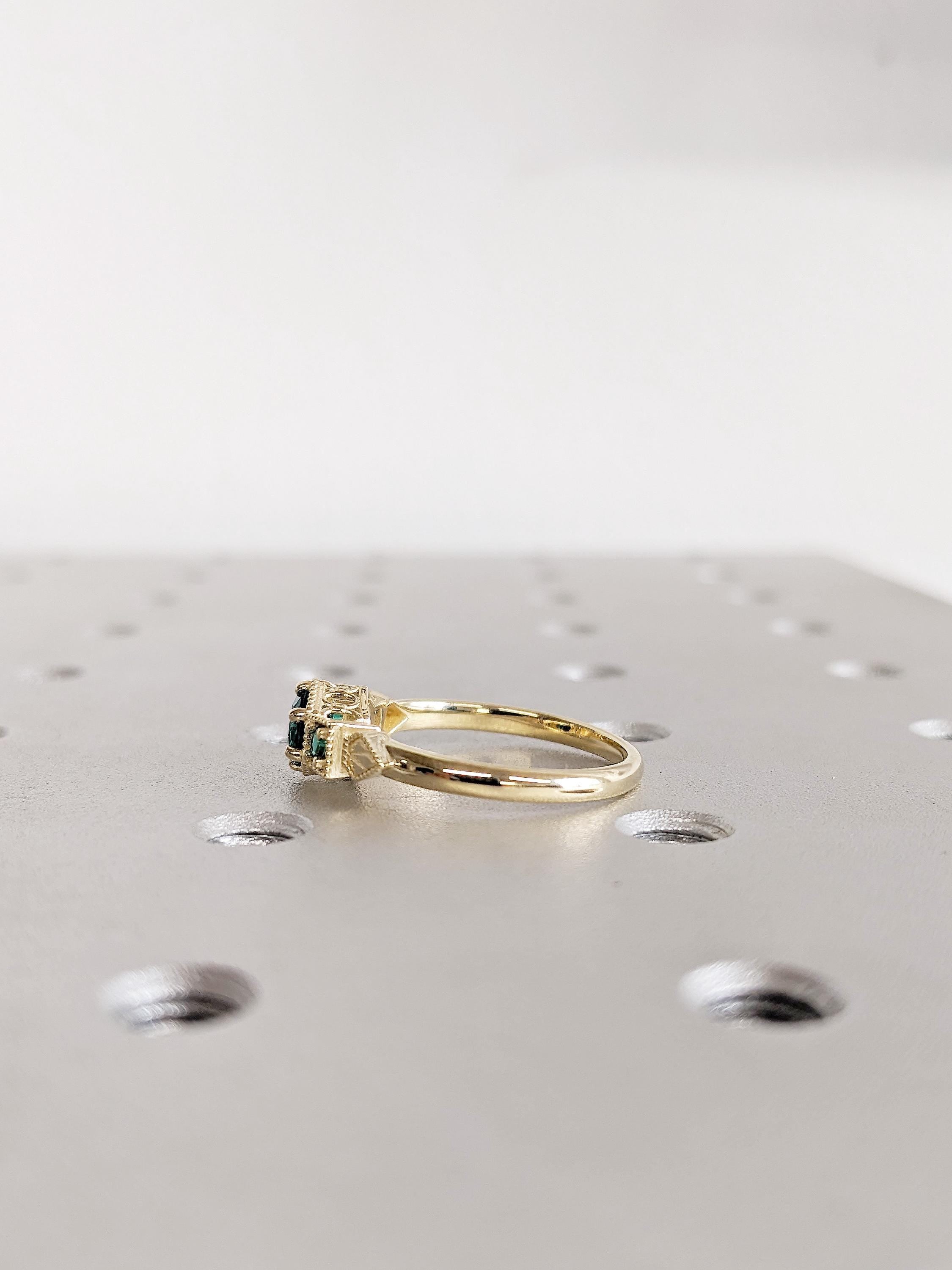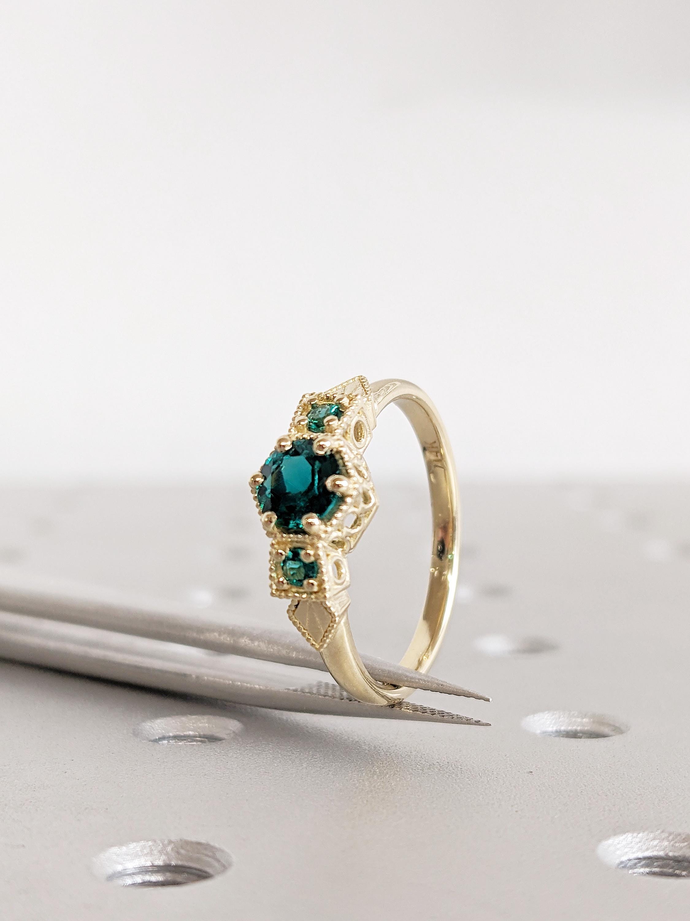 Lab Emerald Engagement Ring, 14K Yellow Gold Vintage Milgrain Green Emerald Ring, Three Stone Round Art Deco Prong Set May Birthstone Ring