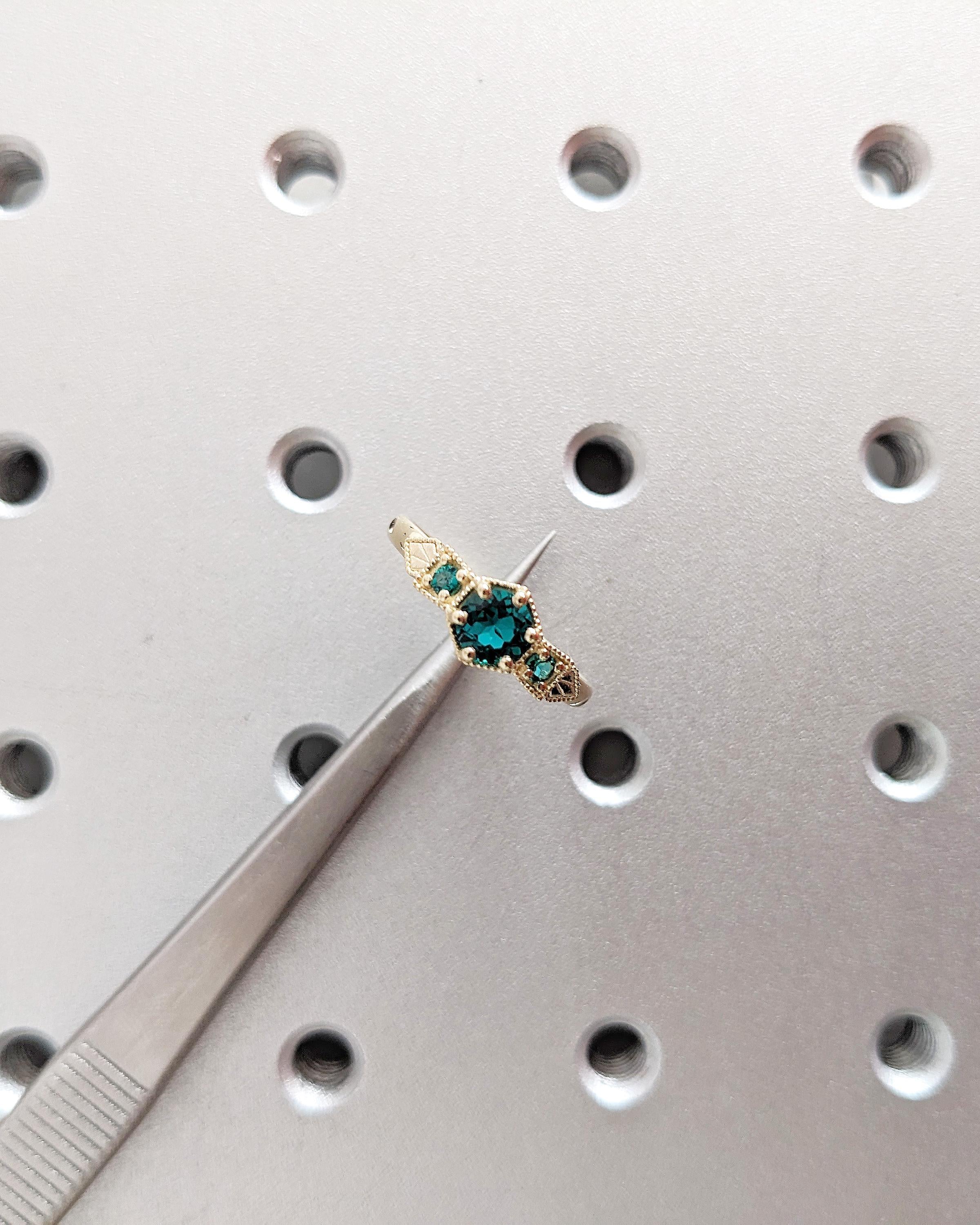 Lab Emerald engagement ring with round cut center stone in prong setting, enhanced by round Lab Emerald side stones for a vintage-inspired design. The intricate detailing adds timeless character, making it a standout heirloom-style piece. Perfect as an engagement or bridal ring, it also makes a meaningful anniversary or everyday wear jewelry gift with classic elegance.