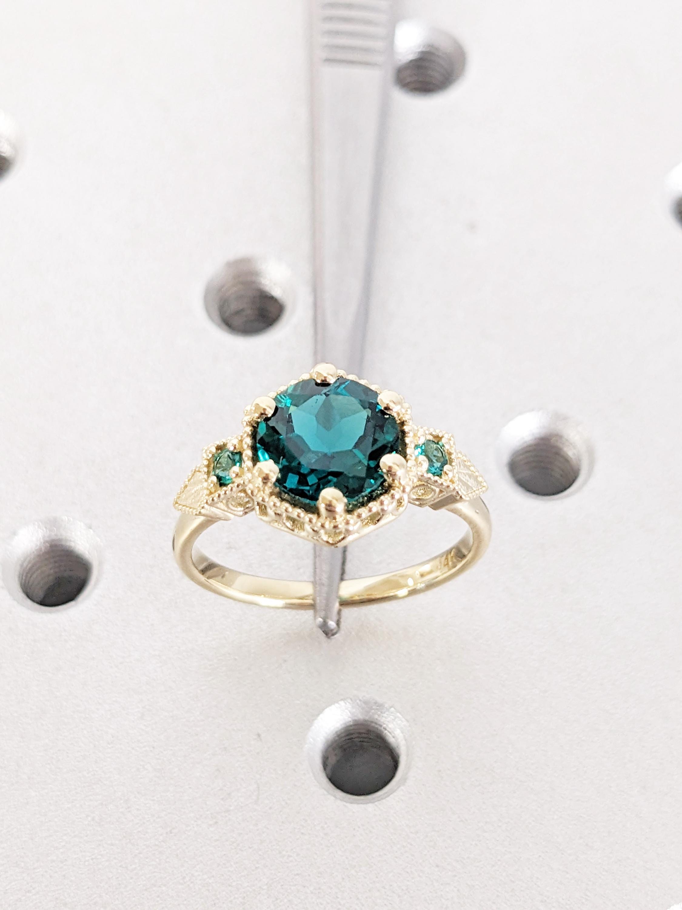 This engagement ring features a round-cut Lab Emerald center stone in a prong setting with round Lab Emerald side stones and delicate milgrain detailing. Its green glow and vintage charm make it a beautiful symbol of love and commitment, perfect as an engagement ring, anniversary ring, wedding ring, promise ring or a meaningful gift from the heart.