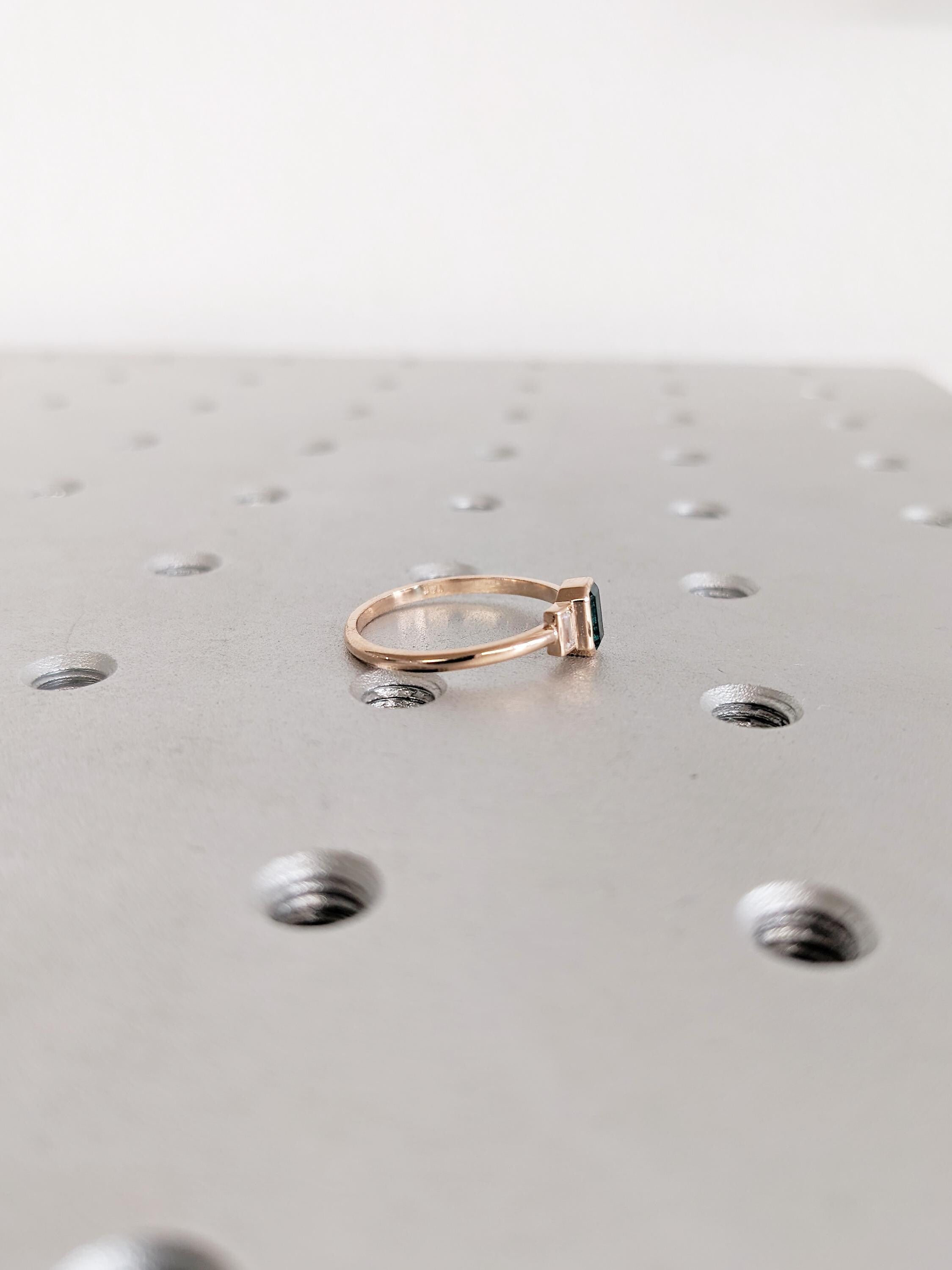 This three-stone engagement ring showcases a bezel-set, emerald-cut Lab Grown Emerald at its center, flanked by bezel-set baguette-cut Moissanite or Natural Diamonds. Set on a delicate gold band, this ring radiates elegance and sophistication.