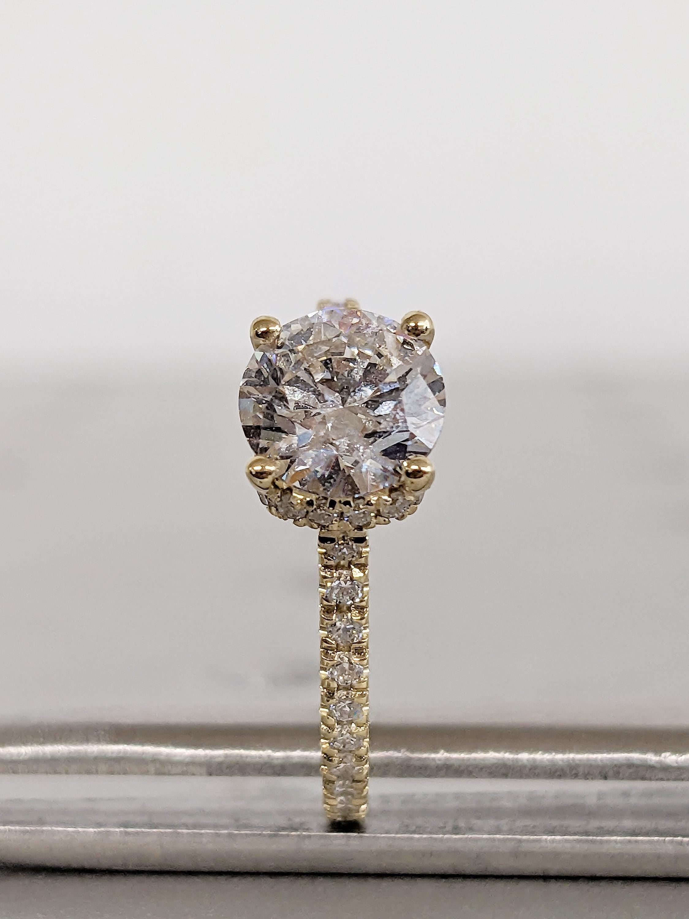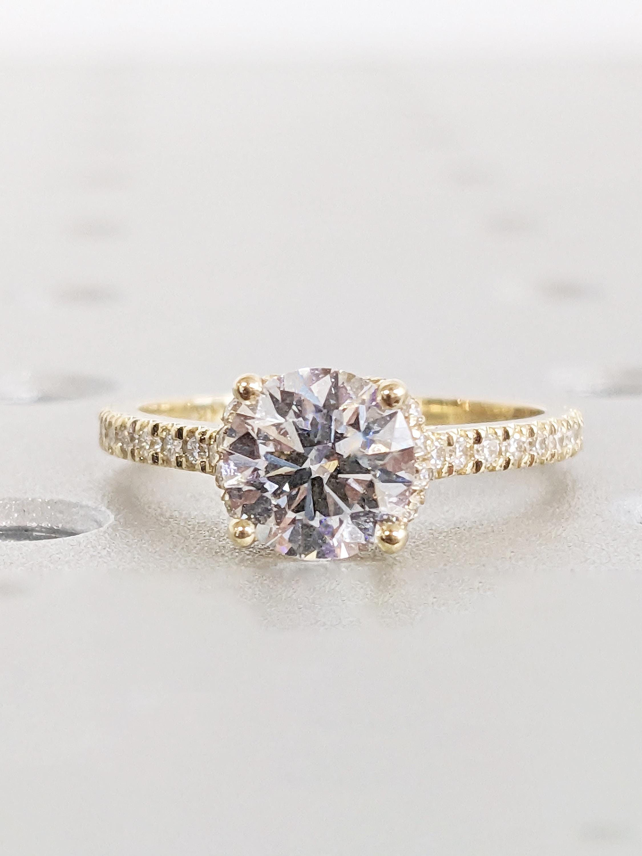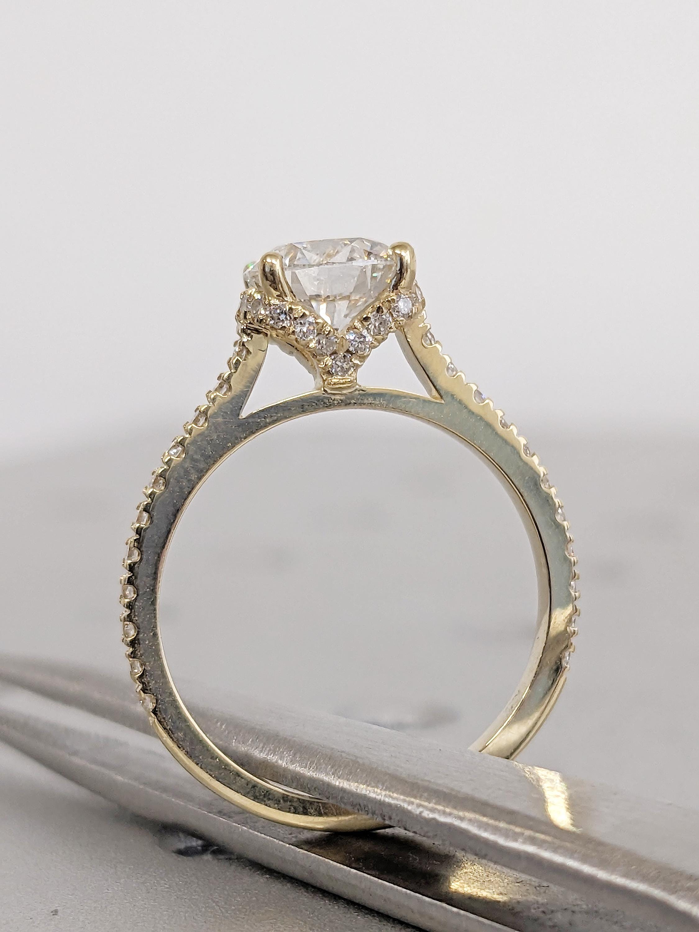 This elegant engagement ring features a round-cut Lab Grown Diamond at its center, encircled by a hidden halo for a subtle touch of sparkle. The slender gold band is adorned with a half-eternity row of dazzling stones. Both the hidden halo and the side stones are available in your choice of Natural Diamonds, Lab Grown Diamonds, or Moissanite, offering customizable brilliance to suit your style. A refined design that beautifully balances classic charm and modern allure.