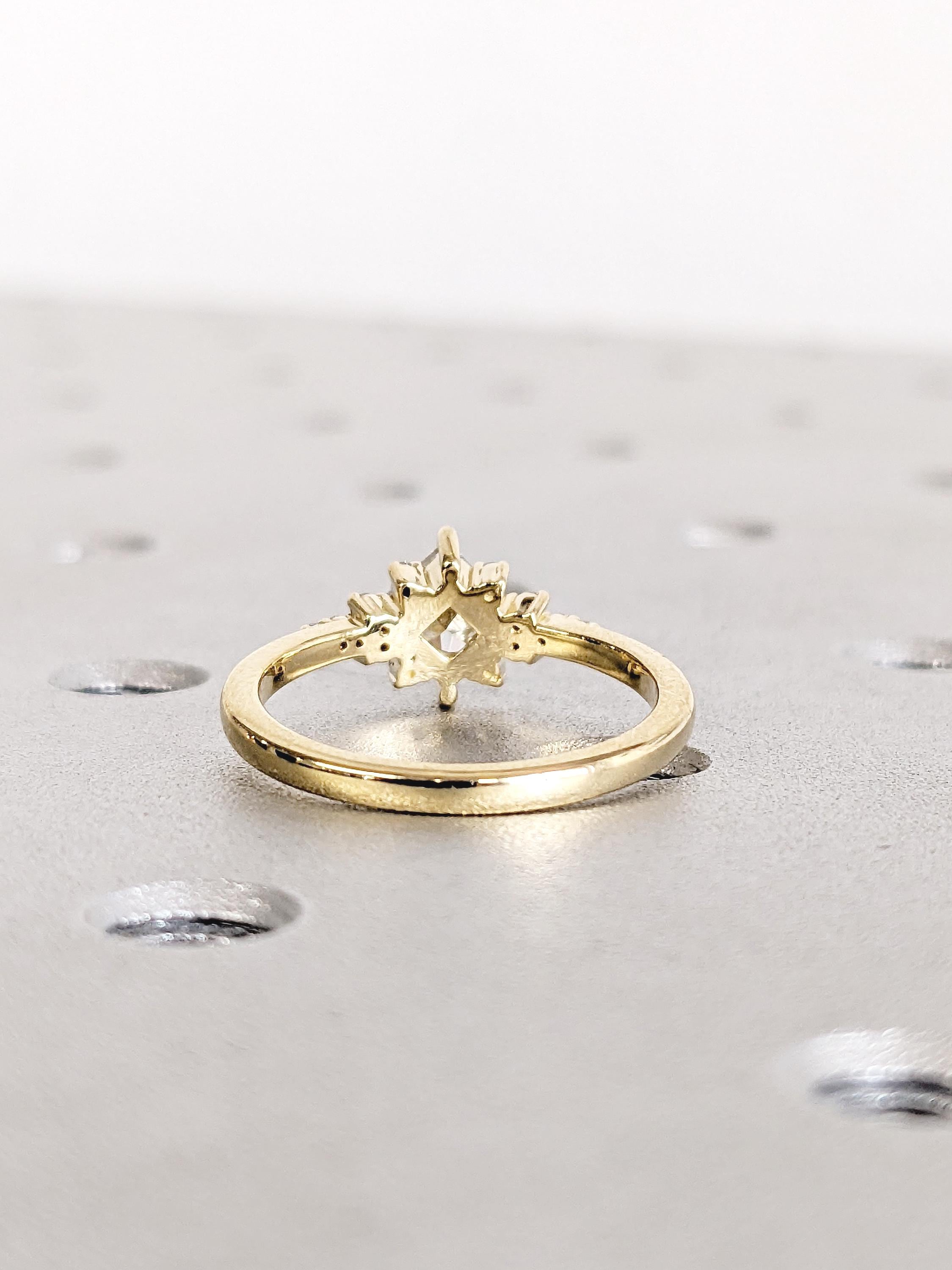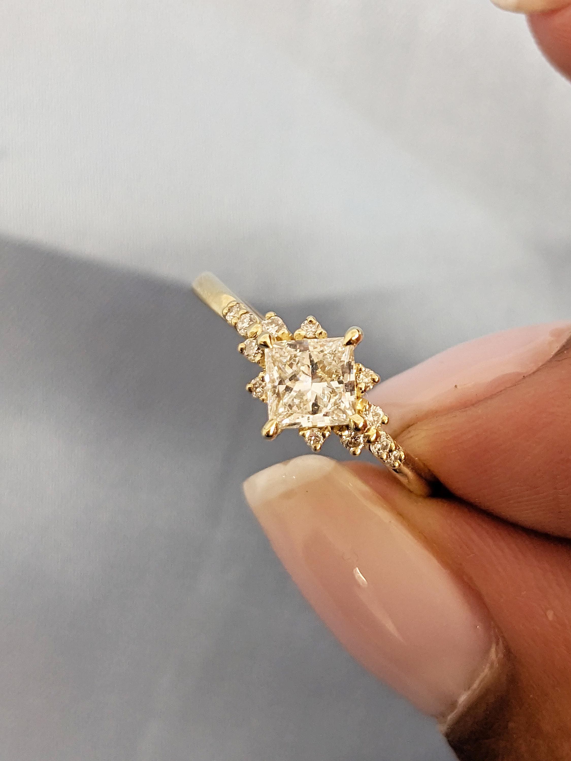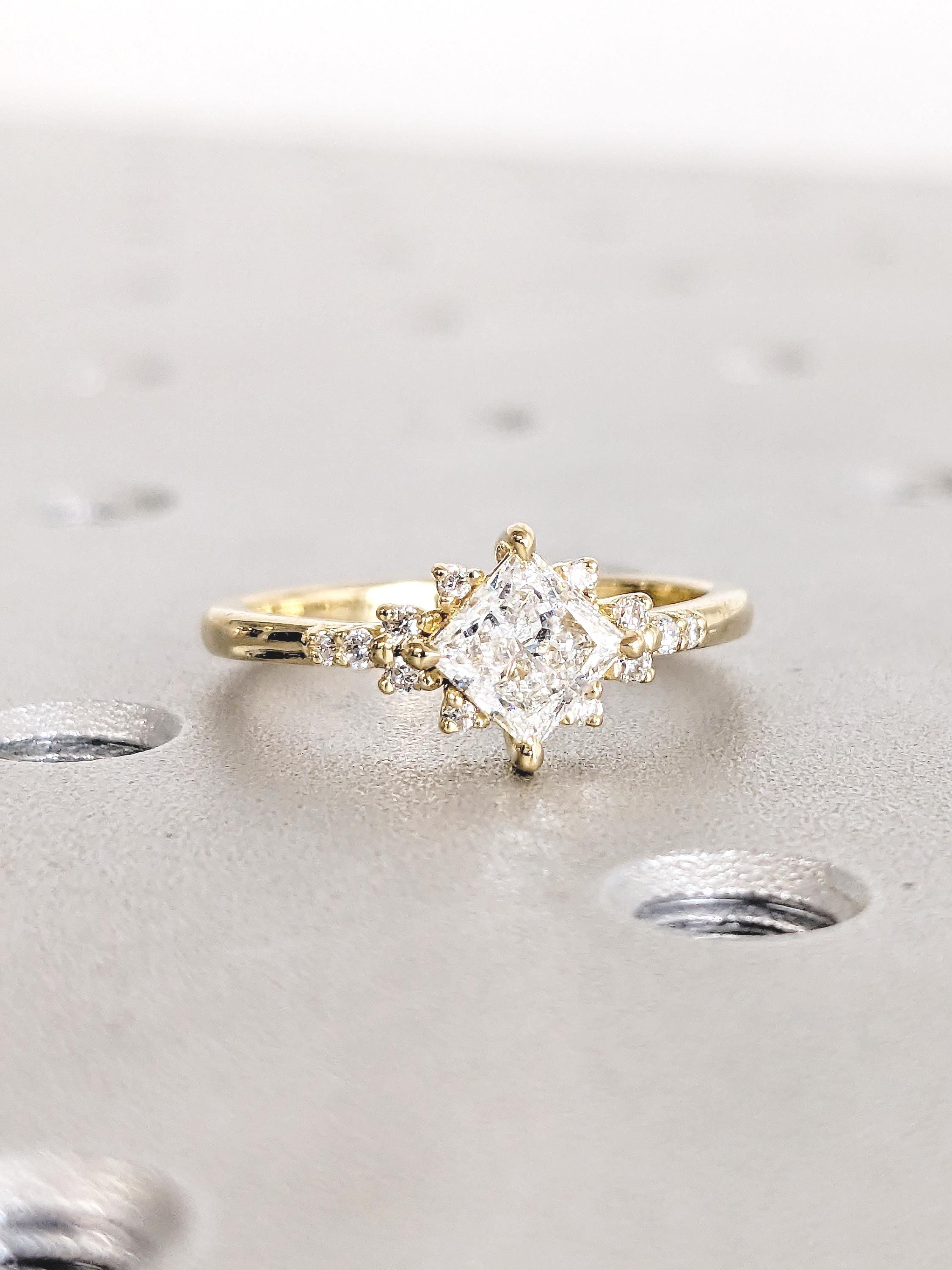 Lab Grown Diamond Engagement Ring, 14k Solid Gold Anniversary Ring, Princess Cut Ring, Unique Starburst Diamond Cluster Ring, Gift for Wife