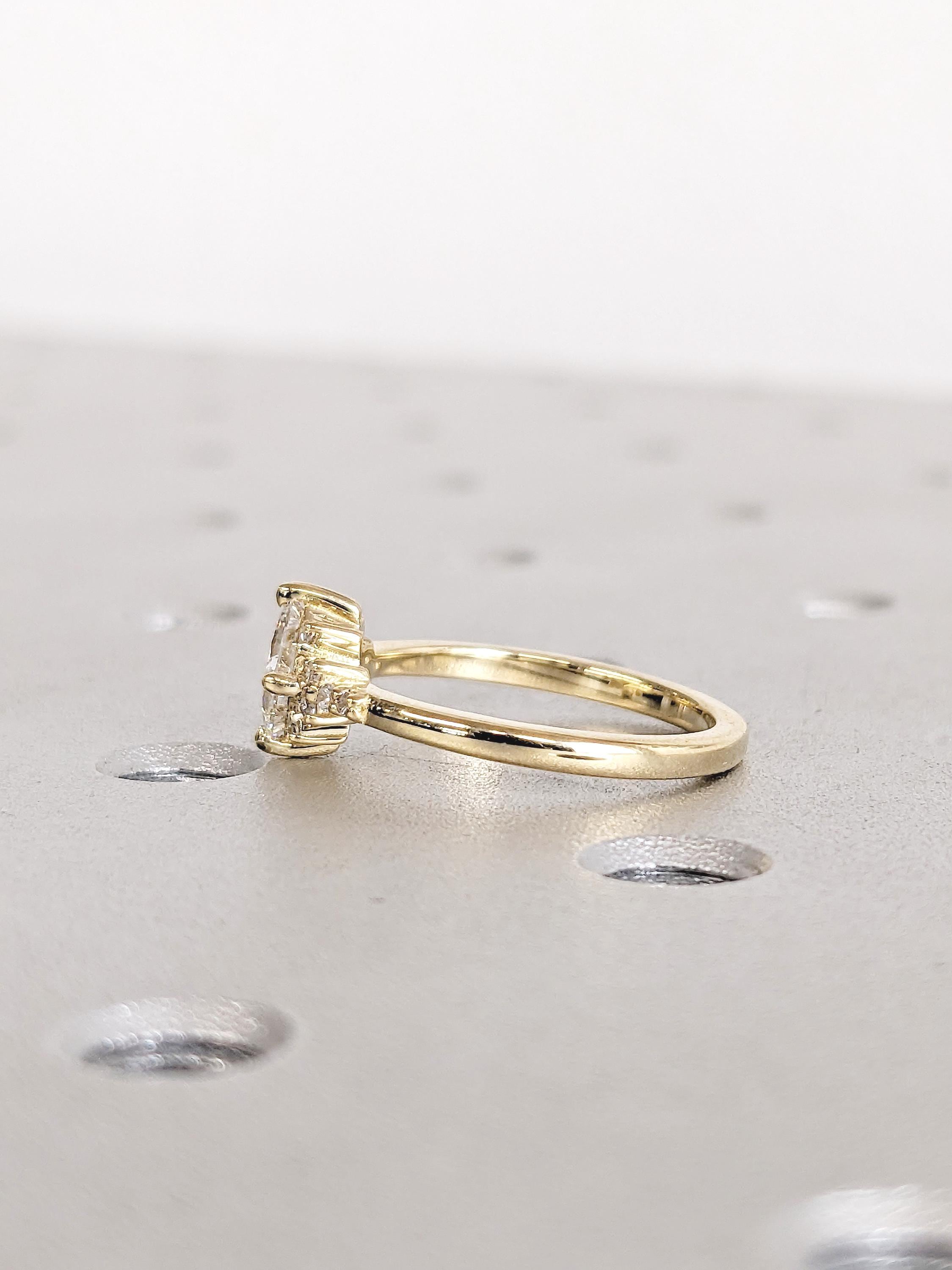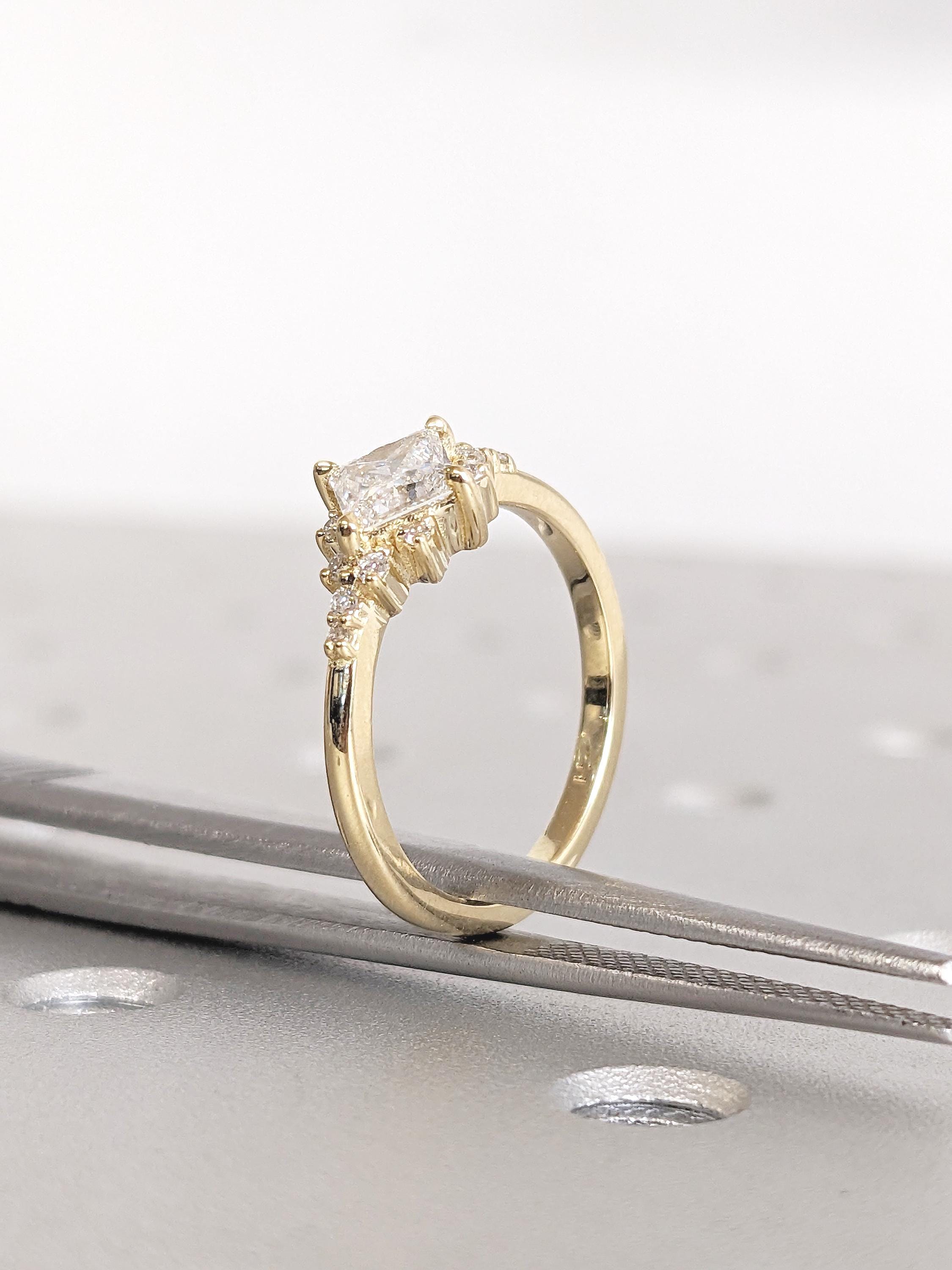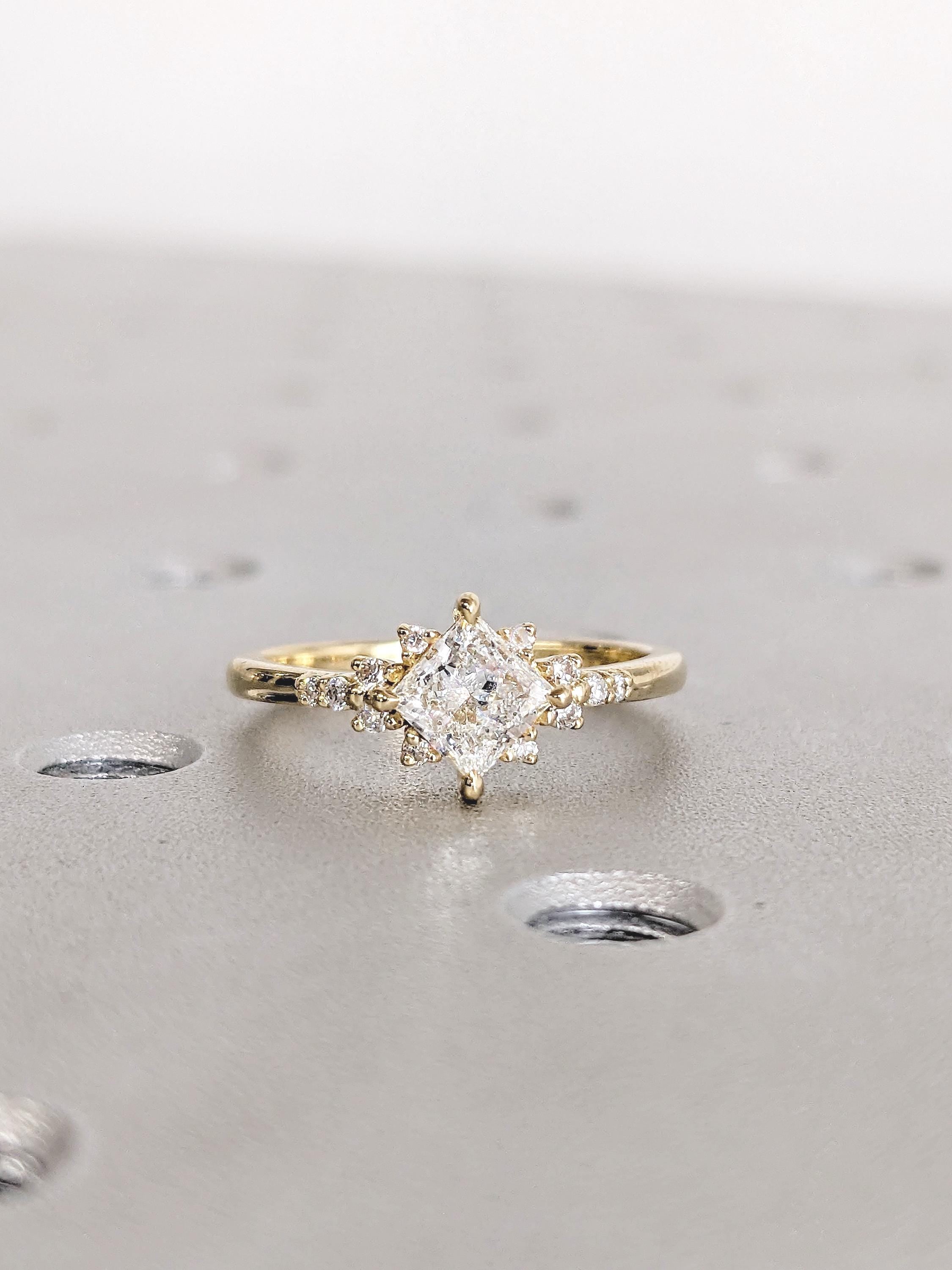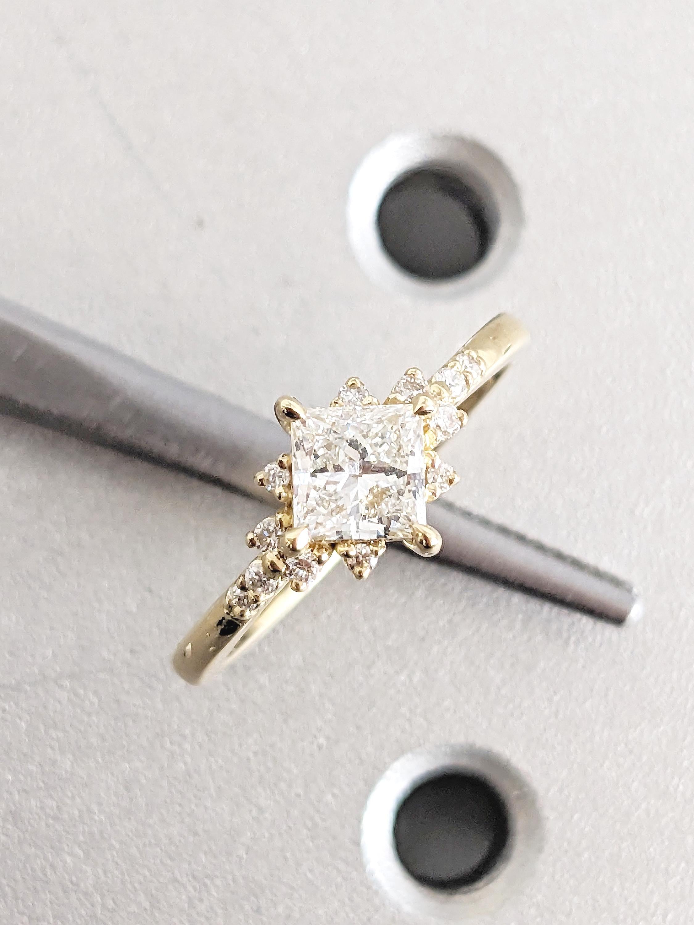 An elegant handmade statement jewelry, features a princess cut Lab Diamond center stone, held gently in a basket setting on a delicate 1.7mm width band. The focal stone is accented by round cut side stones to form an orbital starburst arrangement, adding an extra touch of glitz and glamour to this whimsical solitaire ring. Side stones are available in either natural diamonds, lab diamonds or moissanites.
