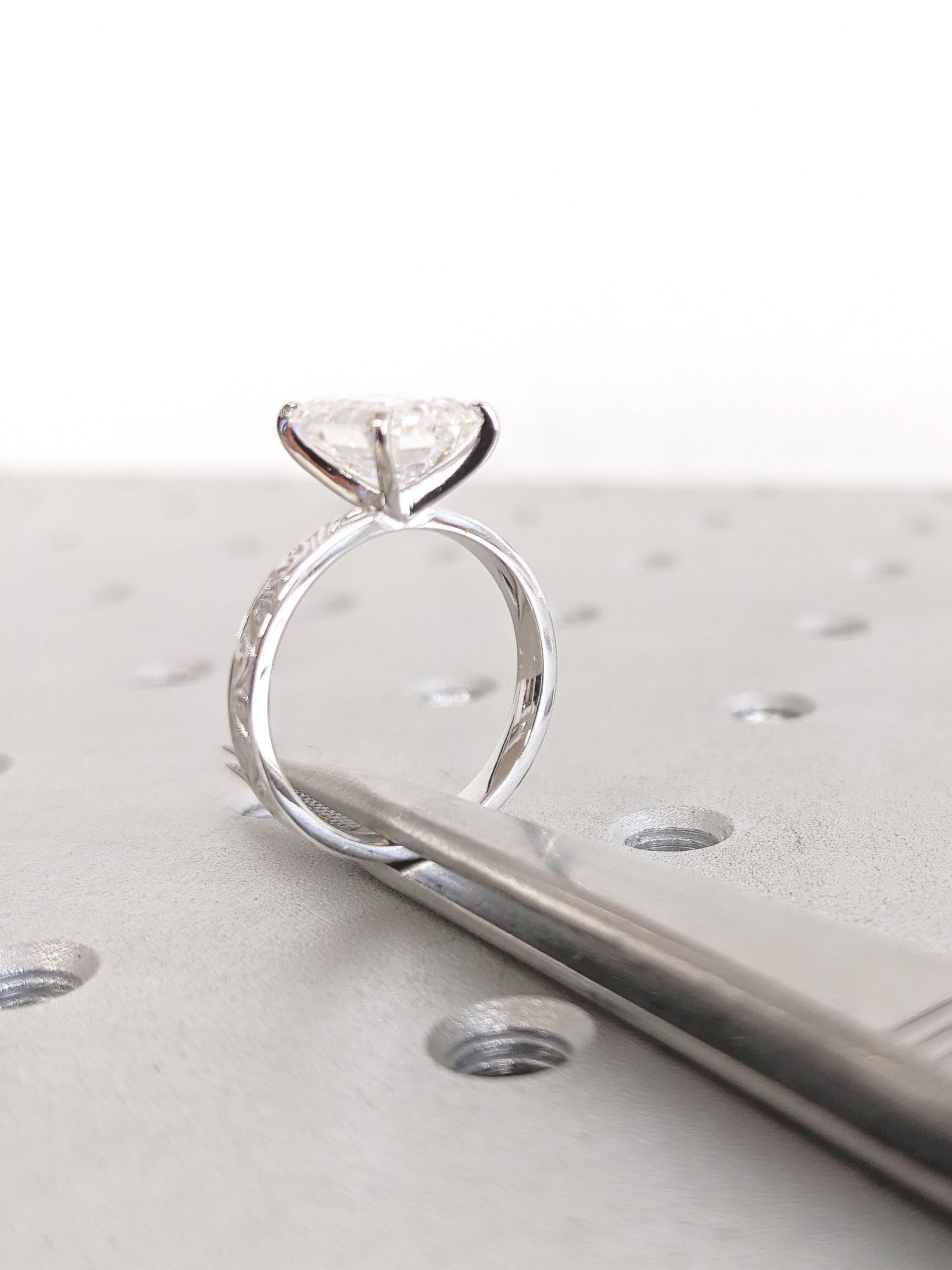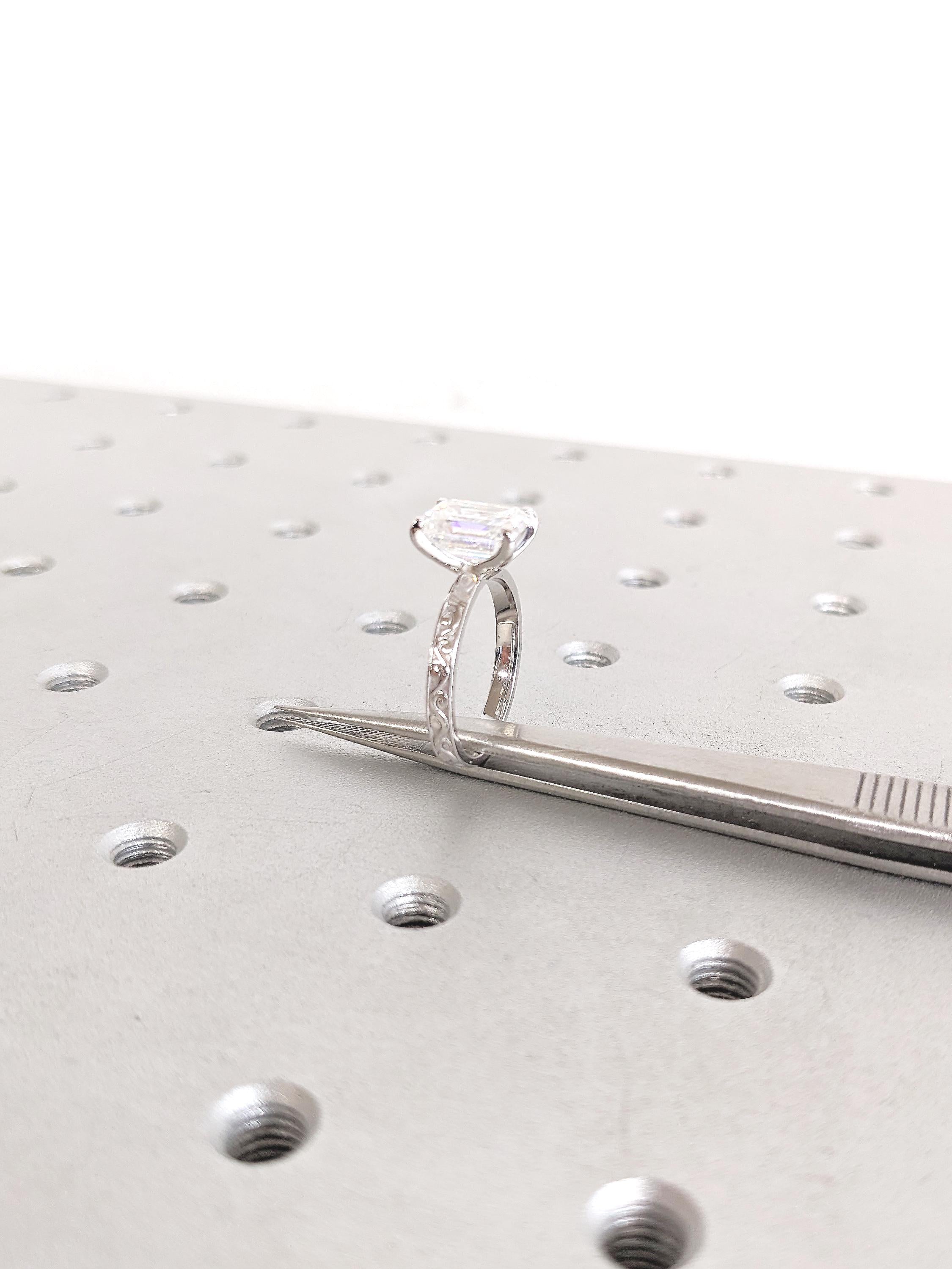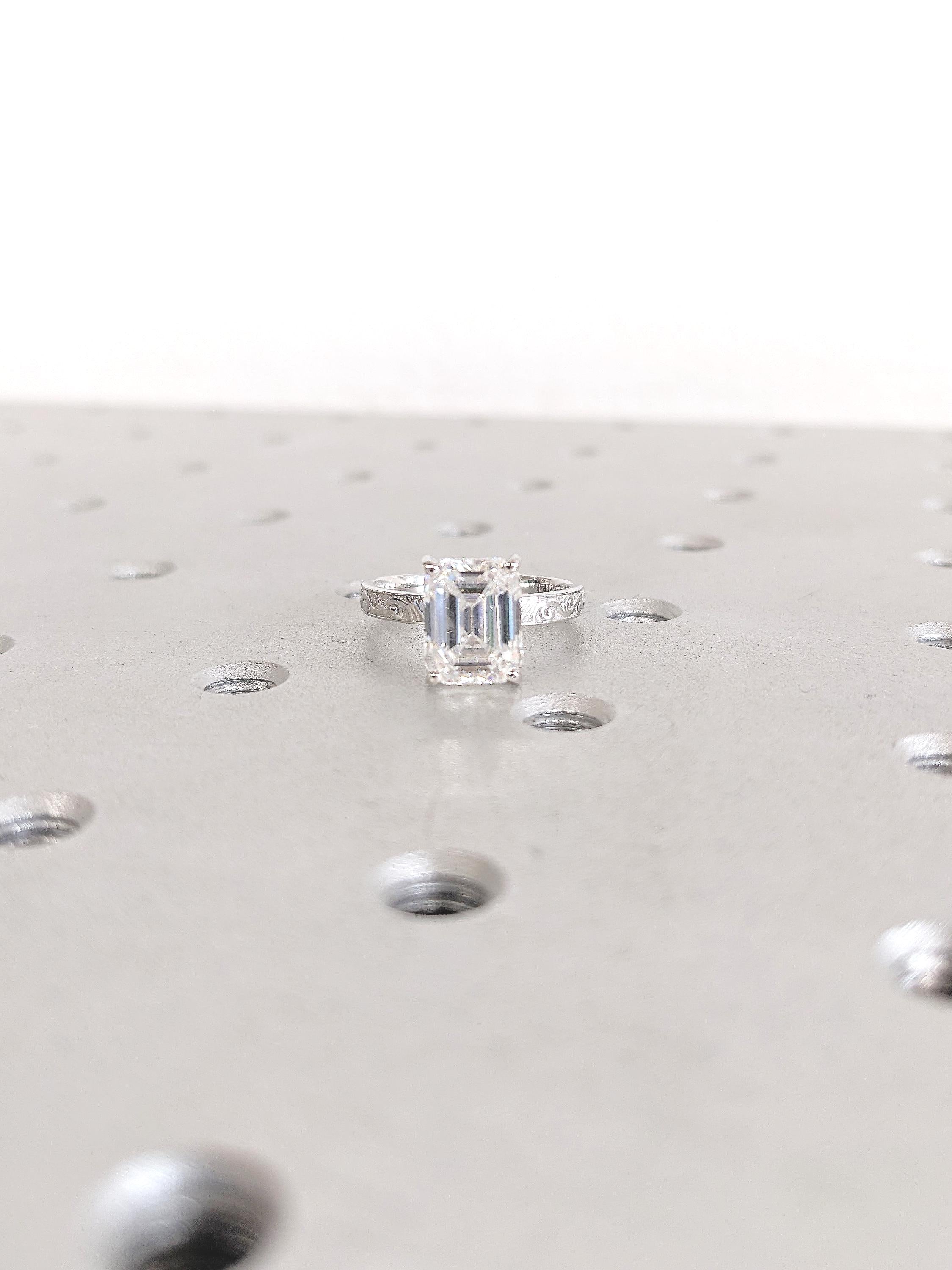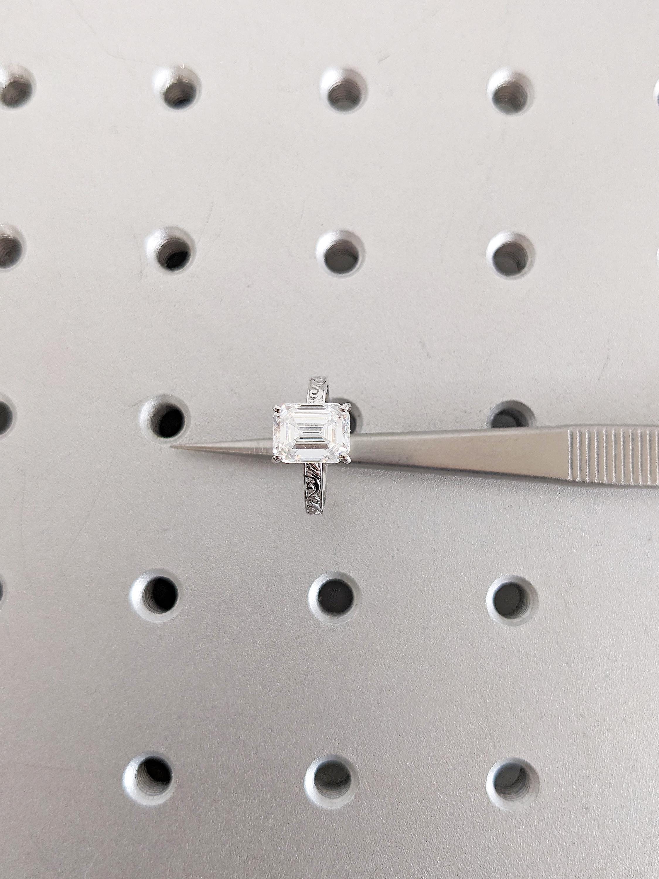 Handcrafted with elegant filigree pattern, this 2.5mm width band features an emerald cut Lab Grown Diamond solitaire set in open gallery style. The perfect balance between minimalist and vintage charm.