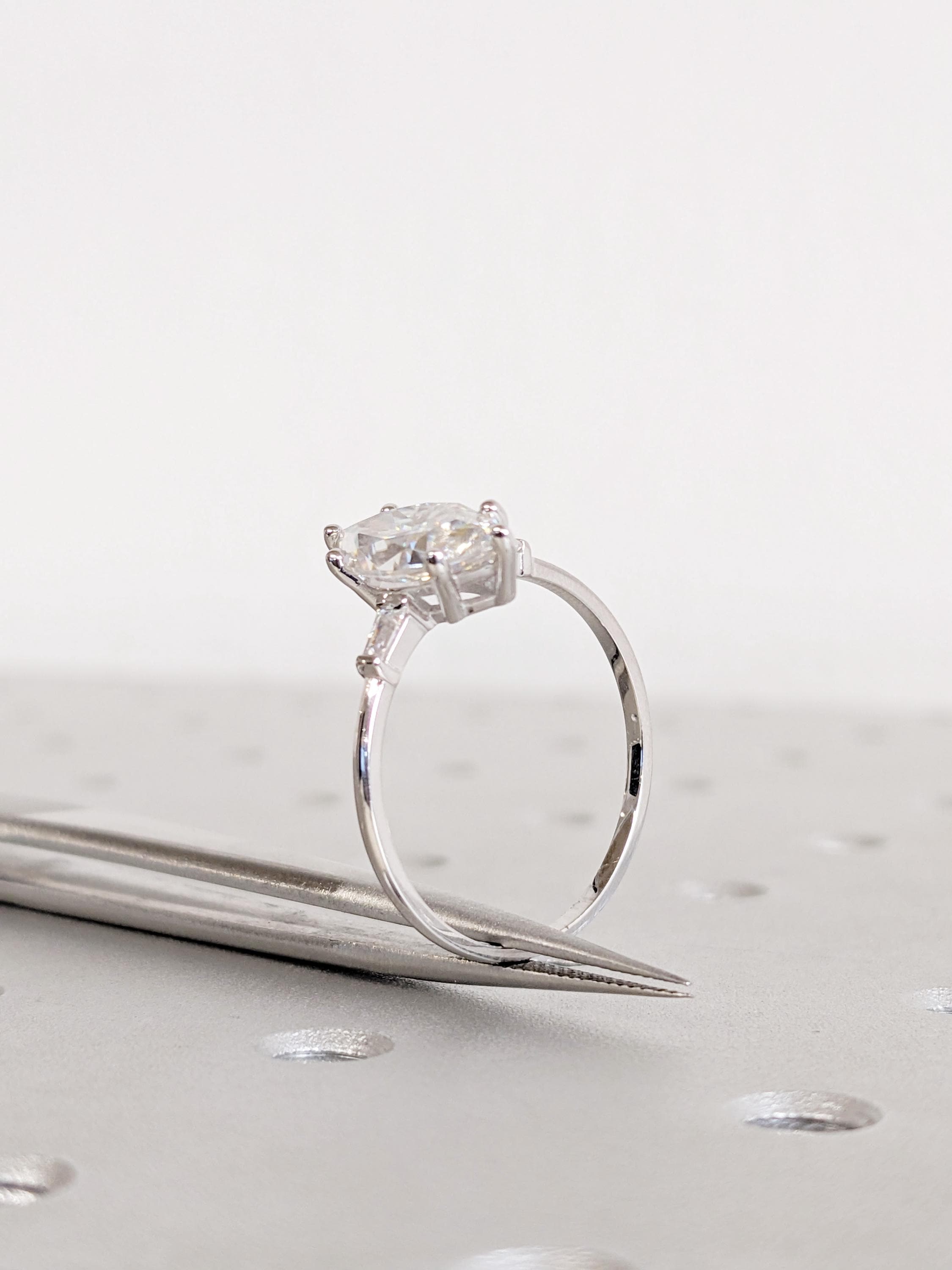 This Lab Diamond engagement ring showcases a brilliant marquise-cut center stone in a prong setting, gracefully accented by tapered baguette side stones of Moissanite or Natural Diamond. The design blends timeless beauty with modern sophistication, making it a stunning choice for an engagement, bridal jewelry, anniversary gift, or an elegant ring for everyday wear
