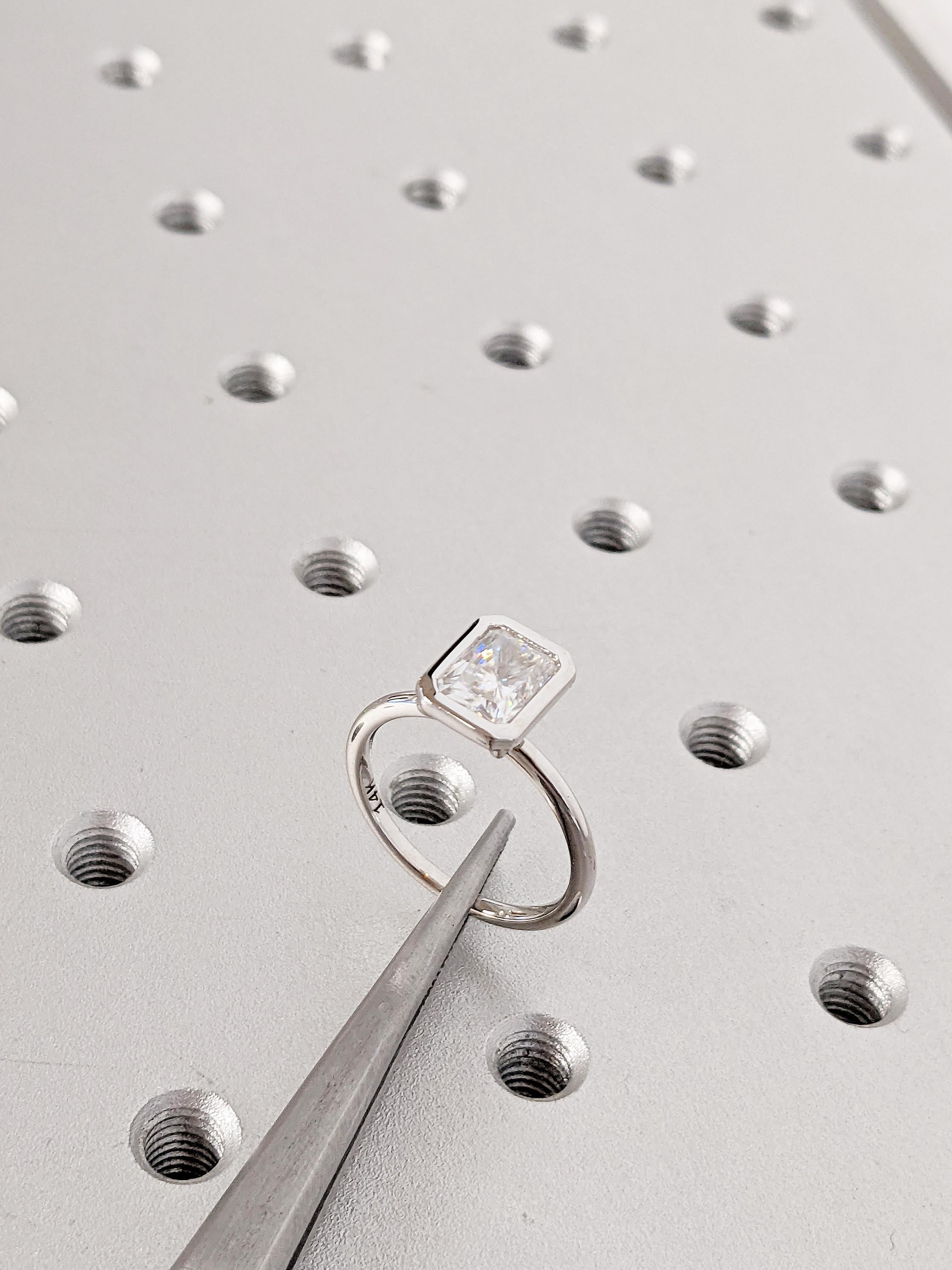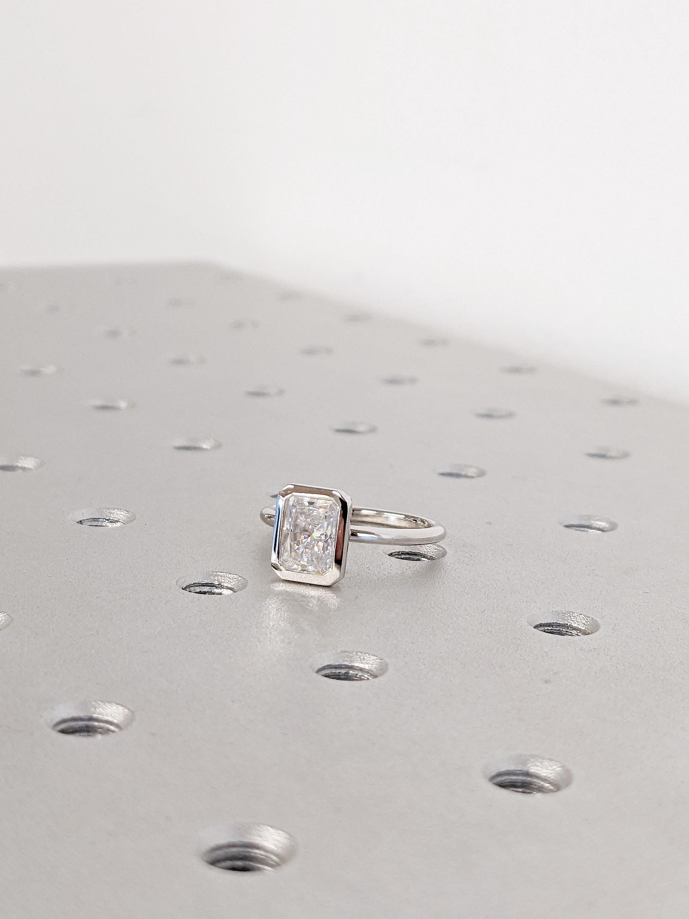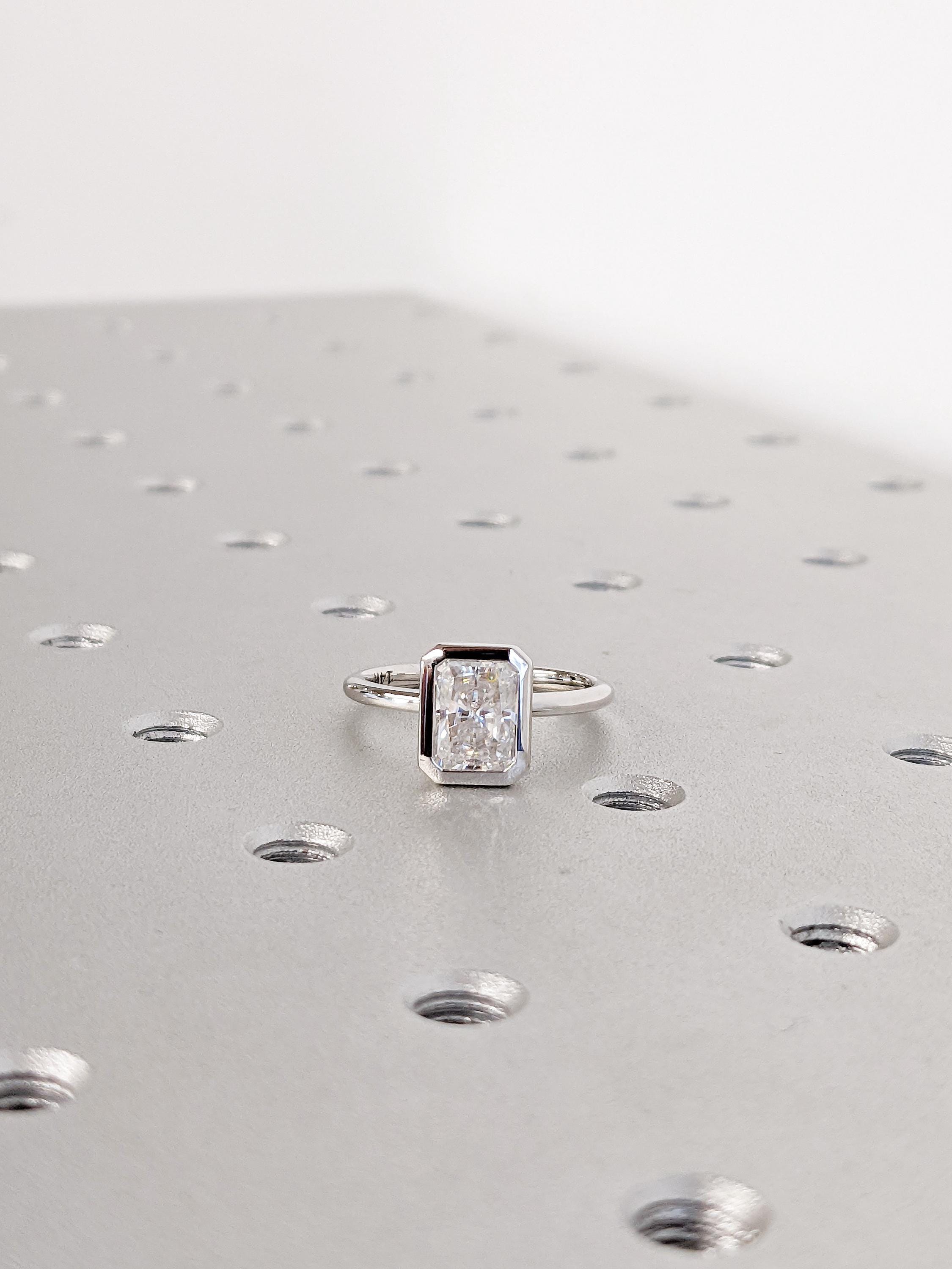 This Lab Grown Diamond engagement ring with radiant cut center stone in a sleek bezel setting creates a refined and modern look. The clean lines highlight the brilliance of the Diamond, offering elegance with durability. This timeless ring is a perfect choice for engagements, weddings, bridal jewelry, anniversaries, or as a sophisticated piece for everyday wear.
