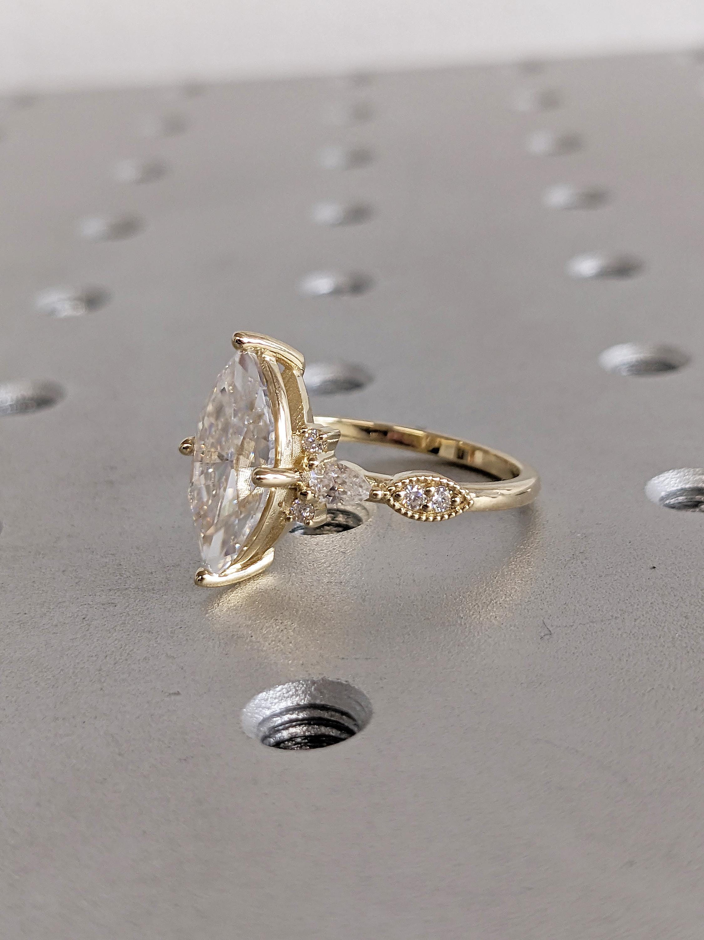A vintage inspired statement ring, features a marquise cut Lab Grown Diamond focal stone, accented by round and pear cut Lab Grown Diamonds. With delicate hand engraved milgrain detailing, this fashionable jewelry effortlessly complements your style for any occasion.