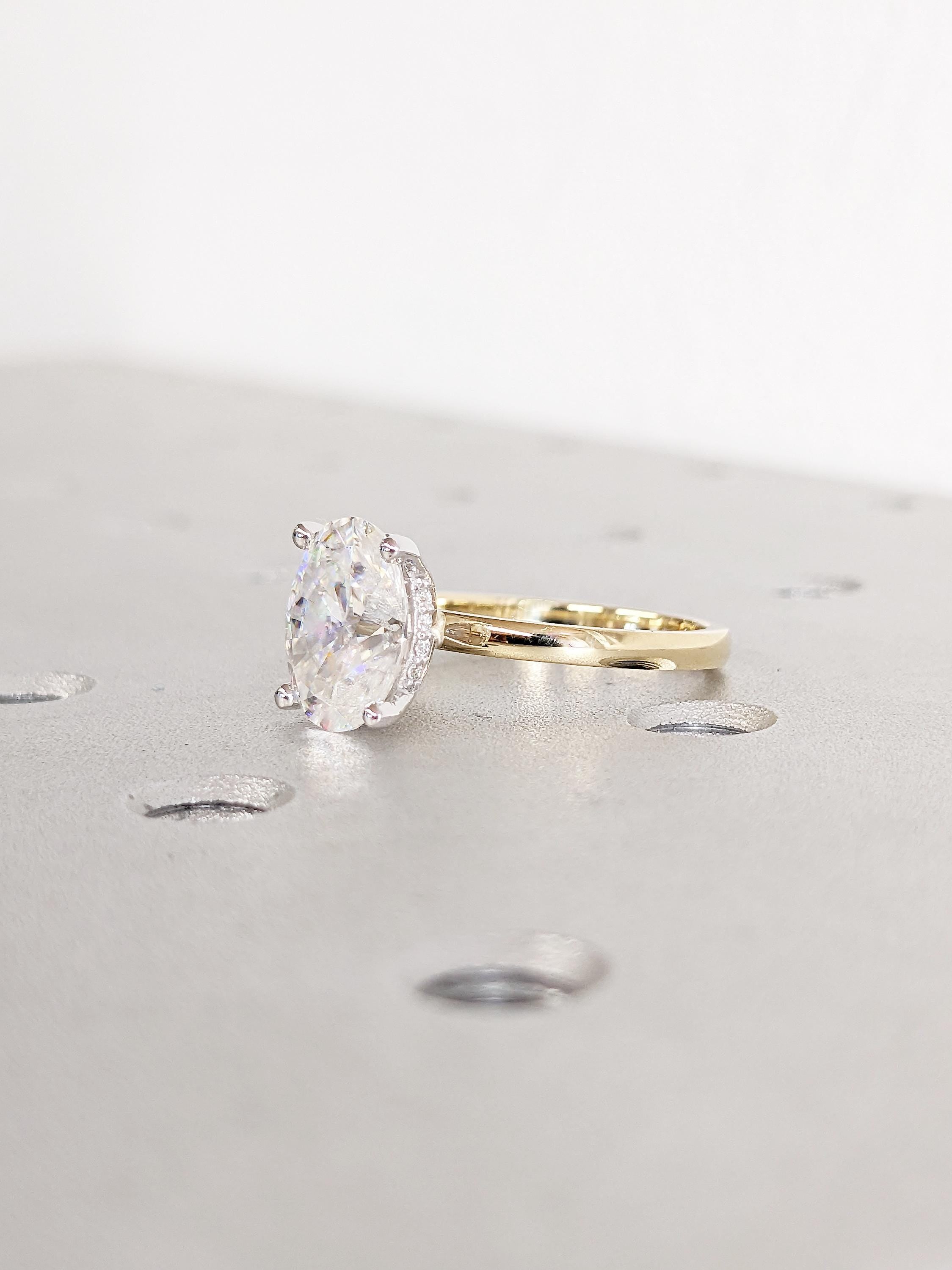 Celebrate your love with this elegant two-tone engagement ring, showcasing a radiant oval-cut Lab Grown Diamond at its center. The stone is securely held in a refined prong setting, accentuated by a hidden halo of shimmering lab grown diamonds that adds a touch of unexpected brilliance. Timeless and sophisticated, this ring is perfect for a wedding, anniversary, or meaningful celebration.